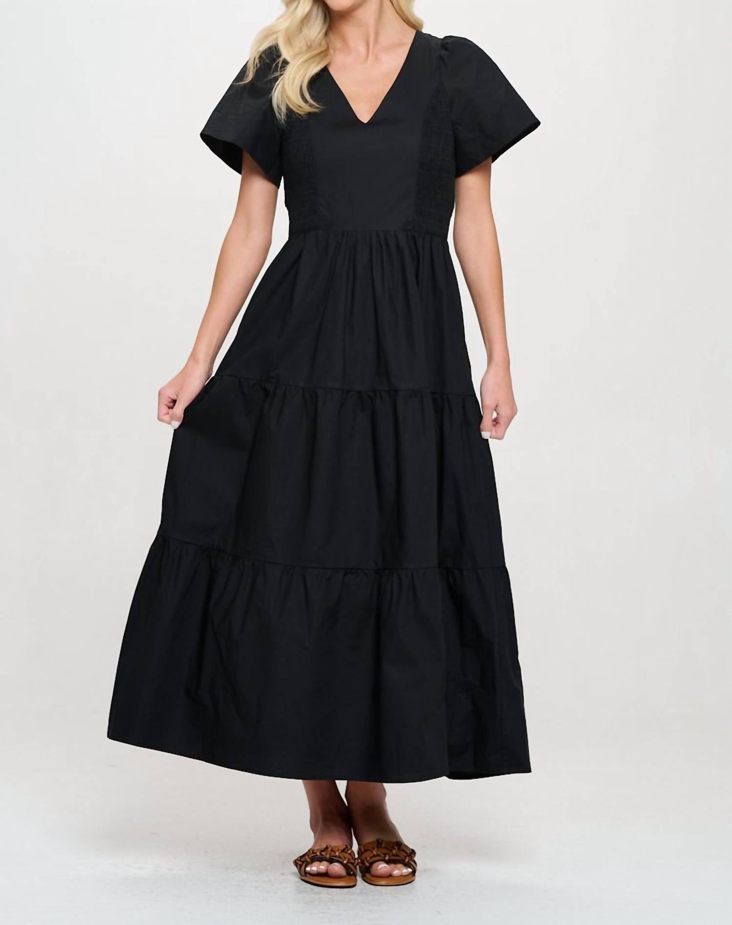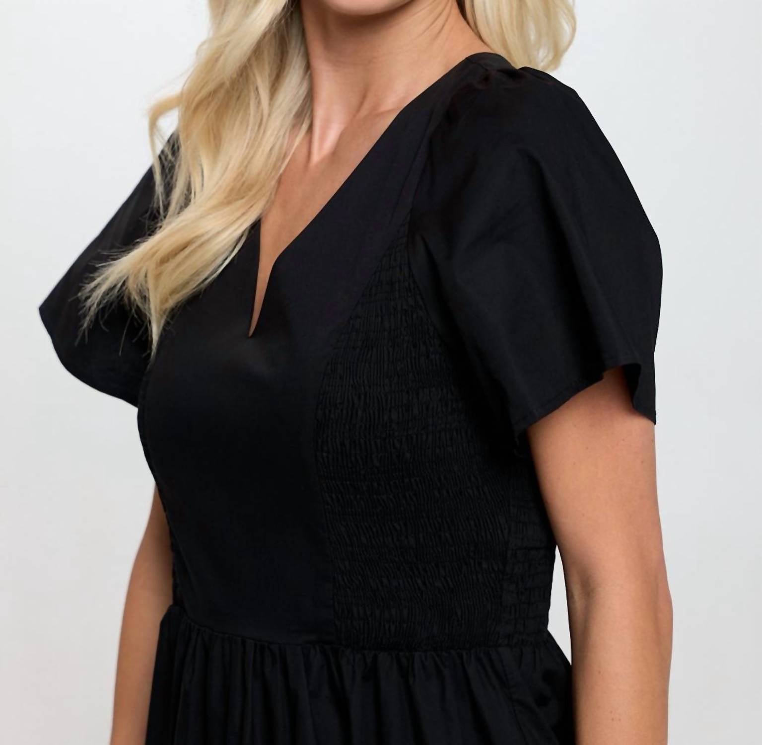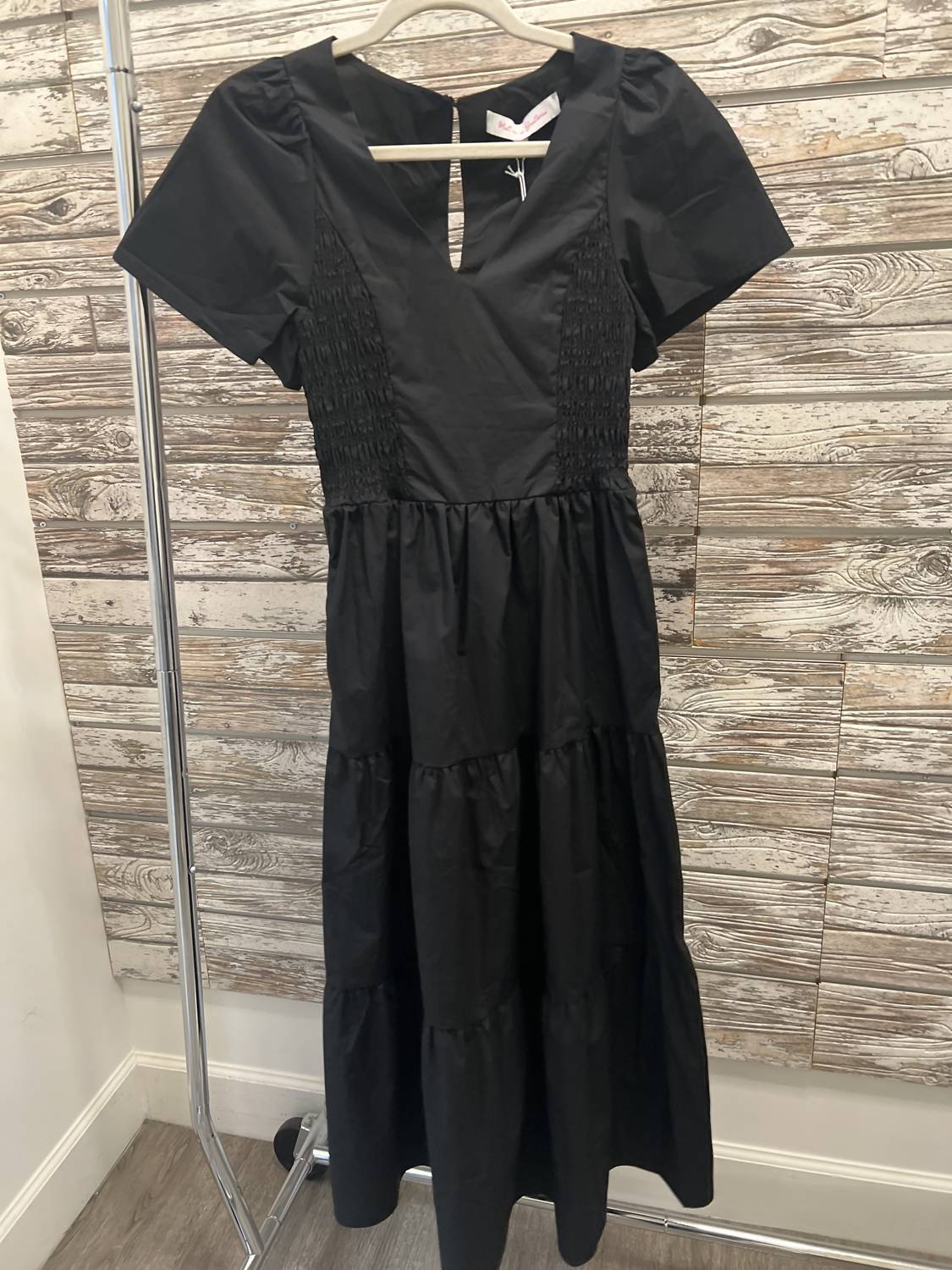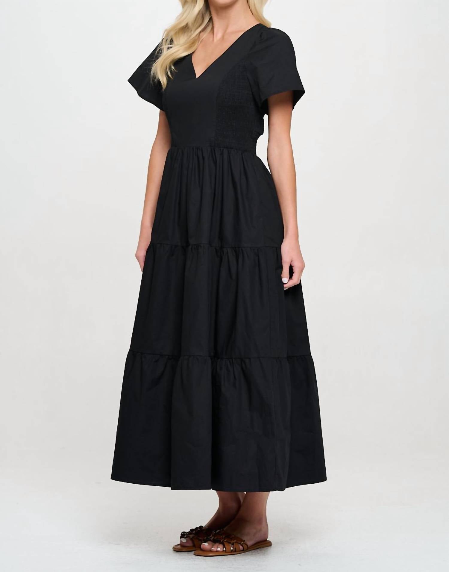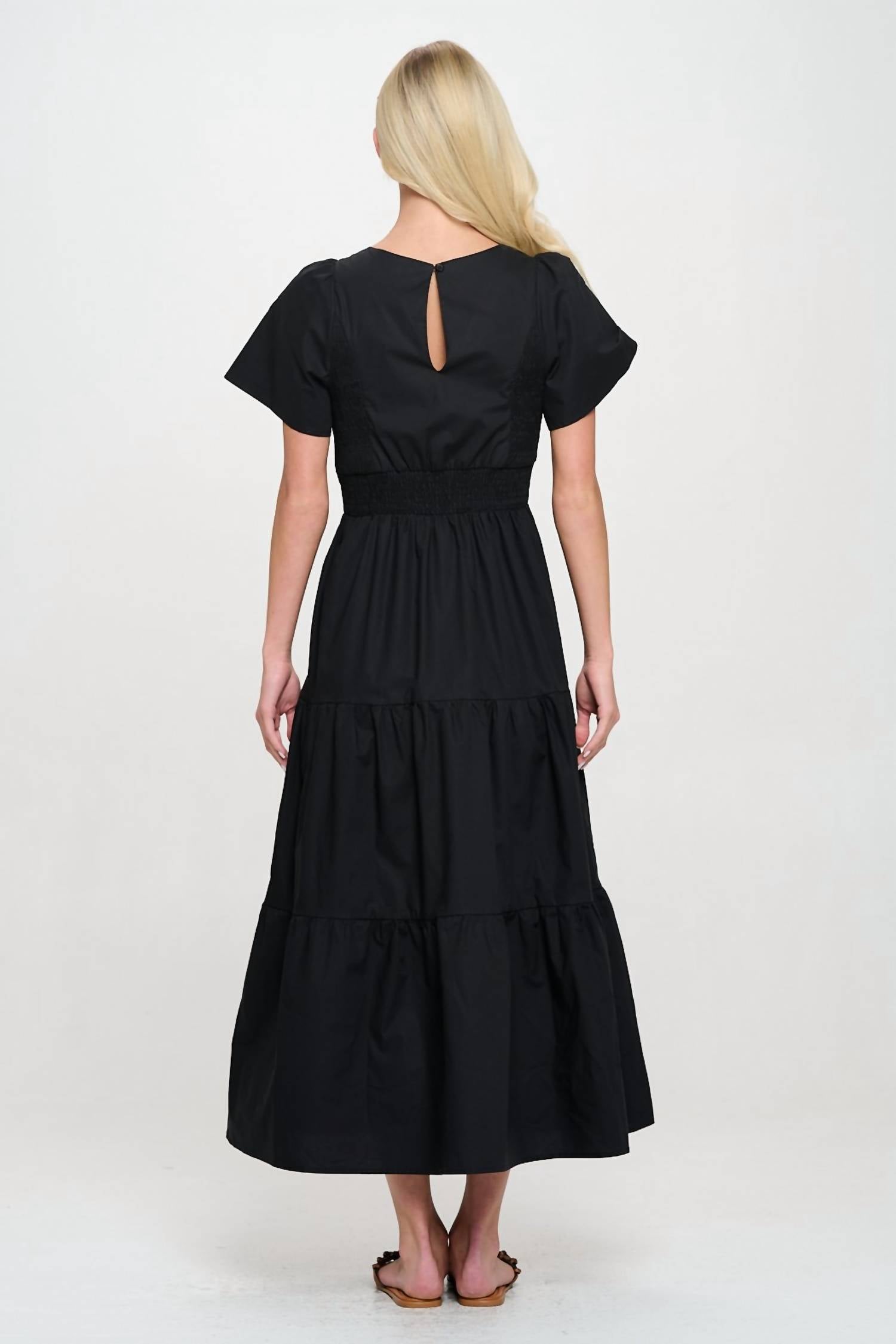 Style this maxi with your favorite statement necklace and sandals for the perfect look. Unveil classic sophistication with the Poplin Side Smock Maxi Dress by Meet Me in Santorini, a must-have for spring festivities. This short sleeve dress is crafted from a breathable cotton blend, featuring a V-neckline and a flattering A-line silhouette. With its pull-on closure, the tiered design and smocked detailing on the sides offer both style and comfort, making it perfect for any holiday party or minimalist trend occasion. Ideal for a range of events, pair this solid black dress with your favorite accessories to make a statement.