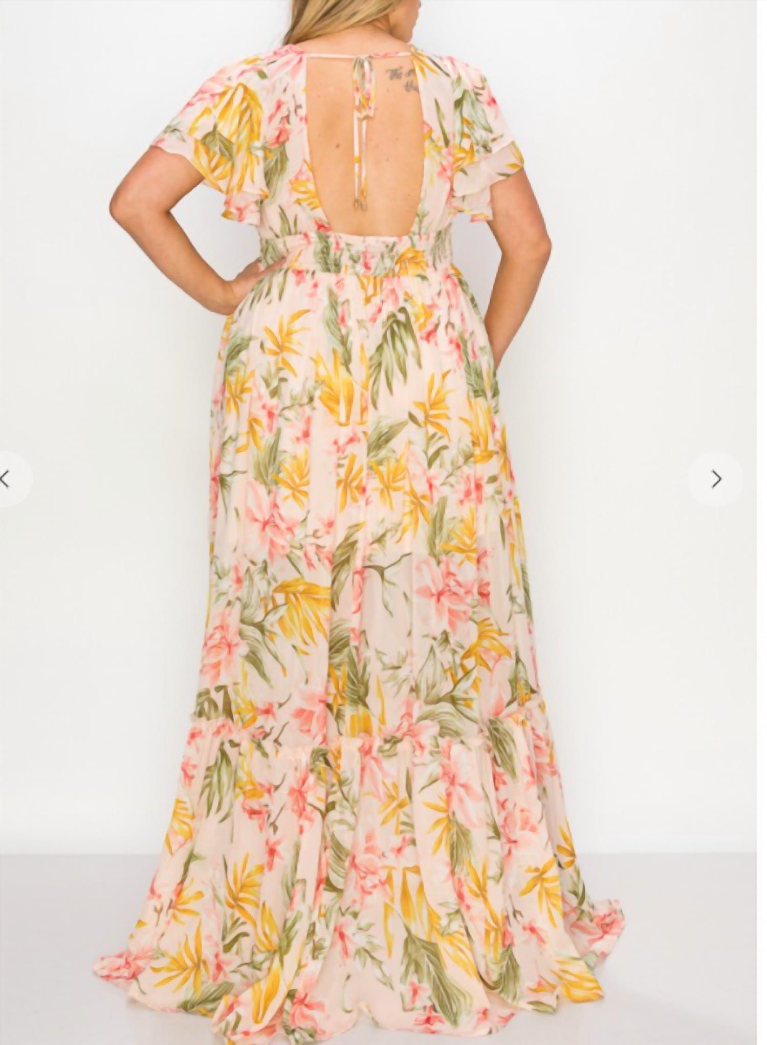 A maxi dress that is just as cute as it is comfortable. Step into elegance with the Miss Avenue Chiffon Short Sleeve Button Down Detail Maxi Dress in Peach Floral, featuring ruffled short sleeves and a graceful empire waist silhouette. Crafted from 100% polyester, this dress combines boho chic style with a timeless v-neckline and a front slit for a touch of allure. Ideal for spring and summer occasions, it includes a built-in slip for added comfort and coverage. This maxi dress secures with a tie closure, ensuring a flattering fit for any holiday party.