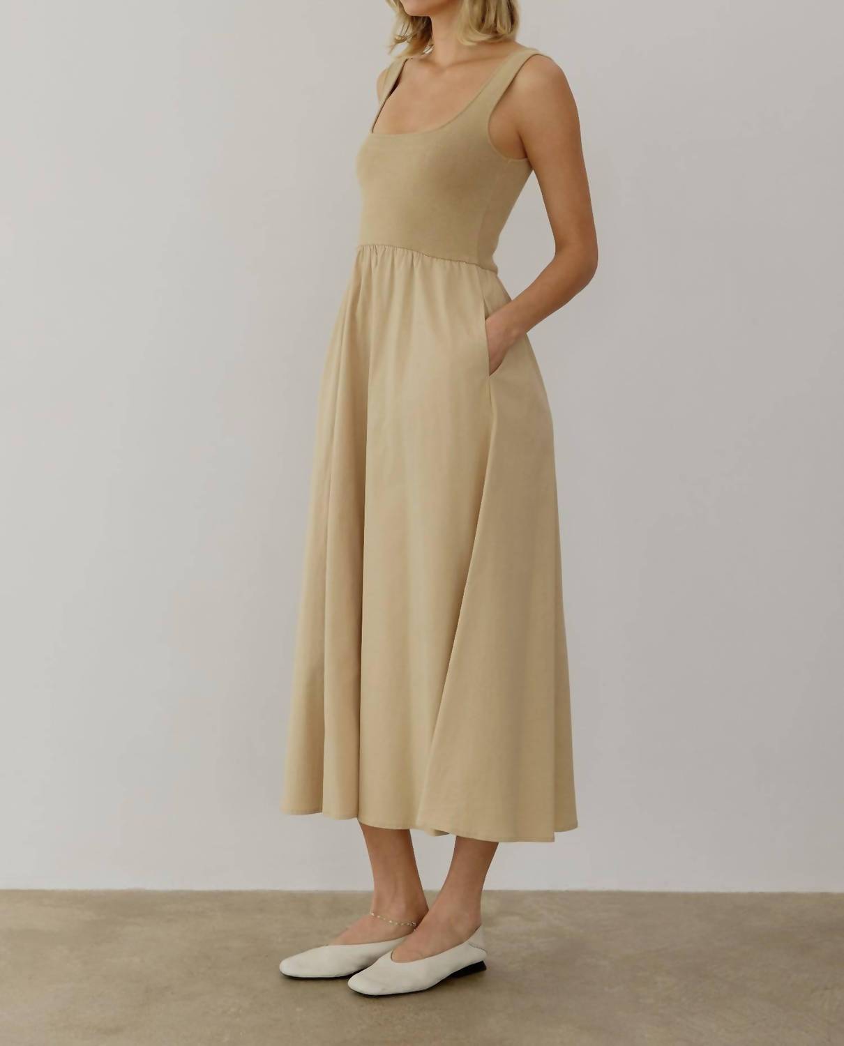 Style this maxi with your favorite statement necklace and sandals for the perfect look. Introducing the Lucinda Tank Top Maxi Dress by MOD REF, a chic and minimalist choice in khaki designed for vacation and spring outings. This sleeveless A-line silhouette features a unique blend with the top made of 100% Viscose and the bottom of 98% Cotton, 5% Spandex, providing a harmonious mix of textures. With a convenient pull-on closure and handy hidden side pockets, it's perfect for an effortless on-the-go look. Model Phoebe, standing at 5'7", wears a size S with measurements: 32" bust, 24" waist.