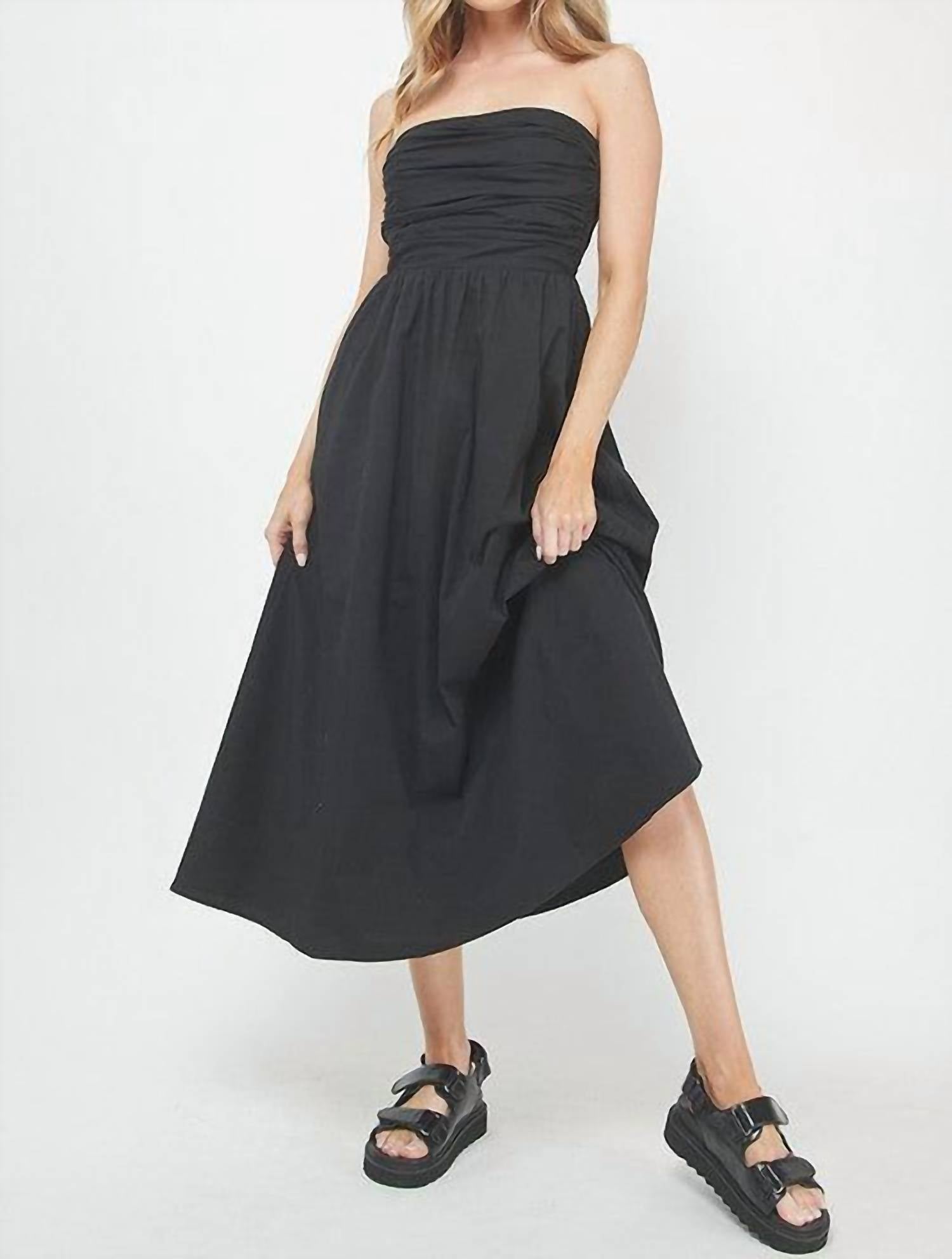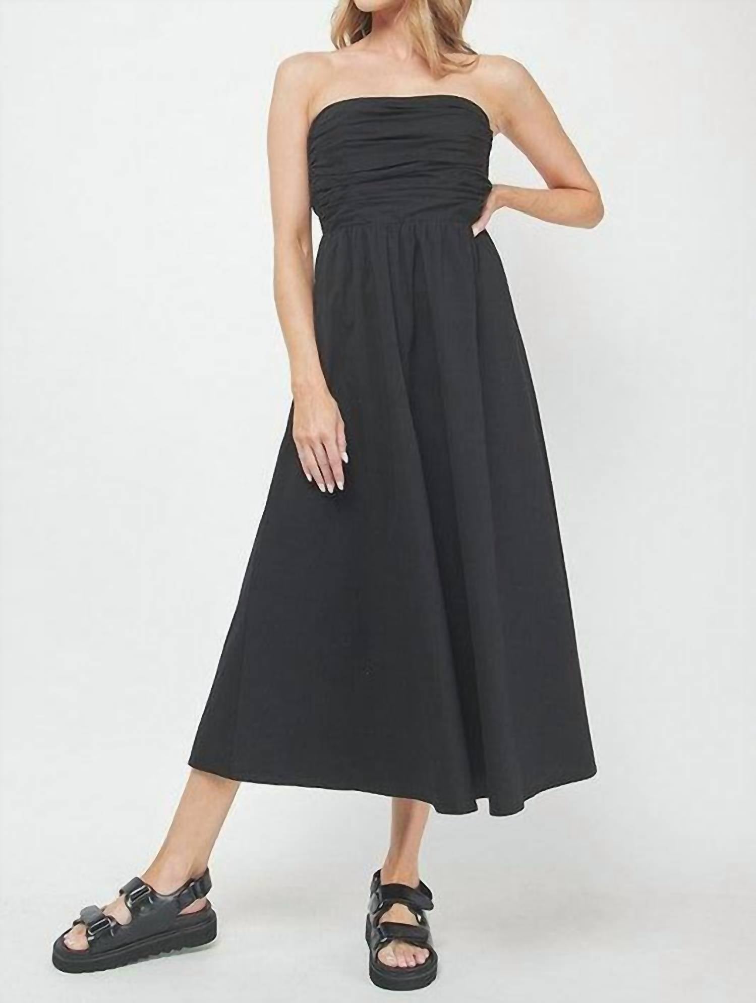 Style this maxi with your favorite statement necklace and sandals for the perfect look. Introducing the Cotton Maxi Dress by Needii, a perfect choice for your summer wardrobe. This black dress features a strapless design with a stylish ruched bodice and a smocked back for a comfortable fit. Made from breathable cotton, it presents an elegant tube top style ideal for both casual outings and holiday parties. With a pull-on closure, care is easy with machine wash instructions.