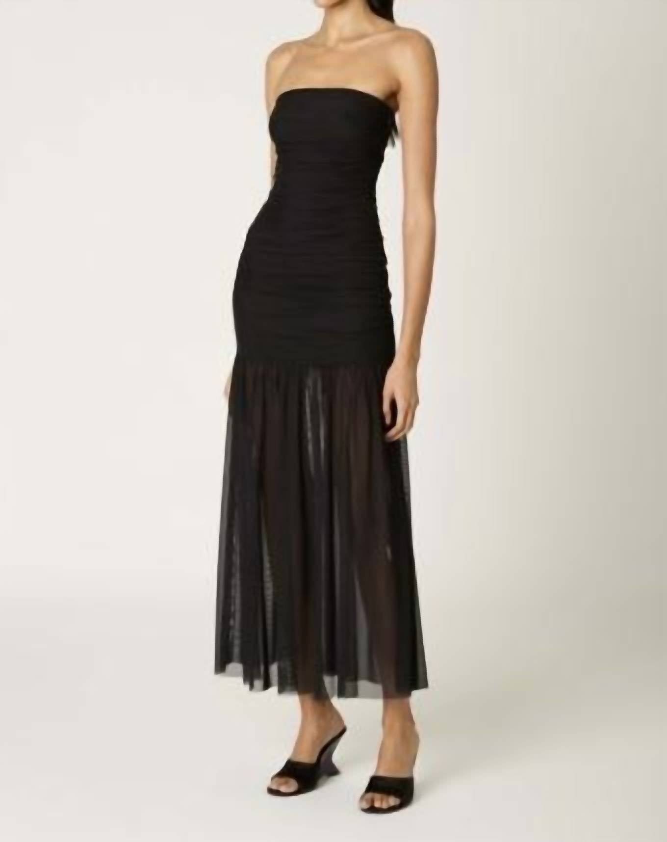 Style this maxi with your favorite statement necklace and sandals for the perfect look. Elevate your vacation style with the Nola Maxi Dress by NIA, a stunning monochrome silhouette perfect for summer escapes. This strapless dress features a fitted column silhouette with a straight, off-the-shoulder neckline and a form-fitting, ruched design through the bust and waist. The flared maxi length hem is enhanced by a semi-sheer mesh overlay for an elegant touch. Made without pockets and finished with a convenient side zipper closure, this dress is fully lined and should be dry cleaned to maintain its pristine condition. Ideal for special occasions like Valentine's Day.