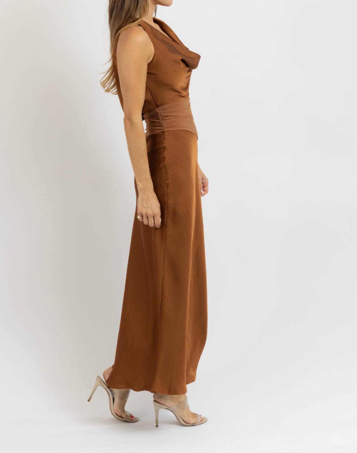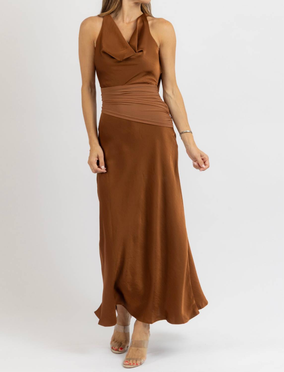 Who doesn't love a good maxi dress? This one you'll be reaching for season after season. Introducing the Stella Cowl Back Dress by One & Only, designed for captivating elegance at any holiday party. This sleeveless sheath maxi dress boasts a halter neckline and comes in a chic brown shade with a solid pattern. Expertly crafted from 90% Polyester and 10% Spandex, it features a lined bust, mesh waist detail, cowl back, and a tie closure for a refined finish. Model Naomie is 5'8" and wears a size XS, perfect for those seeking quiet luxury this summer.