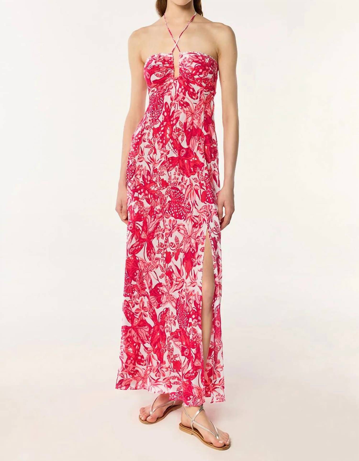 Who doesn't love a good maxi dress? This one you'll be reaching for season after season. Embrace the Boho Chic vibe. Crafted from LENZING ECOVERO viscose for a sustainable touch. Showcases a bias-cut skirt with front slits, a heart-shaped gathered top, and a U-shaped metal chest support. Intricate details include zigzag lace trimming and a cut-out waist with decorative back ties, offering a unique artisanal finish. Tie closure. Perfect for a beach day in the summer and ideal for Easter celebrations.