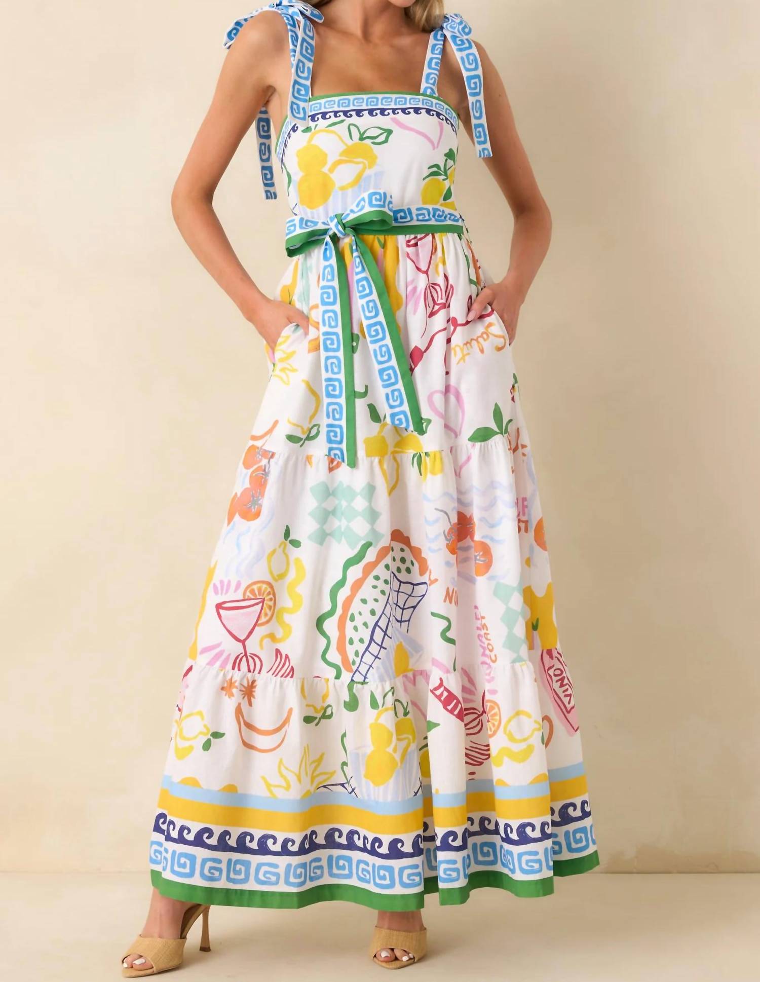 A maxi dress that is just as cute as it is comfortable. Embrace summertime elegance with the Gemma Maxi Dress by Prosperina, featuring a sleeveless design in the vibrant Summer Spritz print. This A-line dress comes with a square neckline and adjustable self-tie bow straps, and it's thoughtfully crafted with a back smocked panel, hidden zip closure, and functional pockets. Its composition of 55% Linen and 45% Cotton, fully lined with 100% Cotton, ensures comfort and style. Manufactured in China, it requires hand washing with cold water and mild detergent, avoiding bleach for longevity.