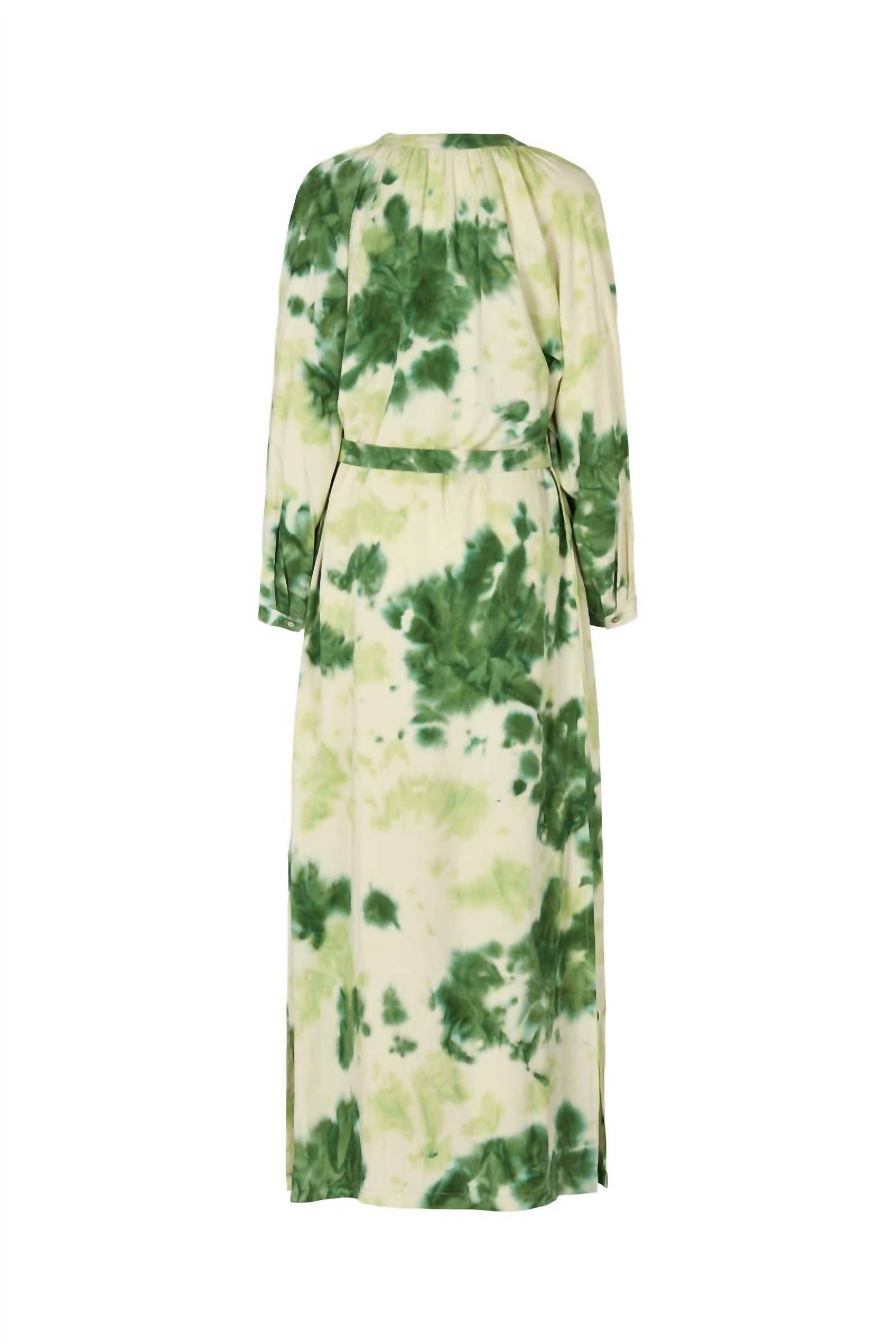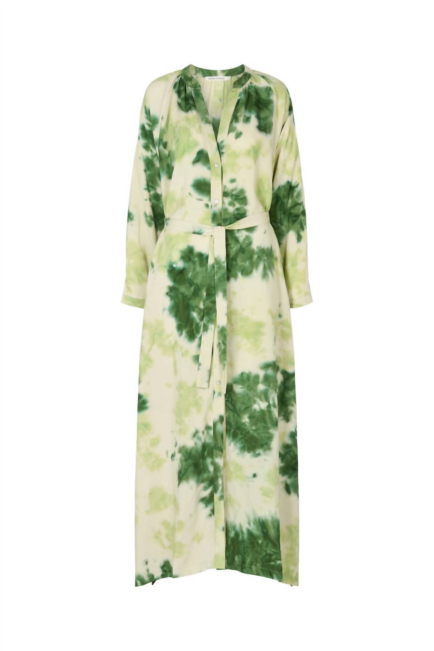 A maxi dress that is just as cute as it is comfortable. Introducing the Ingela Fusion Shirt Dress by Rabens Saloner, a stunning embodiment of modernity and traditional craft. This piece showcases a long sleeve design crafted from 100% Lyocell, ensuring breathability and comfort. The midi-length garment, highlighted in an emerald green and ivory tie-dye pattern, features a flattering V-neckline and a button closure for easy wear. Handmade in Bali, the dress embodies an adventurous eclecticism and is perfect for a chic boho look this fall.