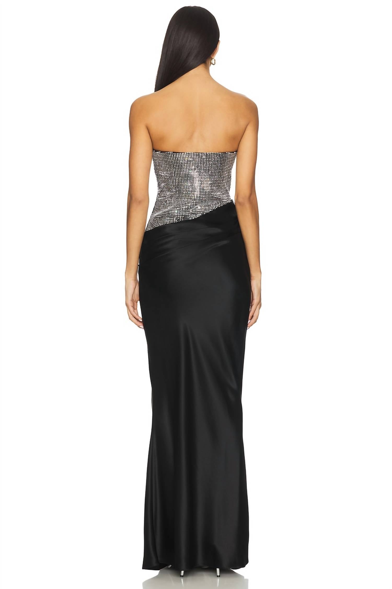 Who doesn't love a good maxi dress? This one you'll be reaching for season after season. Step into elegance with the Alexandra Dress by RETROFETE, an exquisite strapless maxi silhouette designed in striking black and silver. Crafted from 76% Acetate and 24% Polyester, this gown showcases allover crystal embellishments that gleam with every movement. It features a sleek sheath shape with a side zipper closure, perfect for making a statement at any evening event. Care instructions include hand washing to preserve the dress's quiet luxury and textured allure.