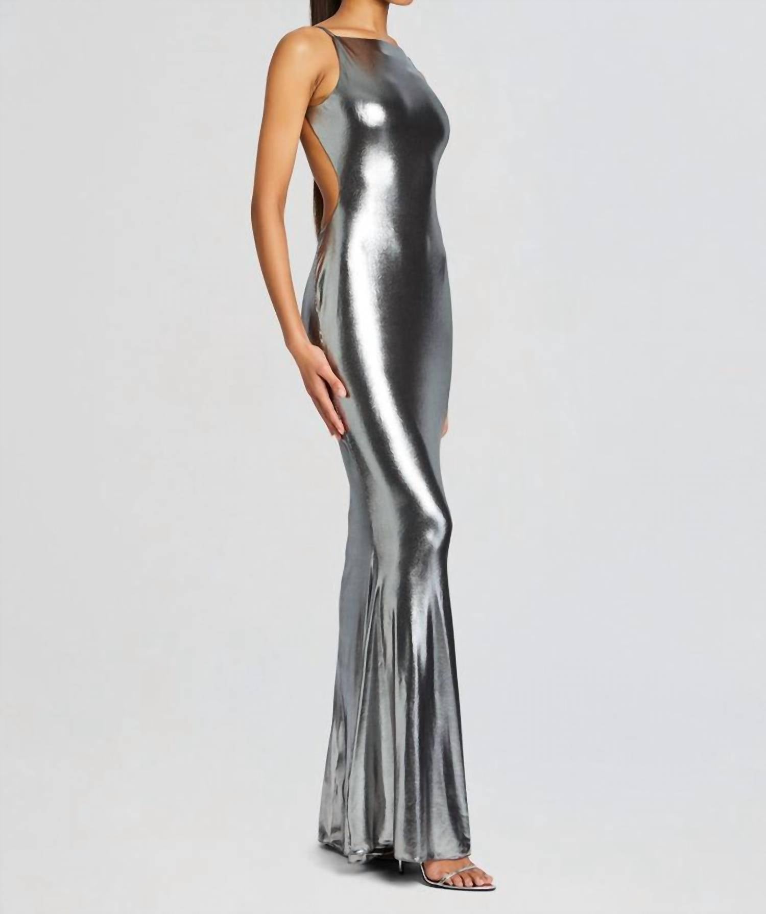 Who doesn't love a good maxi dress? This one you'll be reaching for season after season. Make a dazzling entrance with the Romilly Metallic Open-back Evening Dress by RETROFETE, a statement piece in a luxurious gunmetal hue. This sleeveless maxi dress features a mermaid silhouette with an alluring open back and a collar neckline, perfect for a glamorous soirée. Its composition combines 92% Polyester and 8% Spandex, ensuring a comfortable yet elegant fit. Made in China with a secure zip closure, this dress requires dry cleaning for care. Model is 5'10" wearing size S.