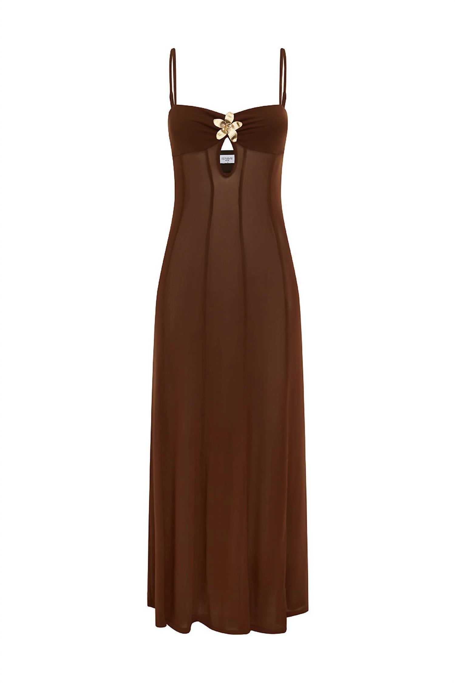 Who doesn't love a good maxi dress? This one you'll be reaching for season after season. Introducing the Tisha Maxi Dress And Bella Brief by Runaway the Label, a chic ensemble designed for the modern fashionista. This espresso-colored masterpiece features adjustable spaghetti straps and a sweetheart neckline, offering a flattering A-line silhouette that fits true to size. The dress, made from 97% polyamide and 3% spandex for the body and 95% polyester and 5% spandex for the lining, includes a sheer maxi length with briefs for stylish coverage. Closure: Slip-on style. Care: Hand wash as per care tag instructions. Perfect for vacation or any maximalist occasion, this dress embodies springtime elegance.