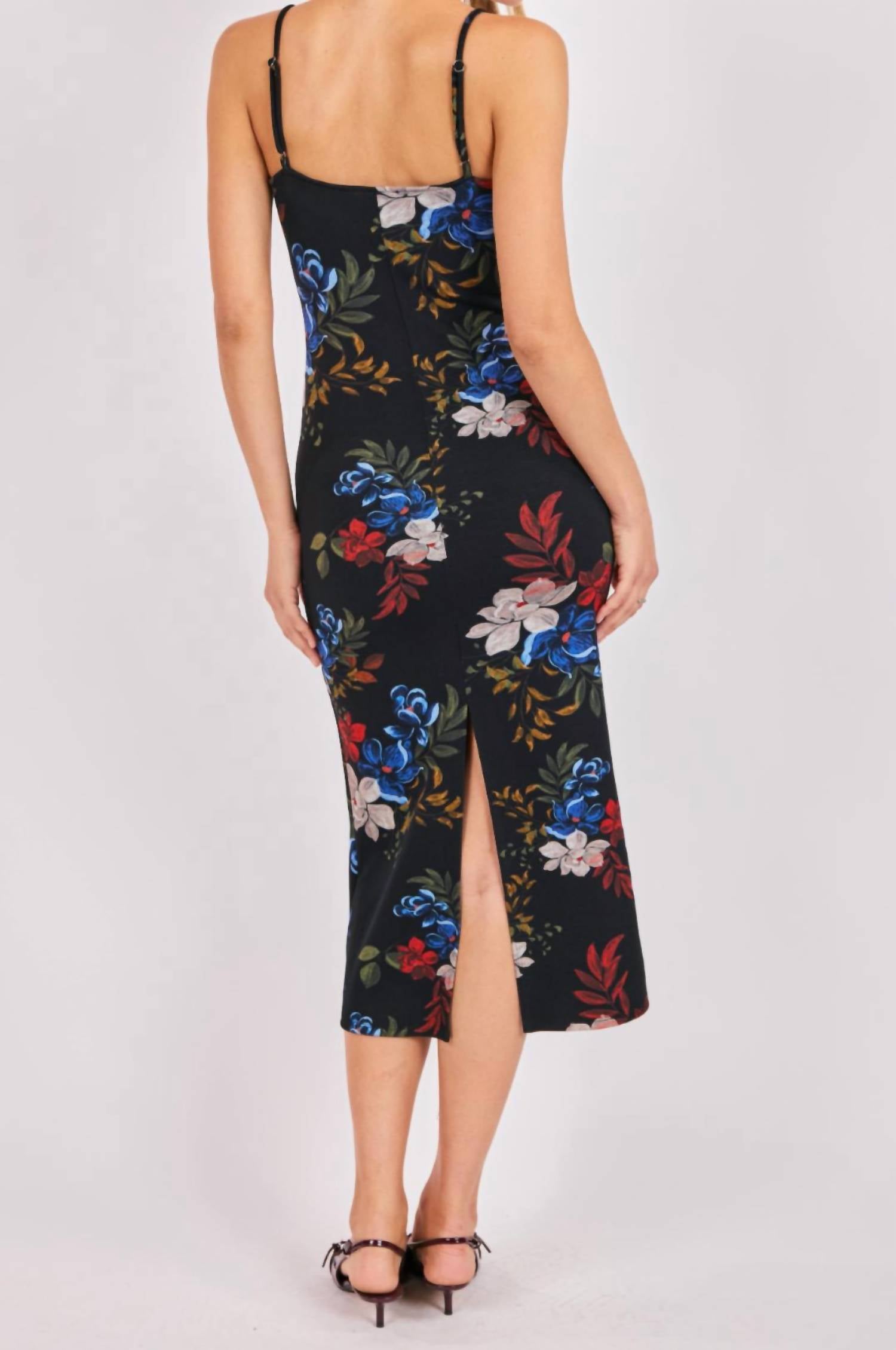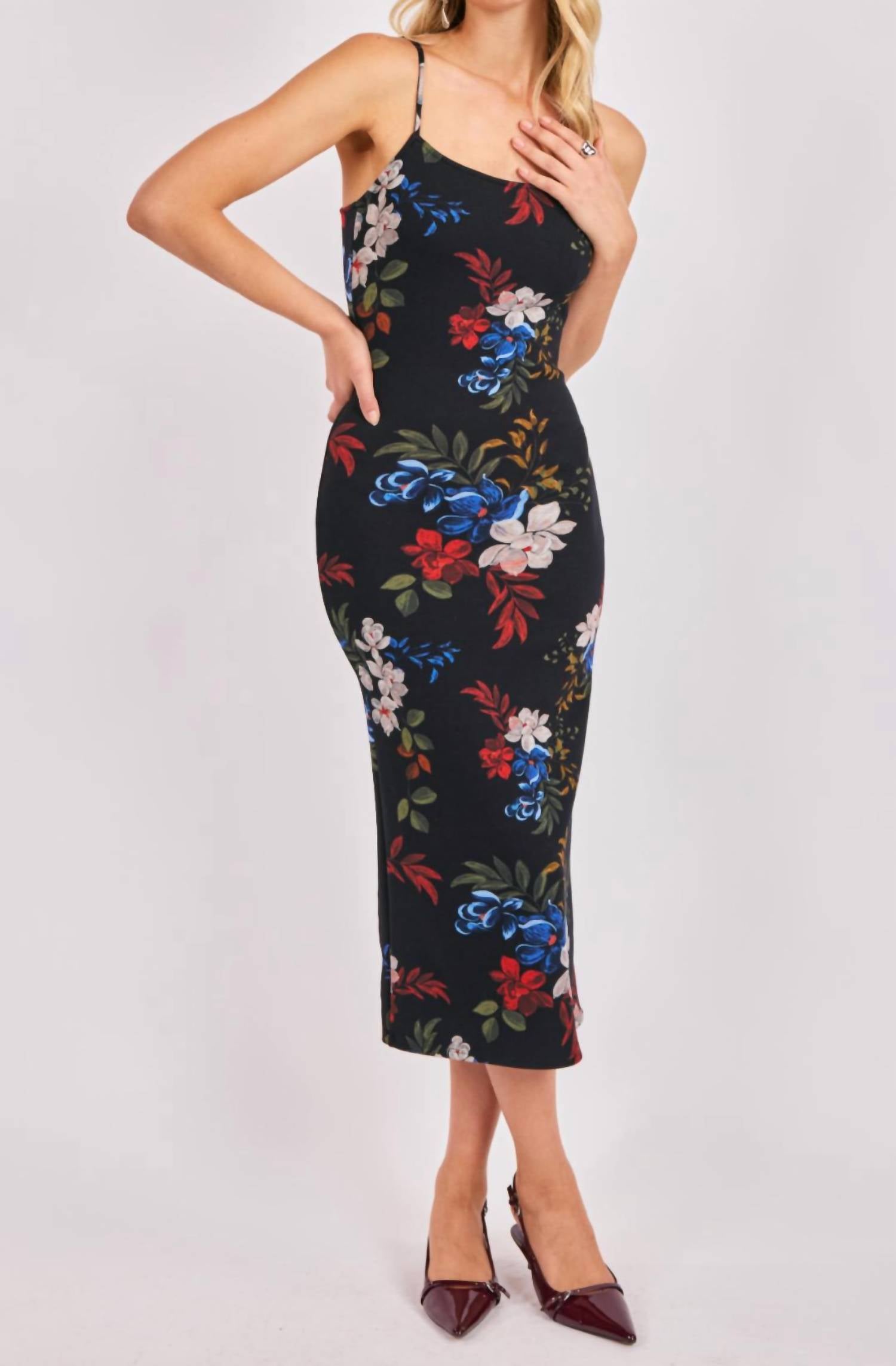 Who doesn't love a good maxi dress? This one you'll be reaching for season after season. Introducing the Four Seasons Stretch Maxi Dress by Sadie and Sage, a must-have for embracing floral charm with cozy fall vibes. Designed with elegant spaghetti straps, this dress features a flattering bodycon silhouette with a scoop neckline, ideal for effortless style. Crafted from a blend of 51% polyester, 45% rayon, and 4% elastane, it offers a stretchy fit with a chic back slit. Care instructions include washing in a machine and laying flat to dry. Model is 5’7” and is wearing a size Small.