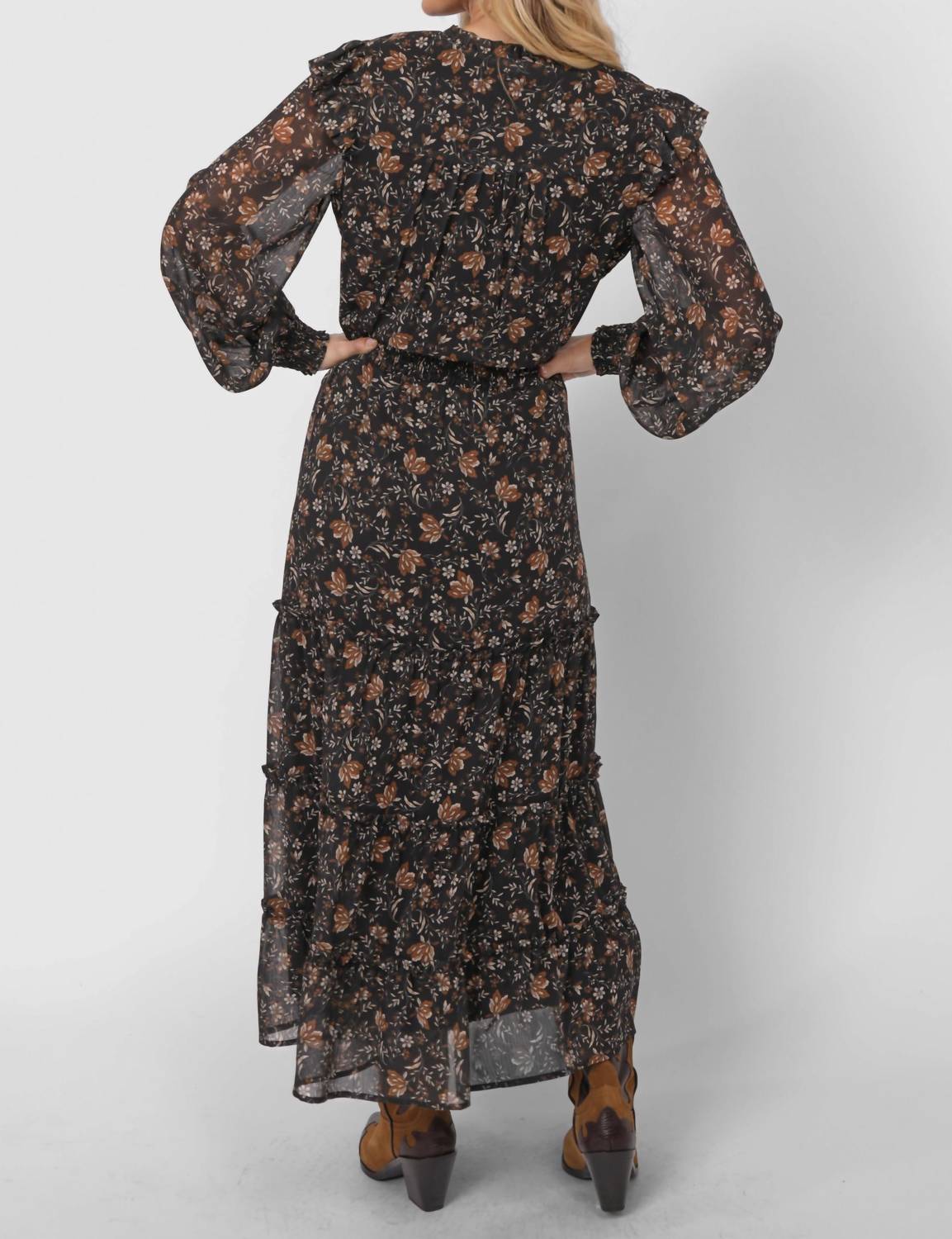 Style this maxi with your favorite statement necklace and sandals for the perfect look. Elevate your evening wardrobe with the Timeless Tiered Maxi Dress by SAGE THE LABEL, a stunning piece in black adorned with a floral pattern. This dress features long sheer sleeves with smocked cuffs, a ruffle trim split V-neck, and a flattering smocked waist, complemented by a pull-on closure for convenience. The non-stretch woven fabric, crafted from 100% polyester, ensures comfort with a 92% polyester and 8% spandex lining. Care is made easy with machine wash cold and line dry instructions.