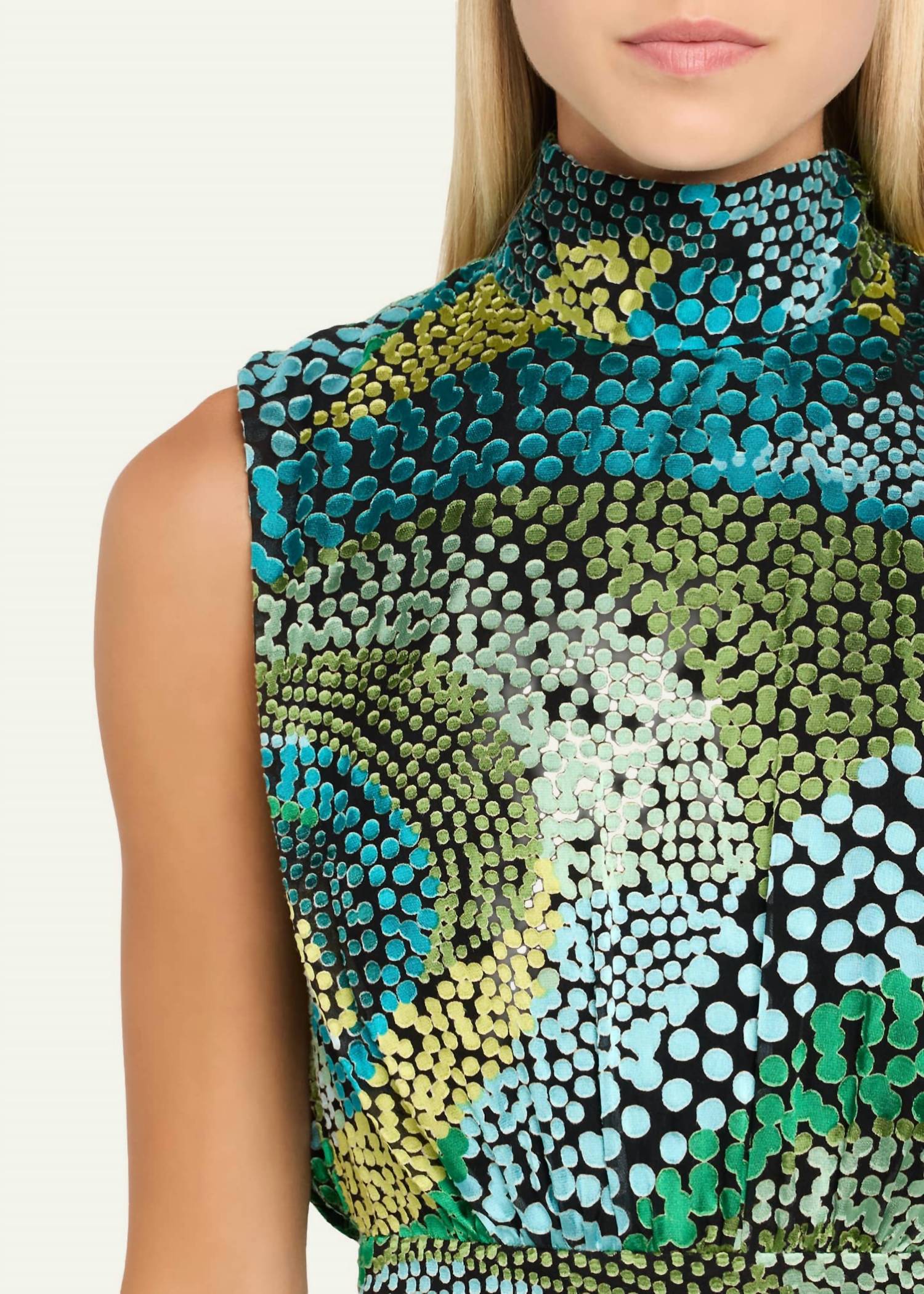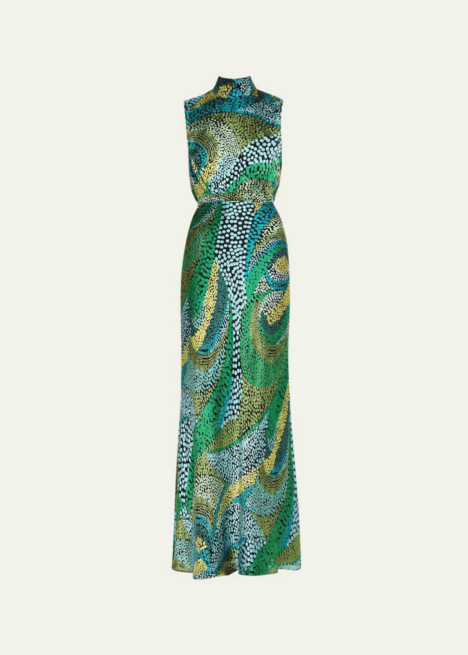 A maxi dress that is just as cute as it is comfortable. Elevate your evening attire with the Saloni "Fleur" Printed High-neck Dress, a striking piece in a jungle abstract print. Crafted from a luxurious blend of viscose and silk, this sleeveless maxi dress features an A-line silhouette for timeless elegance. Designed with a high neckline and full length, it fastens with a center back zip. Originating from imported craftsmanship, it requires dry cleaning to maintain its exquisite fabric.