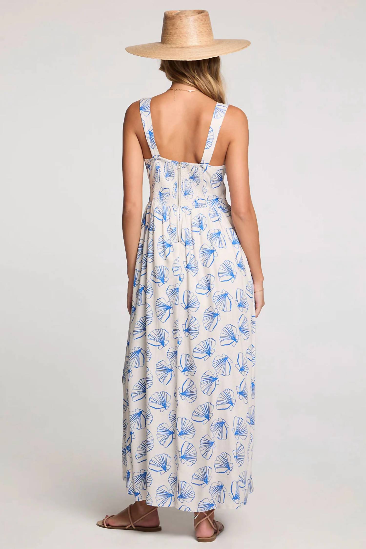 A maxi dress that is just as cute as it is comfortable. Elevate your wardrobe with the Saltwater Luxe Hayley Midi Dress, a stunning sleeveless piece perfect for summer occasions. Crafted from a luxurious blend of 70% Rayon and 30% Linen, this slip dress features a playful ocean-colored seashell print that evokes Art Deco charm. The dress showcases a scoop neck, textured gathers for a flattering fit, and a stylish high slit, secured with a zip closure. For maintenance, simply machine wash cold to keep this statement piece in excellent condition.