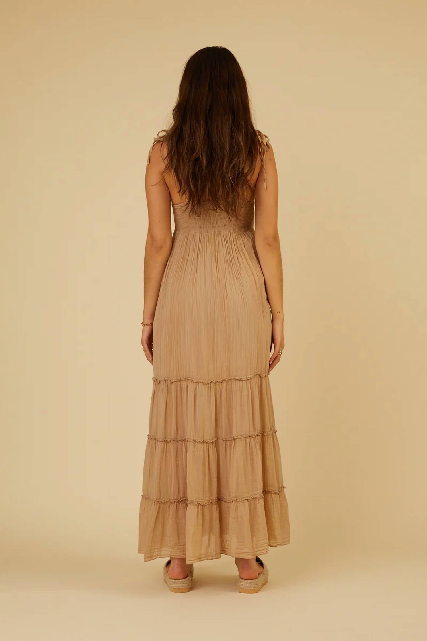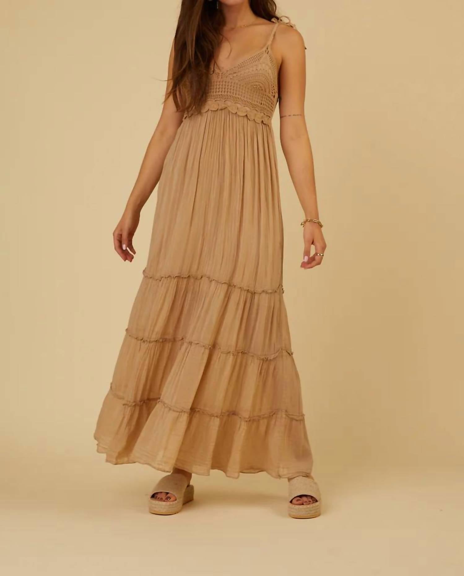 Who doesn't love a good maxi dress? This one you'll be reaching for season after season. The Alisha Dress by Scandal Italy is a taupe maxi dress perfect for a 90s fashion-inspired summer vacation. This women's dress features a crochet bodice with spaghetti straps and a V-neck, exuding casual elegance. With an empire waist silhouette, the dress unfolds into a fully lined three-tiered skirt, offering both comfort and style. Originating from Italy, the Alisha Dress is a chic addition to any wardrobe.