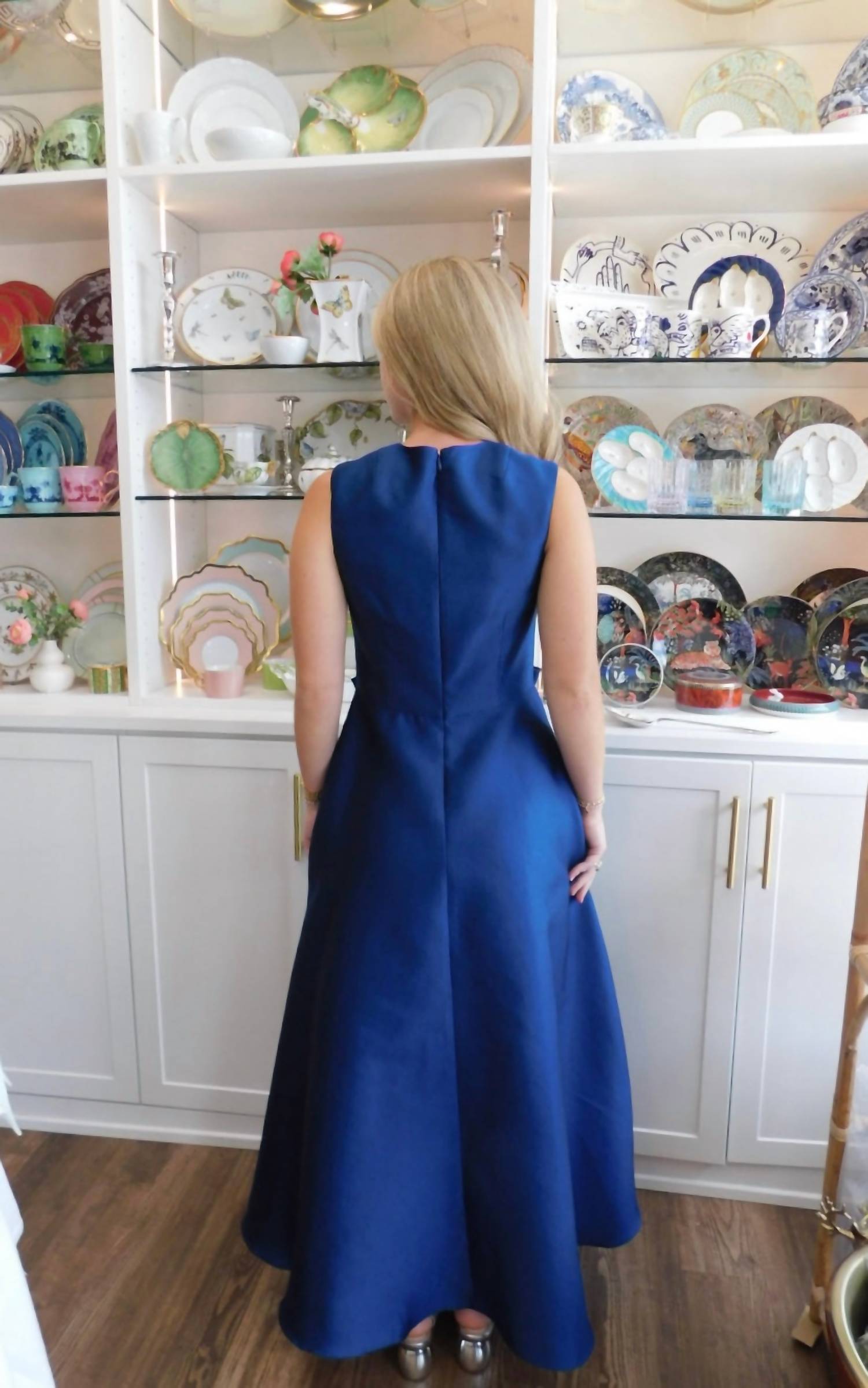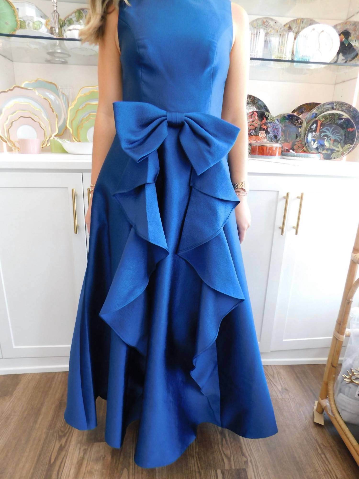 A maxi dress that is just as cute as it is comfortable. Experience elegance with the Shoshanna Leo Maxi Dress, a captivating piece in navy designed for special occasions. This sleeveless A-line dress is crafted from pebble-textured polyester mikado and features a chic crewneck. Highlighted by a draped bow and cascade ruffles adorning the front, its form-fitted bodice and full circle skirt offer a graceful silhouette. Closure: Hidden back zipper. Care: Dry clean only.