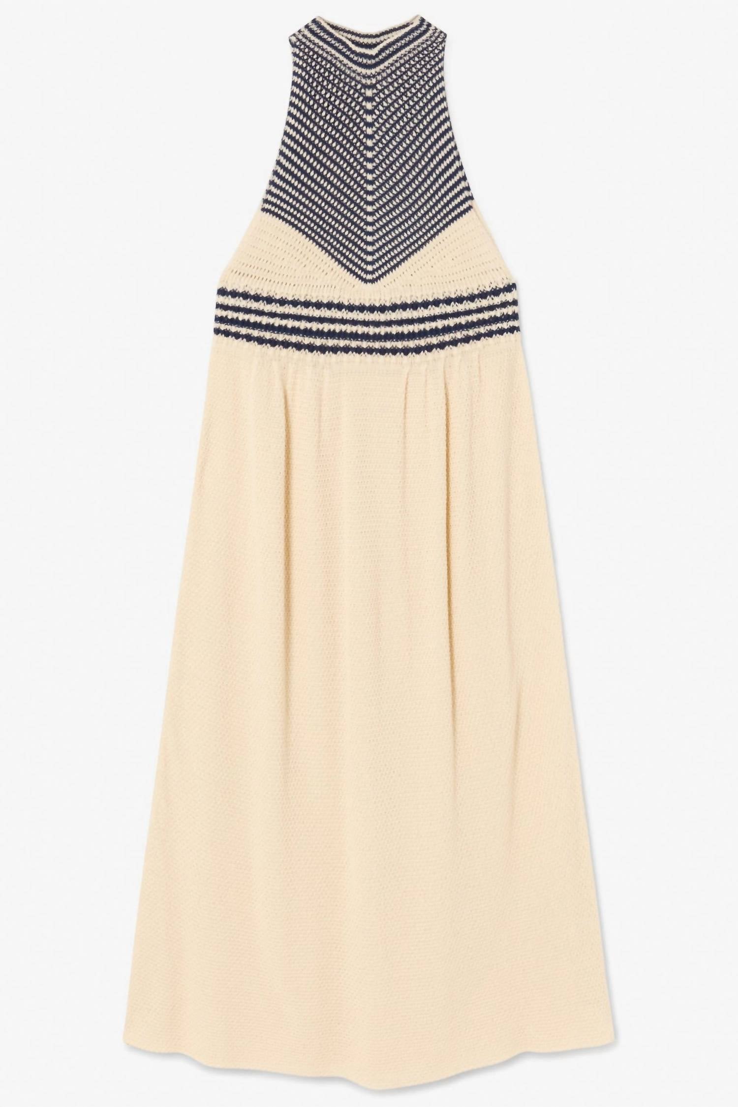 Style this maxi with your favorite statement necklace and sandals for the perfect look. Unveil your sophisticated style with the SITA MURT Textured Halter Dress, a perfect addition for summer evening events. This sleeveless midi dress in ecru features navy blue piping with contrasting stripes, crafted with a special knitwork to provide a textured finish. Made from 100% cotton and designed with a chic empire waist silhouette, it showcases attention to detail with seams under the chest for a flattering fit. With a pull-on closure and designed in Barcelona, this dress exudes elegance.