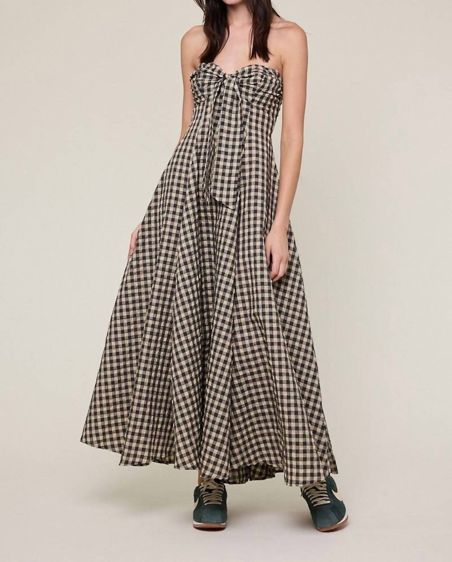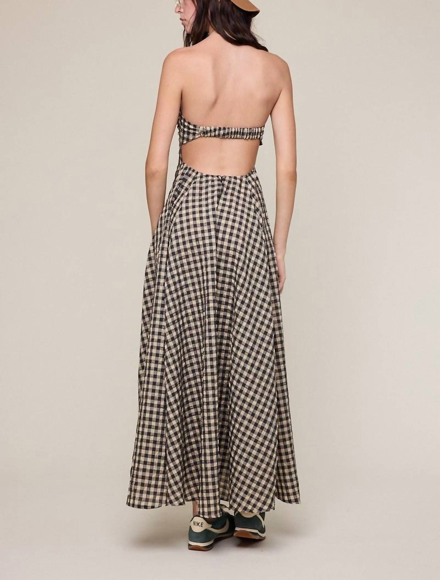 A maxi dress that is just as cute as it is comfortable. Introducing the Gingham Open Back Maxi Dress by Sky to Moon, a stunning piece perfect for a summer dinner party. This strapless dress showcases a relaxed, flowy maxi silhouette with a striking open back and front tie detailing, crafted from a lightweight woven fabric in a chic black and ivory checker print. Composition includes a self-fabric made of 100% cotton and a lining of 100% polyester. Closure: Pull on. Care: Dry clean only. Model Claudia is wearing a size medium and is 5’5” with a bust of 34B and wears 28 in jeans.