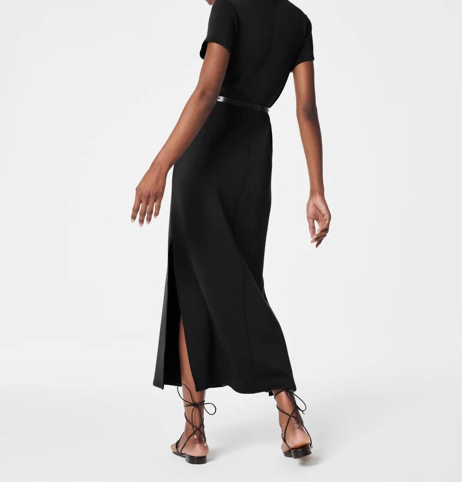 A maxi dress that is just as cute as it is comfortable. The Spanx Air Essentials Maxi T-shirt Dress in sleek black combines minimalist elegance with maximum comfort. This short sleeve, sheath silhouette features a crewneck and high side slits, ideal for easy movement. Crafted from breathable Modal, the dress has a length of 54 inches and offers a versatile style from street to beach. Care for this solid, spring-ready dress with machine wash and tumble dry settings.