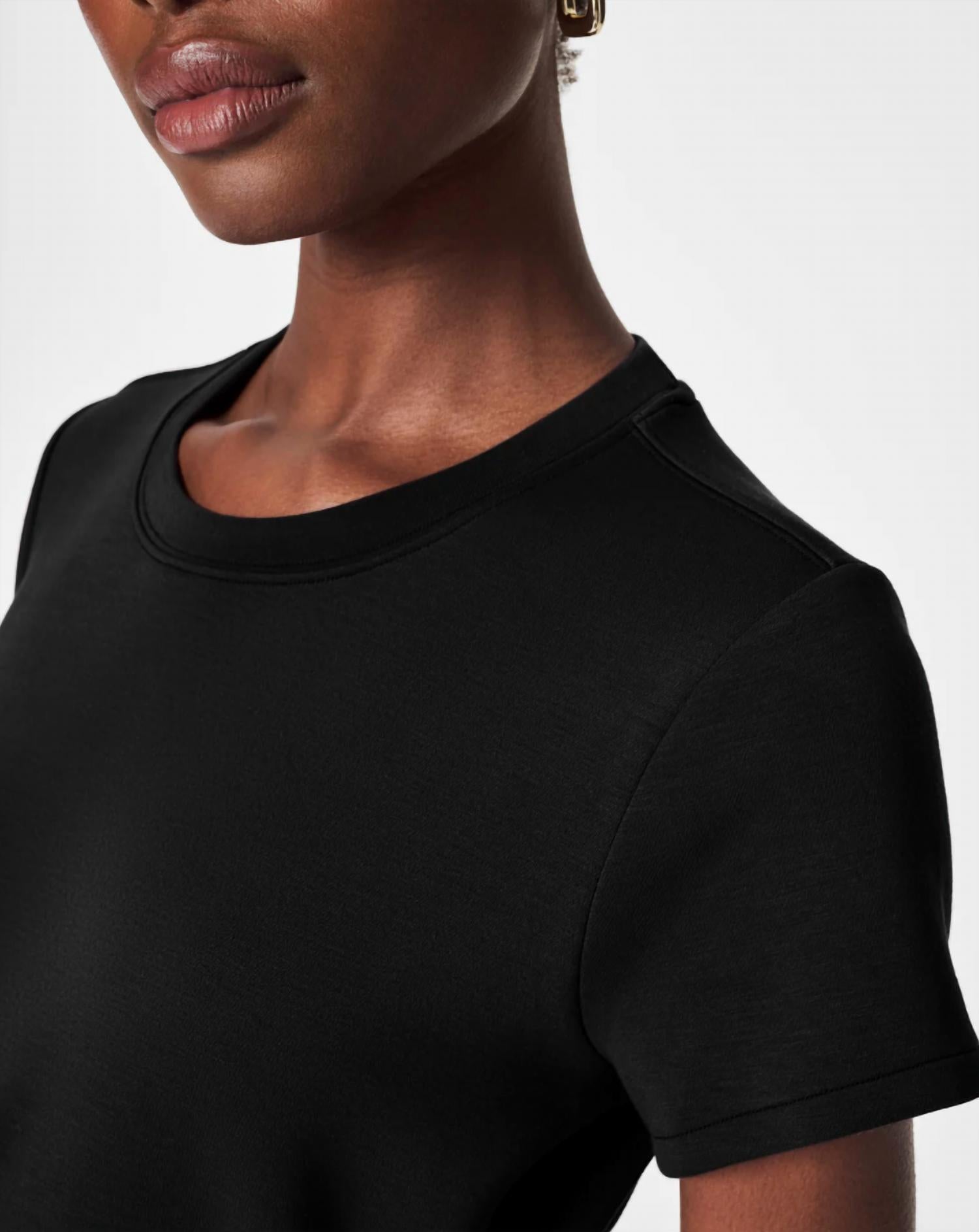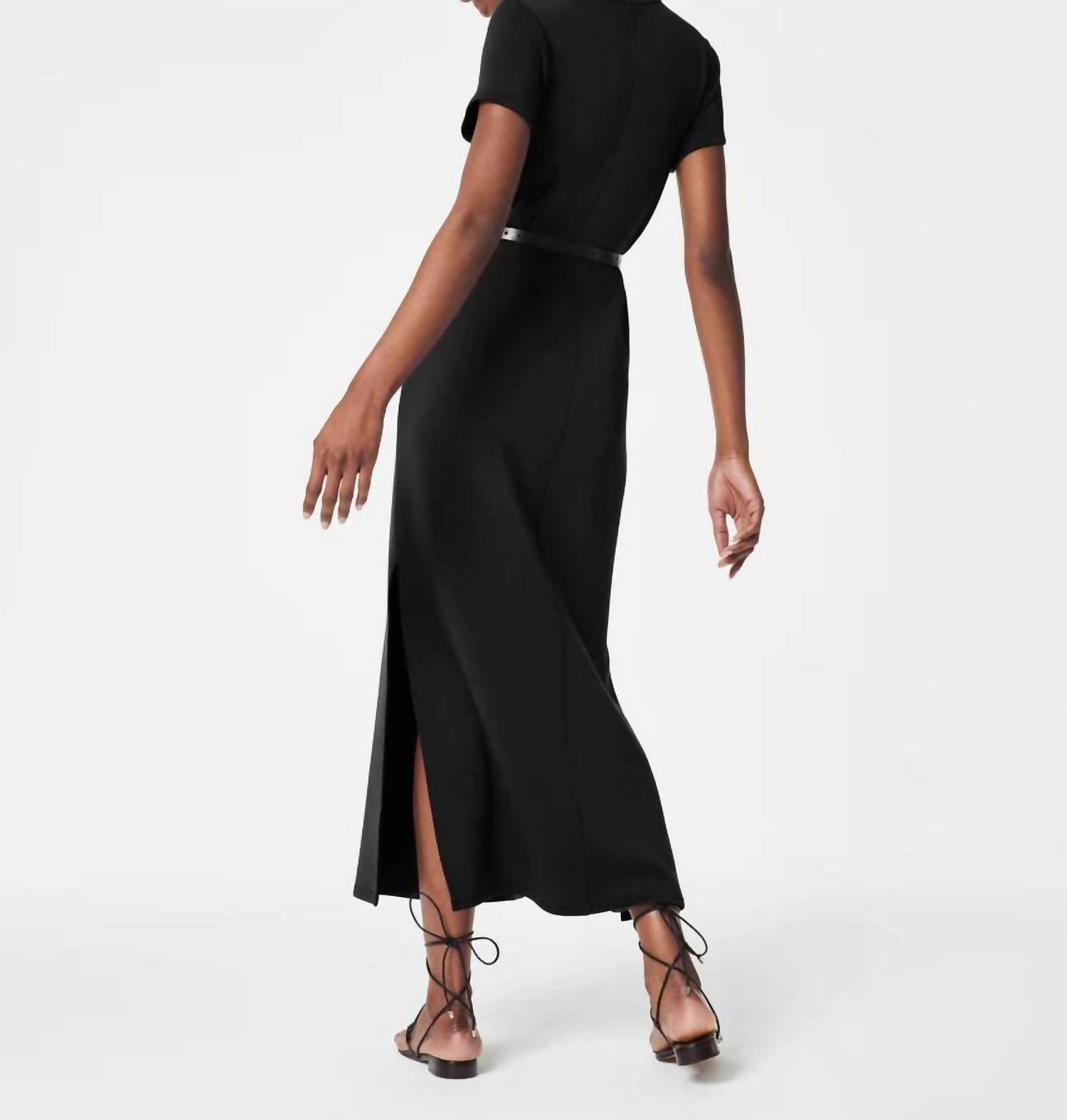 A maxi dress that is just as cute as it is comfortable. Elevate your summer wardrobe with the Spanx AirEssentials Maxi Dress, a must-have for any gathering. This minimalist sheath dress features short sleeves and is crafted from a breathable blend of 47% modal, 46% polyester, and 7% elastane, offering a luxuriously soft feel. Designed with a crewneck and high side slits for easy movement, its solid Very Black color adds a touch of sophistication. The full-length silhouette and pull-on closure ensure effortless wear from the beach to a dinner party.