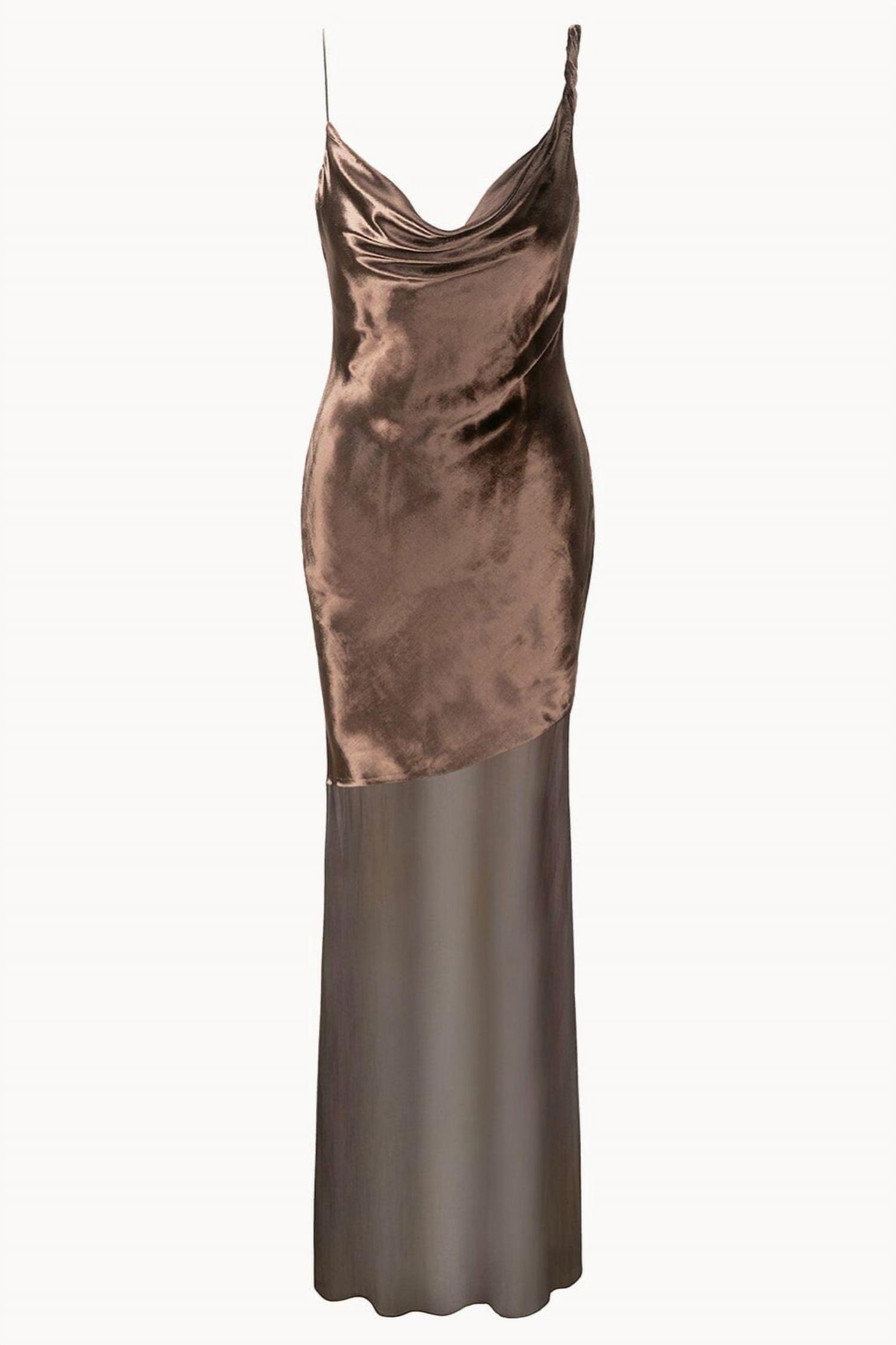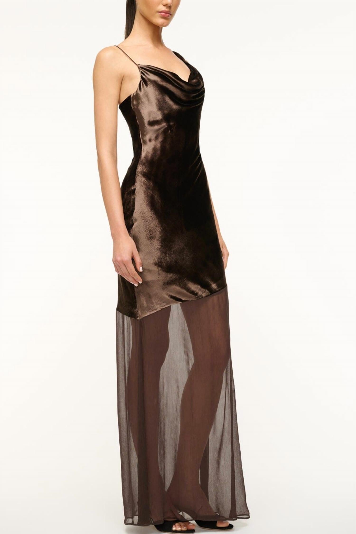 Style this maxi with your favorite statement necklace and sandals for the perfect look. Elevate your holiday wardrobe with the Beaton Maxi Dress by STAUD in a luscious dark chocolate hue. Featuring delicate spaghetti straps and an elegant asymmetrical maxi-length, this dress combines a velvet bodice (88% Viscose, 12% Silk) with a sheer crinkle chiffon skirt (100% Viscose). The captivating cowl neckline and open upper back design offer a sophisticated allure, perfect for special occasions. Closure is effortlessly achieved with a pull on style, and care is simple with dry cleaning recommended.