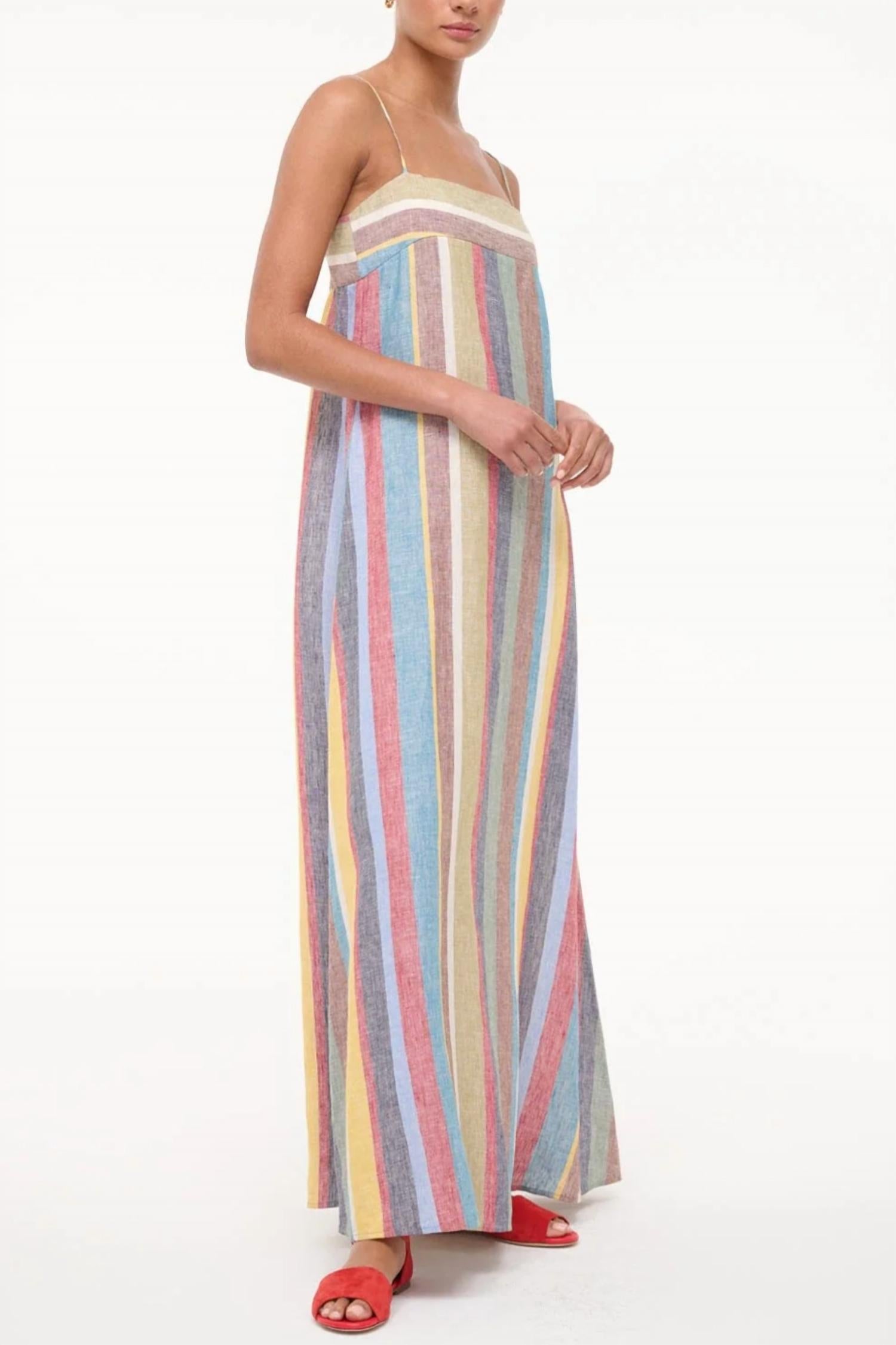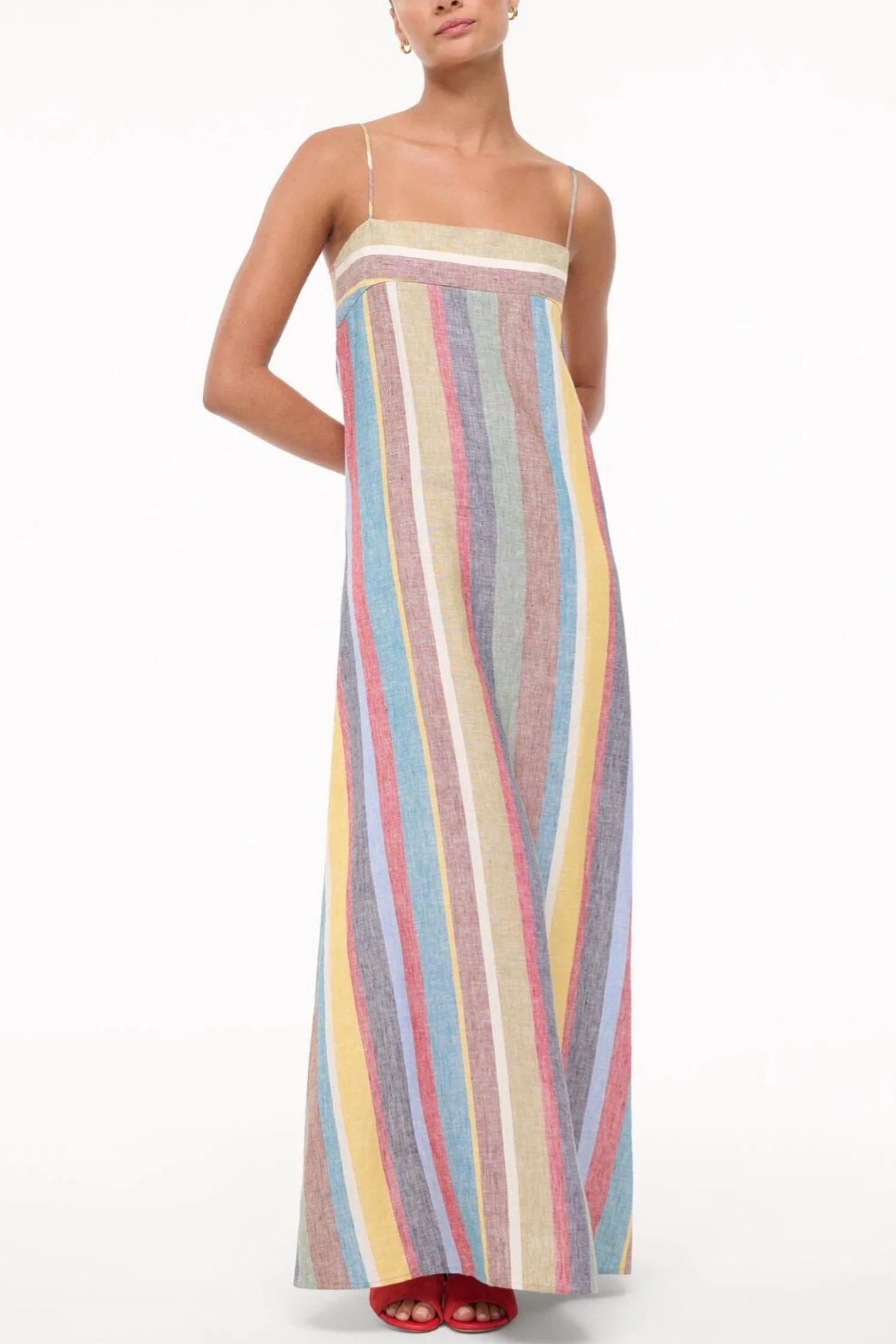 Who doesn't love a good maxi dress? This one you'll be reaching for season after season. Discover the Laura Linen Dress by STAUD, an effortlessly chic maxi dress featuring stylish spaghetti straps and a flattering square neckline. Crafted from 100% linen, this dress showcases a vibrant colorful striped pattern perfect for a cocktail party. Enjoy the easy summer vibe with this boho-chic piece while maintaining its pristine look with dry clean only instructions. Embrace the versatility and charm of this women's shift silhouette dress, ideal for celebrating special occasions.
