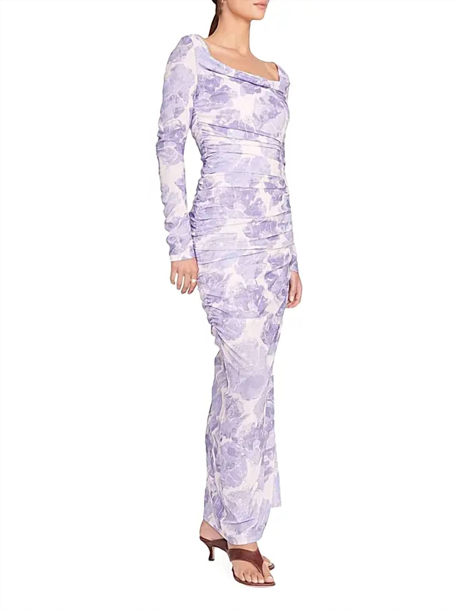Style this maxi with your favorite statement necklace and sandals for the perfect look. Meet the Solana Floral Ruched Maxi Dress from STAUD, a stunning piece in an Antique Pressed Flowers pattern. Featuring long sleeves and a flattering square neck, this body-con silhouette is enhanced by elegant side ruching. Composition: 88% Polyamide, 12% Spandex. Closure: Pull on. Care: Dry clean only. Imported. Ideal for making a statement at your next holiday party.