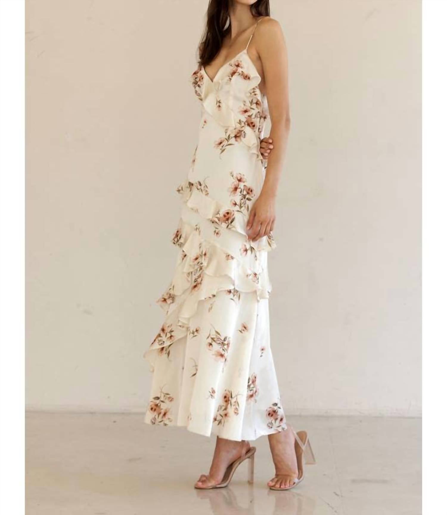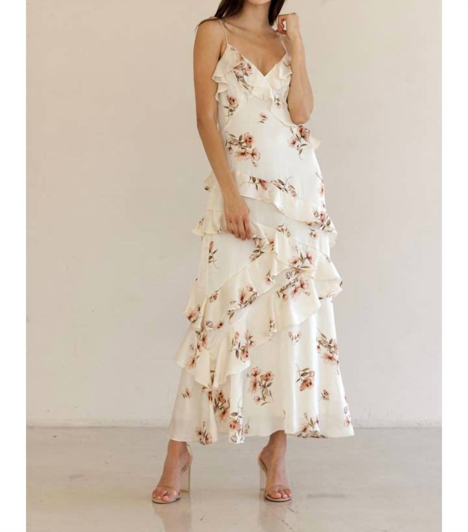 A maxi dress that is just as cute as it is comfortable. Introducing the Floral Ruffle Maxi by STORIA, a breathtaking slip dress perfect for any occasion. This dress features adjustable spaghetti straps with a graceful V-neckline and tiered ruffle design that enhances its flowing silhouette. Made from lightweight polyester, it showcases an elegant floral pattern in ivory, pink, and soft green.