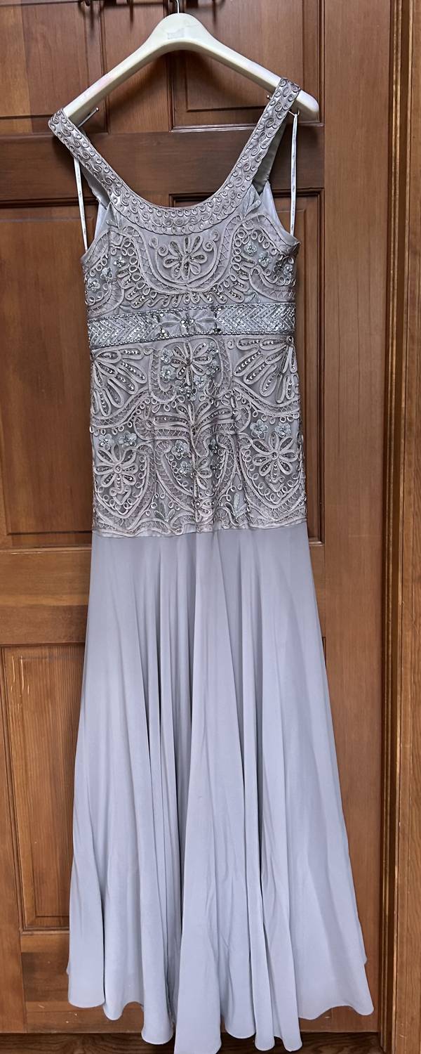Style this maxi with your favorite statement necklace and sandals for the perfect look. Elevate your cocktail party wardrobe with Sue Wong's Women's Long Dress in a stunning platinum hue. This sleeveless sheath silhouette features a scoop neckline and a textured pattern, perfect for spring occasions. Length: Maxi. Origin: Information not specified. Care instructions not provided.