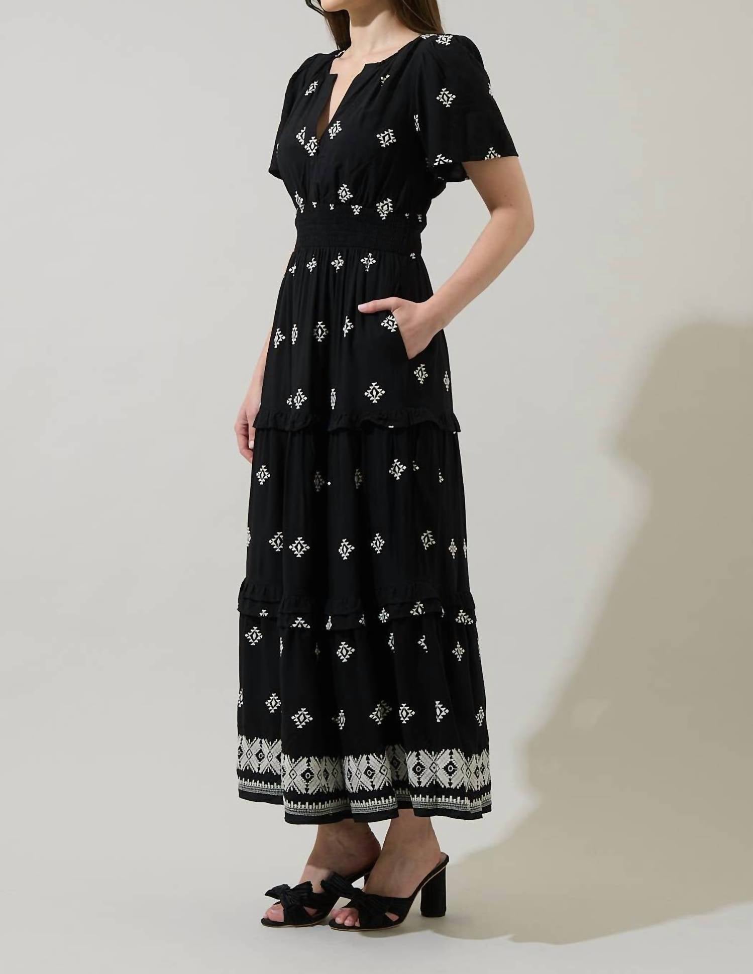 Style this maxi with your favorite statement necklace and sandals for the perfect look. Elevate your wardrobe with the Floral Palmer Poplin Tiered Dress by SUGARLIPS, an exquisite blend of casual elegance and eye-catching detail. Crafted from rayon, this black and white maxi dress features short puff sleeves, a smocked waist, and a tiered A-line silhouette for a flattering fit. Designed with practicality in mind, it includes pockets and a convenient pull-on closure. Hand wash gently and line dry for best results. Ideal for a chic winter dinner party or New Year's Eve celebration.