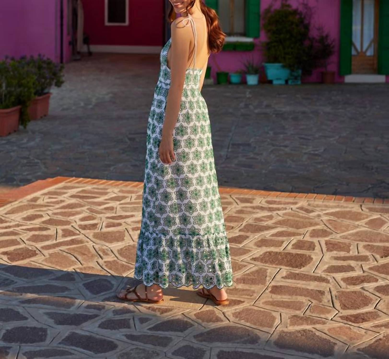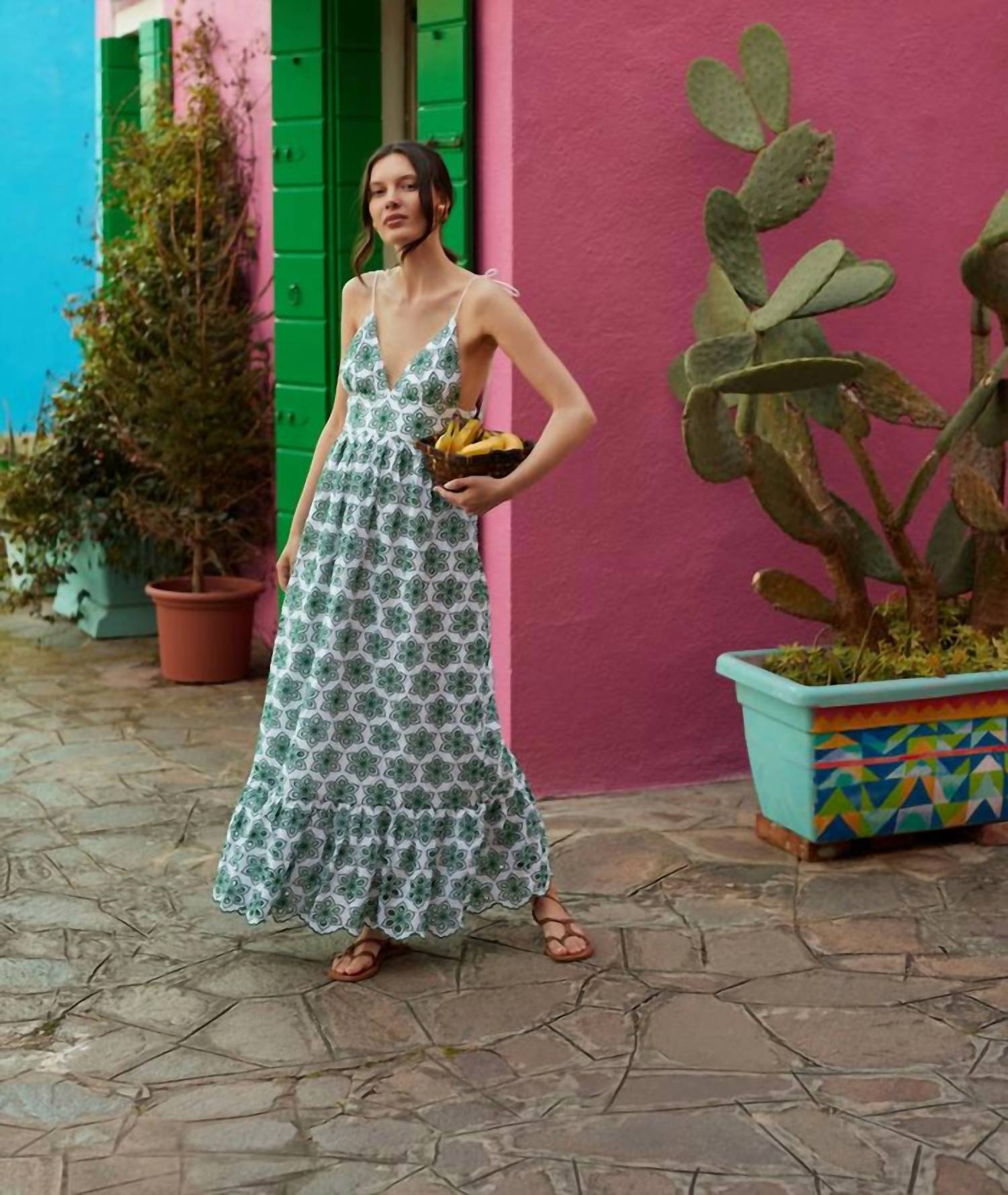 Who doesn't love a good maxi dress? This one you'll be reaching for season after season. Introducing the Louve Long Maxi Dress by Sundress, a romantic and feminine addition to your wardrobe. With its spaghetti straps and empire waist silhouette, this maxi dress is crafted from delicate eyelet fabric in a captivating white and green. Designed in France, it features an open back and a tiered hem for graceful movement, complemented by green topstitching and a pull-on closure. Made entirely from cotton, this dress is as comfortable as it is elegant, with care instructions for gentle cleaning and line drying.