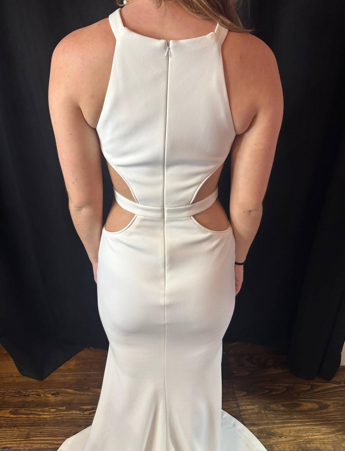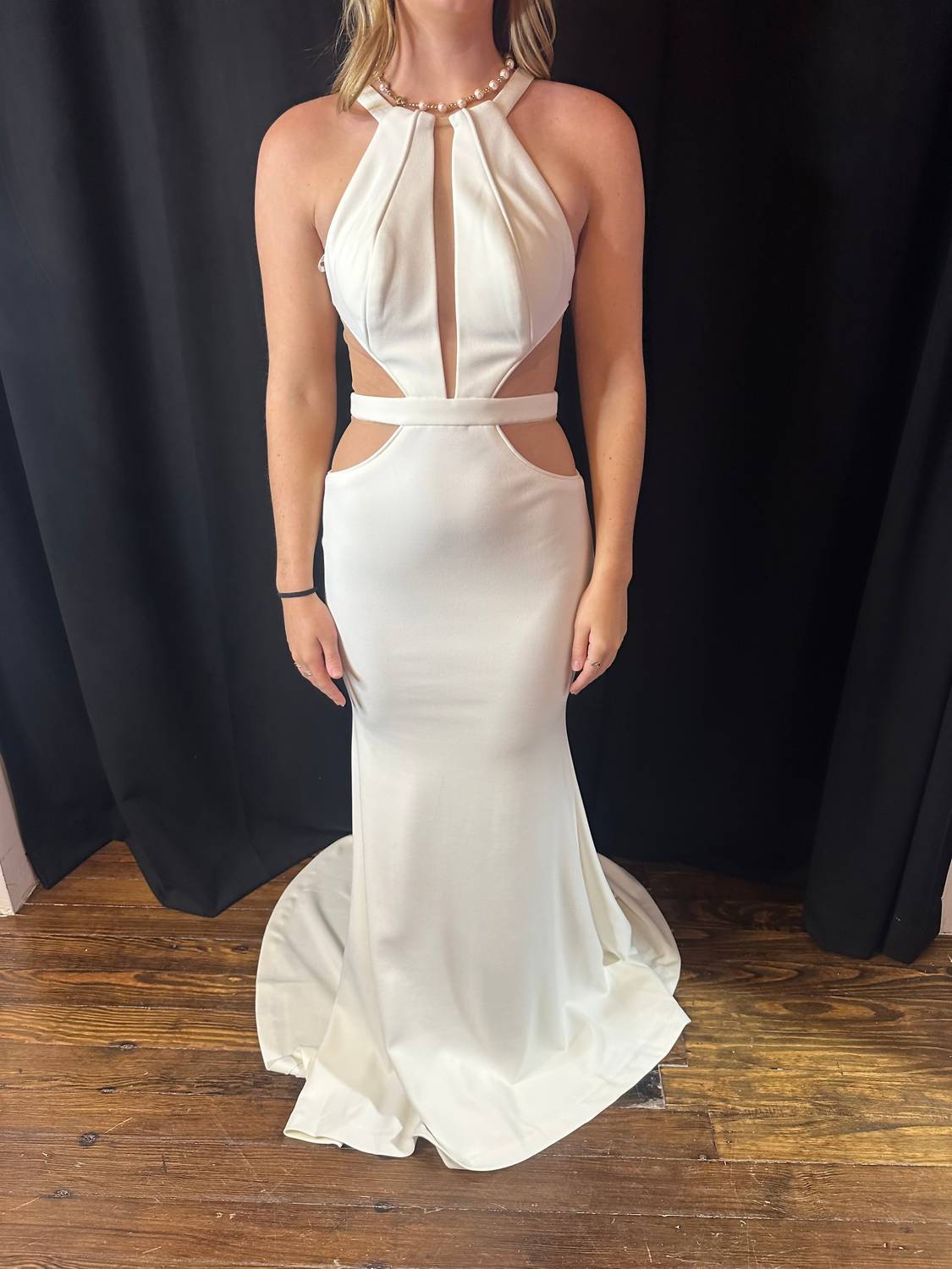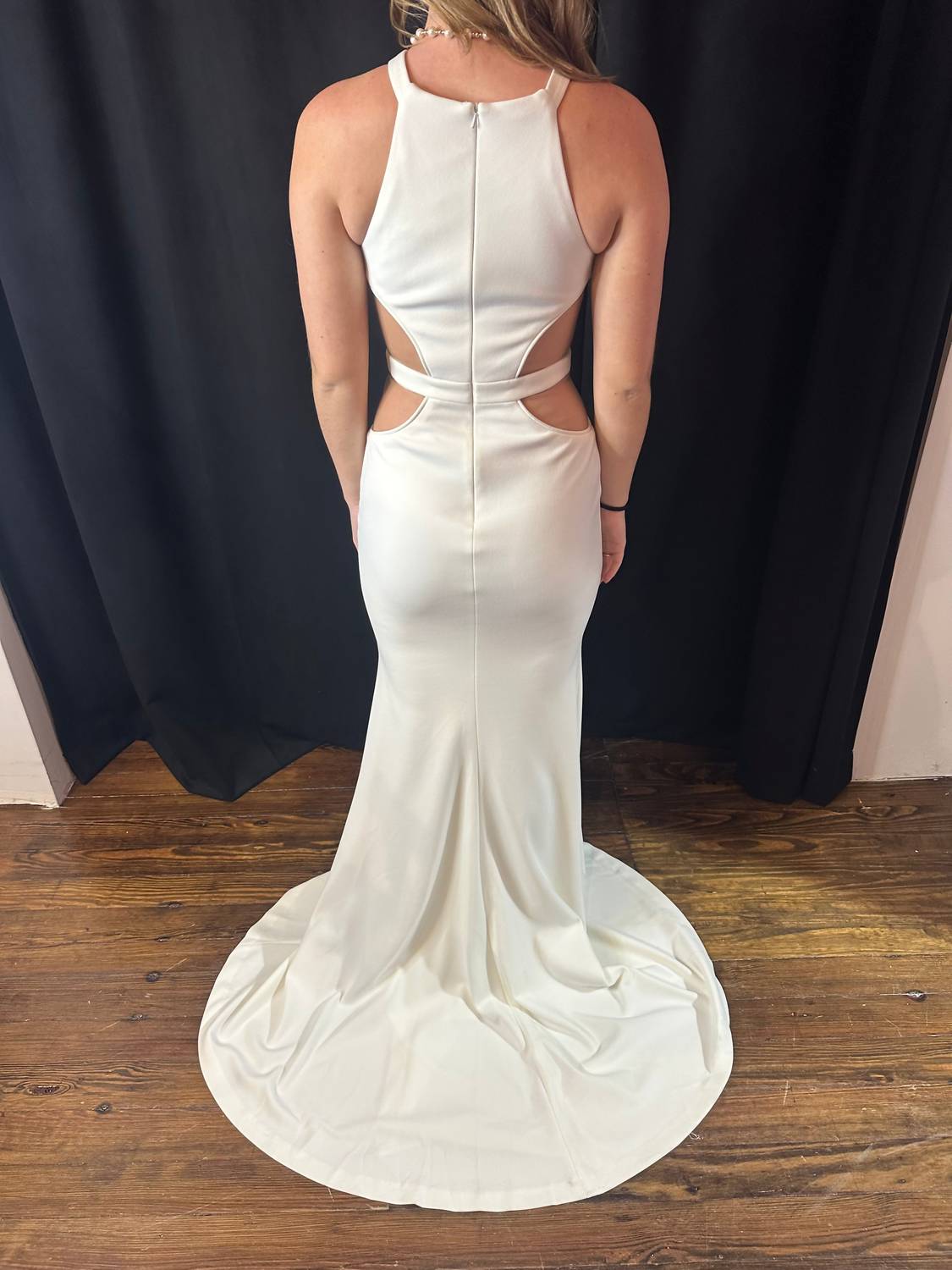Style this maxi with your favorite statement necklace and sandals for the perfect look. Elevate your formal ensemble with the Emily Gown by Terani Couture, a captivating mermaid silhouette perfect for weddings. This sleeveless maxi dress features a sophisticated crewneck and a sleek zip closure for a seamless fit. Style and comfort come together as the gown is tailored true to size in an elegant solid white. Care and origin details are not specified for this special occasion piece.