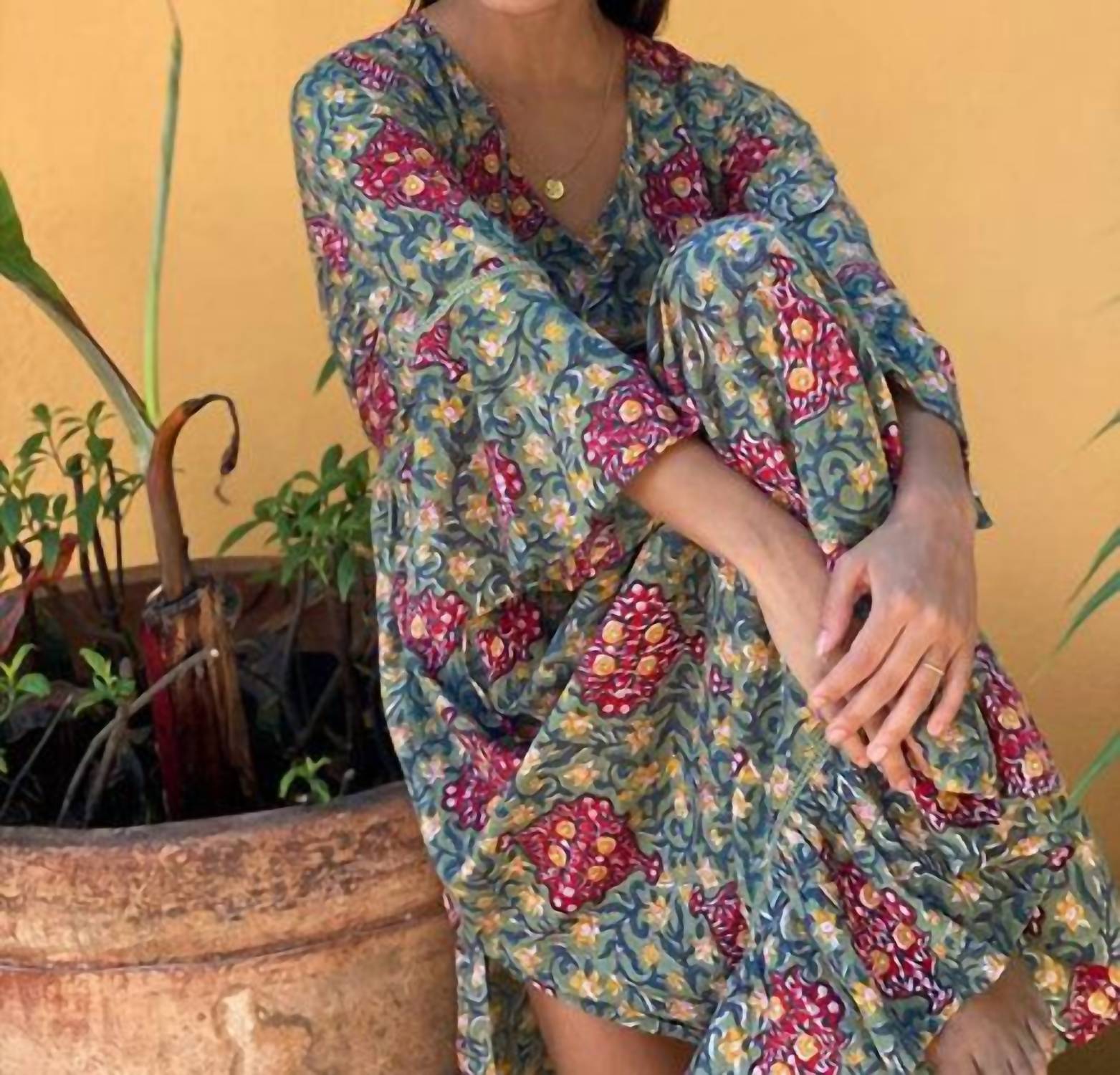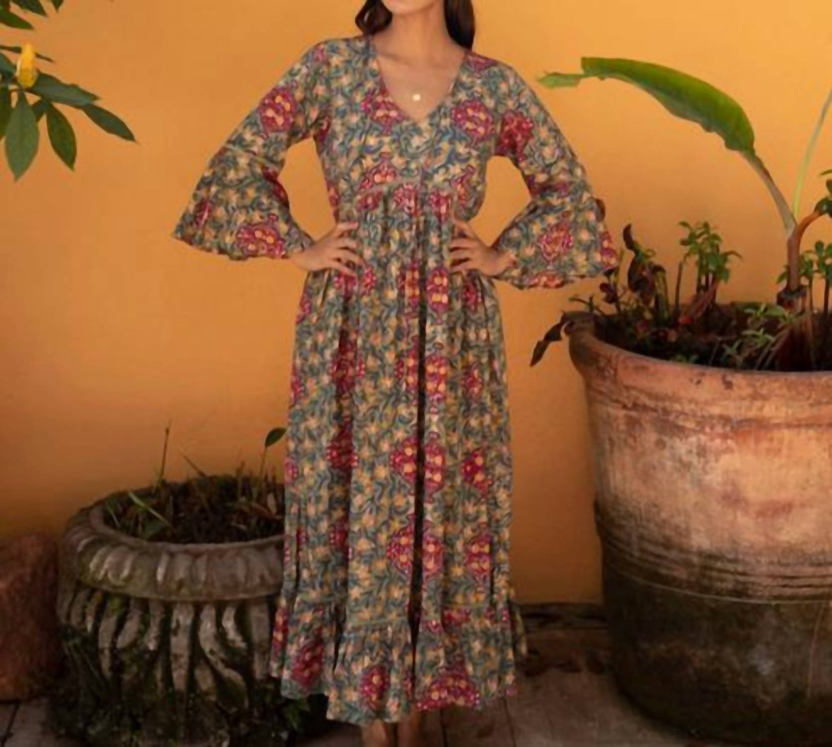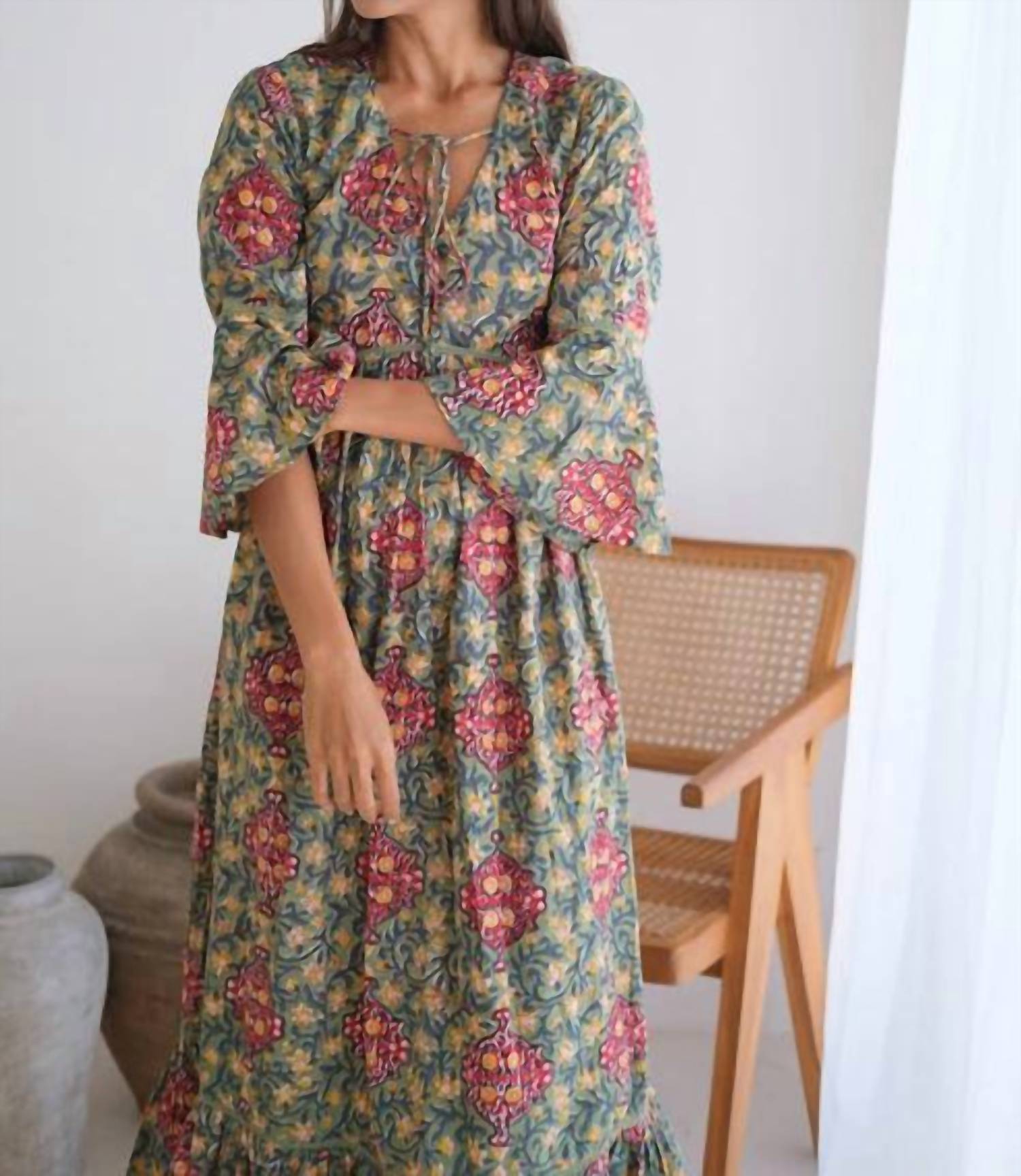 Style this maxi with your favorite statement necklace and sandals for the perfect look. Meet the Flair Sleeve Maxi Dress by The Fox and the Mermaid, a perfect embodiment of boho chic for your holiday party wardrobe. Crafted from 100% cotton, this vintage-style dress showcases a hand block-printed floral pattern in the timeless Omisha design. It features three-quarter bell sleeves adorned with intricate lace detailing, complemented by a tie-back closure to enhance the A-line silhouette. Designed for effortless elegance, this pull-on maxi dress is a must-have for Thanksgiving gatherings.