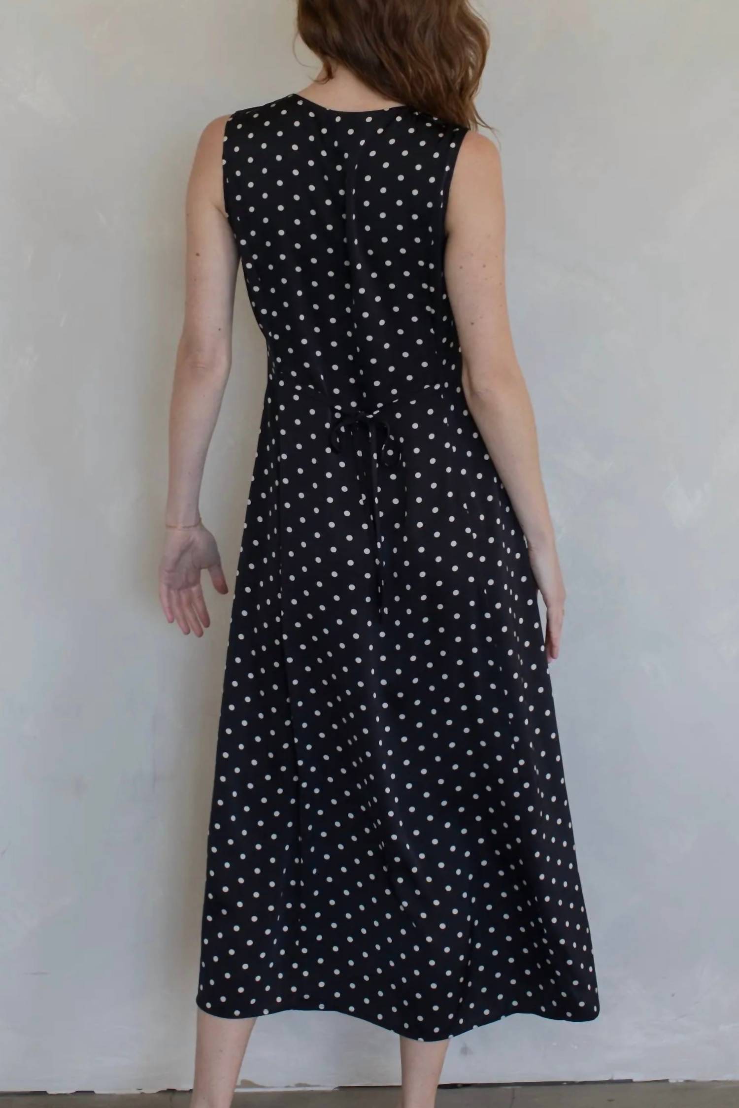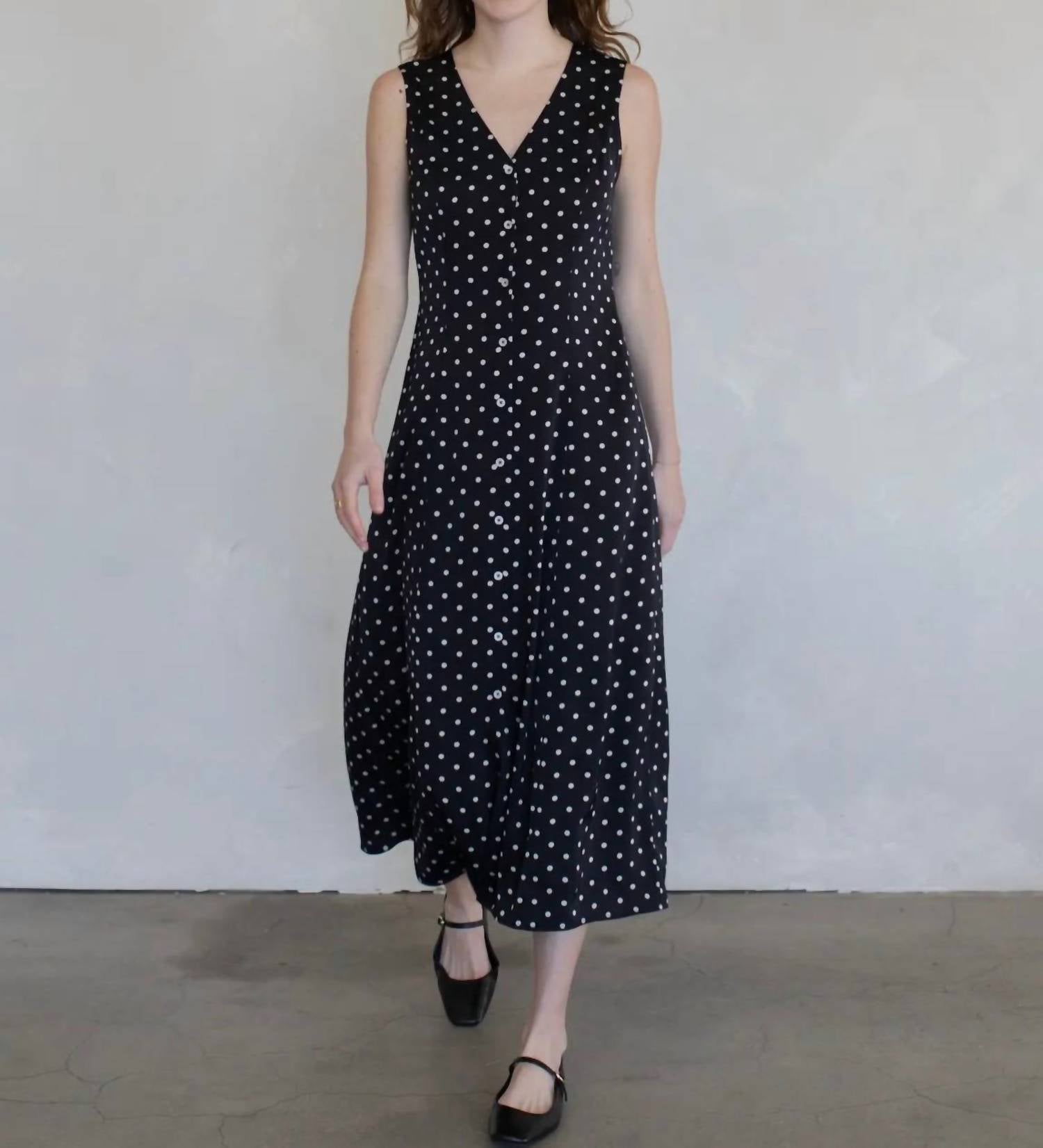 Style this maxi with your favorite statement necklace and sandals for the perfect look. This charming maxi dress features a timeless polka dot print in a breezy, sleeveless silhouette. Crafted from 100% polyester, it offers a crisp, lightweight feel that resists wrinkling, making it ideal for all-day wear. The functional button-down front leads into a waist tie that allows you to customize your fit and define your silhouette, while the addition of side pockets provides a perfect blend of style and practicality.