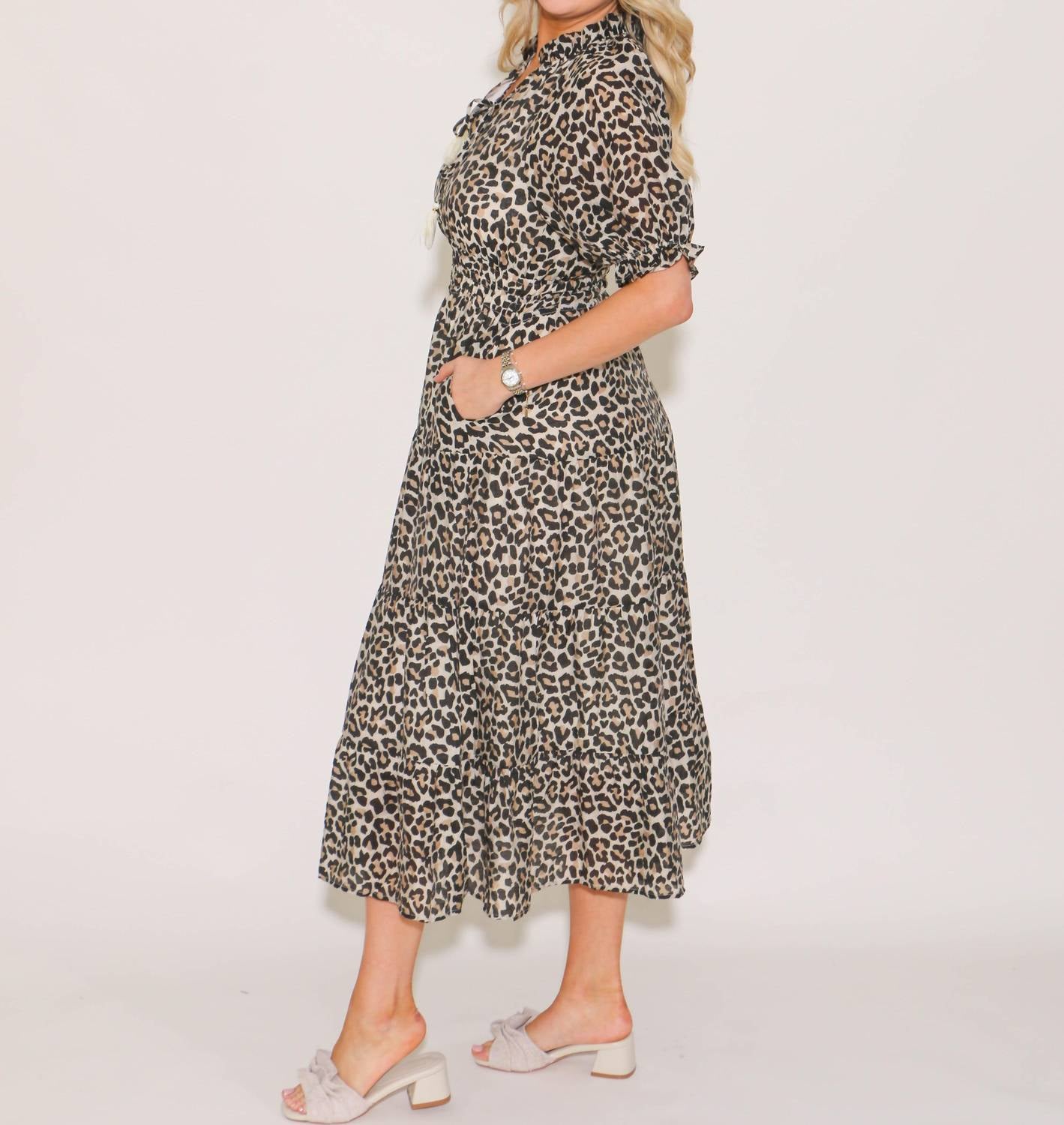 Style this maxi with your favorite statement necklace and sandals for the perfect look. Introducing the Smocked Waist Print Maxi Dress by THML, a captivating piece that embodies the vibrant essence of 90s fashion. This A-line silhouette in a striking leopard print features short sleeves and a flattering smocked waist, perfect for vacation or spring occasions. Closure: Tie closure. Care: Hand wash and line dry.