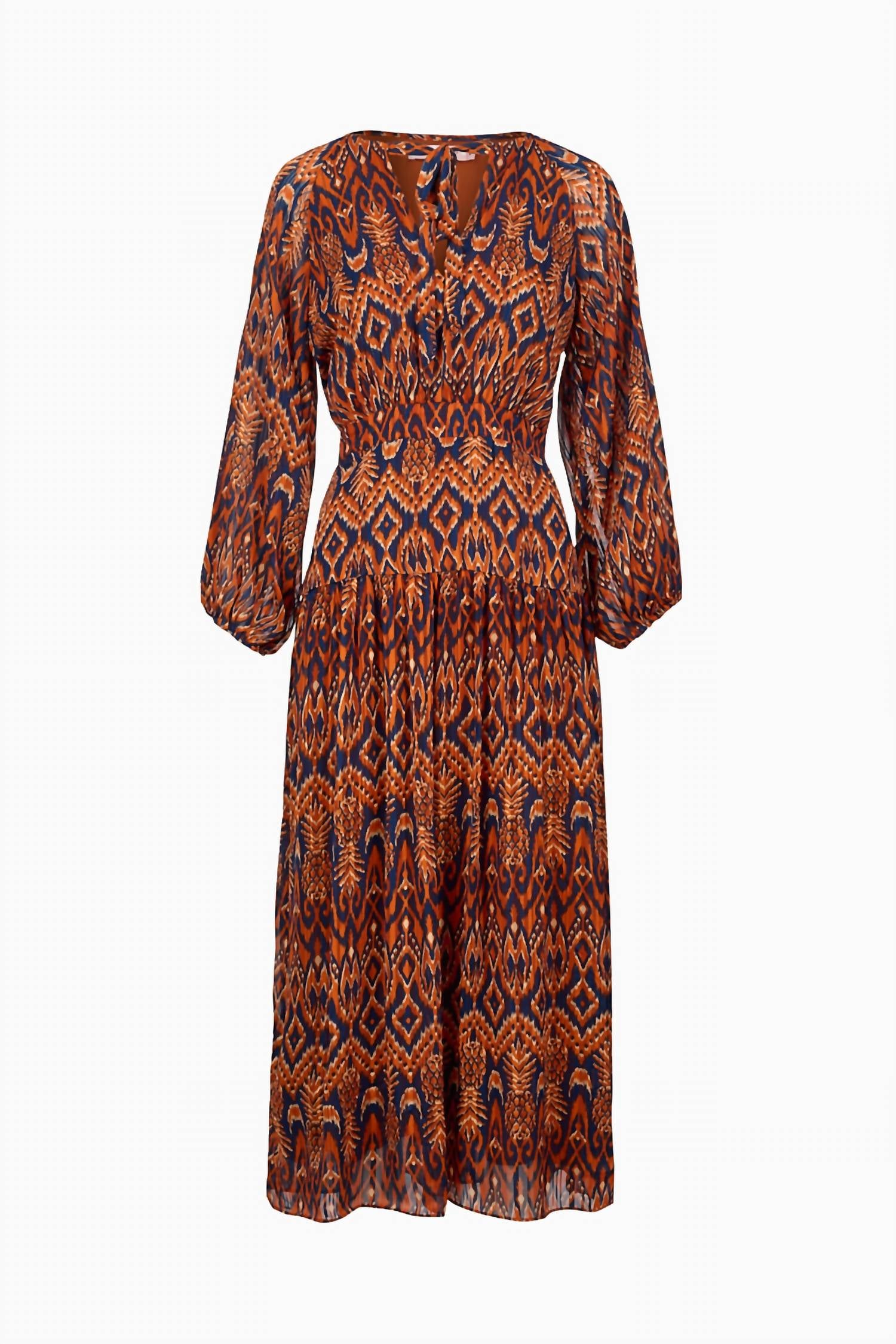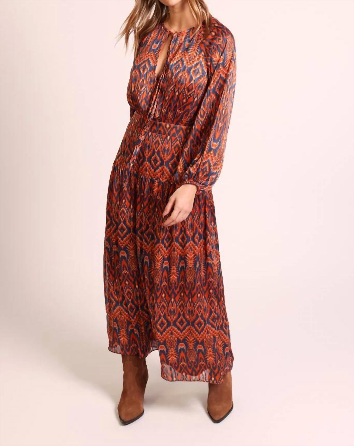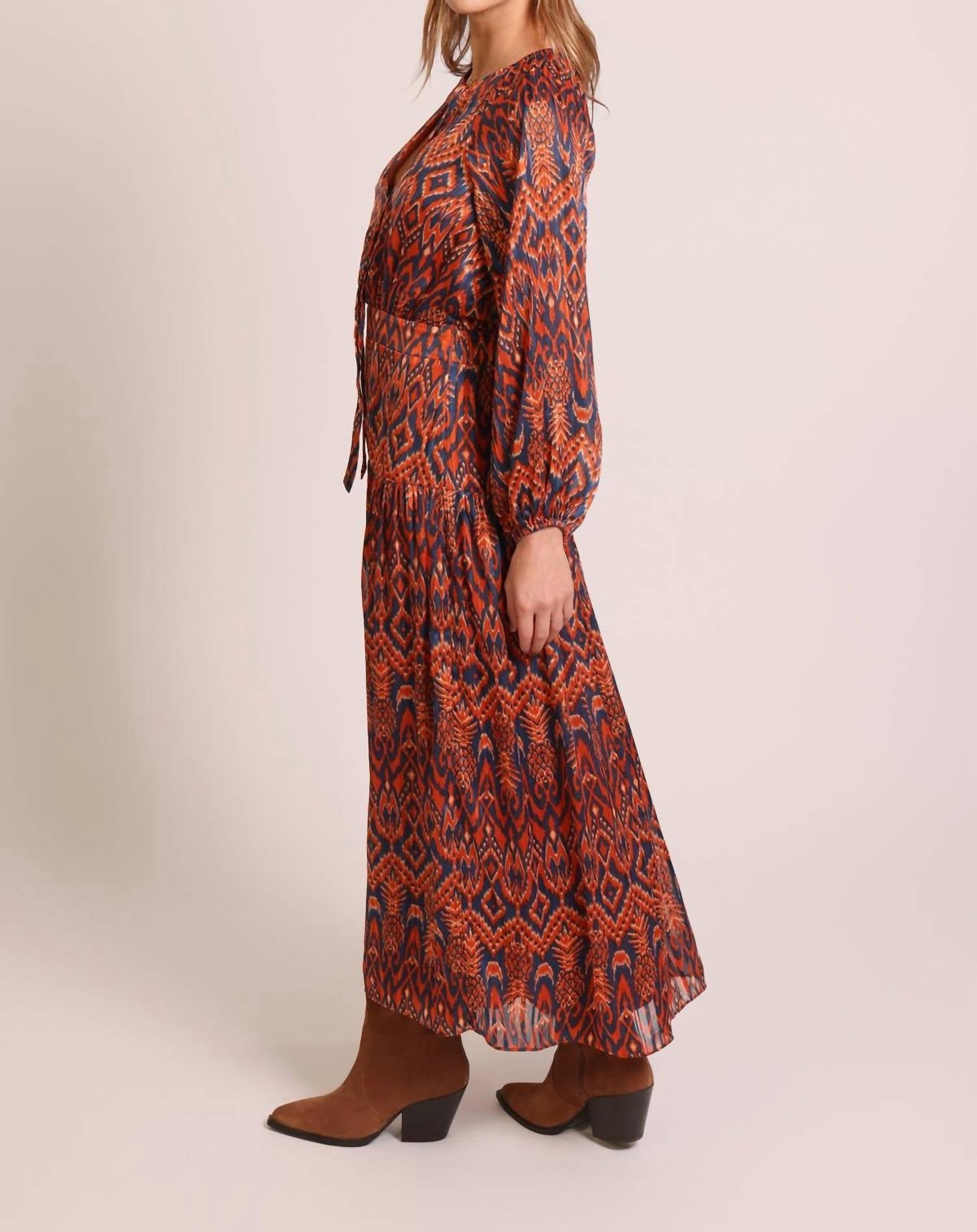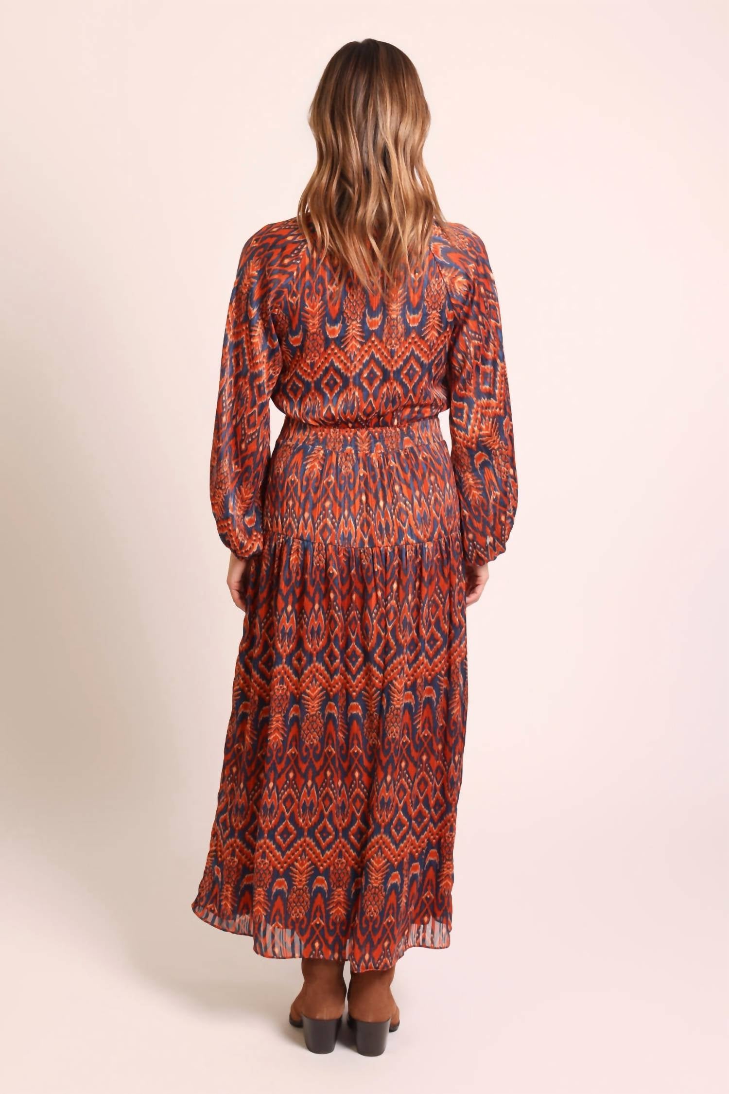 A maxi dress that is just as cute as it is comfortable. Introducing the Blame Maxi Dress by Traffic People, a stunning piece in rust with bold red and blue prints. This gown features long billowy sleeves with elasticated cuffs, a flowing A-line silhouette, and a voluminous tiered hem chiffon skirt for a boho chic look. Made from 100% Polyester with a 100% Cotton lining, it secures with a tie closure. Care for this vibrant piece by machine washing at 30°C, avoiding bleach, and refraining from tumble drying.