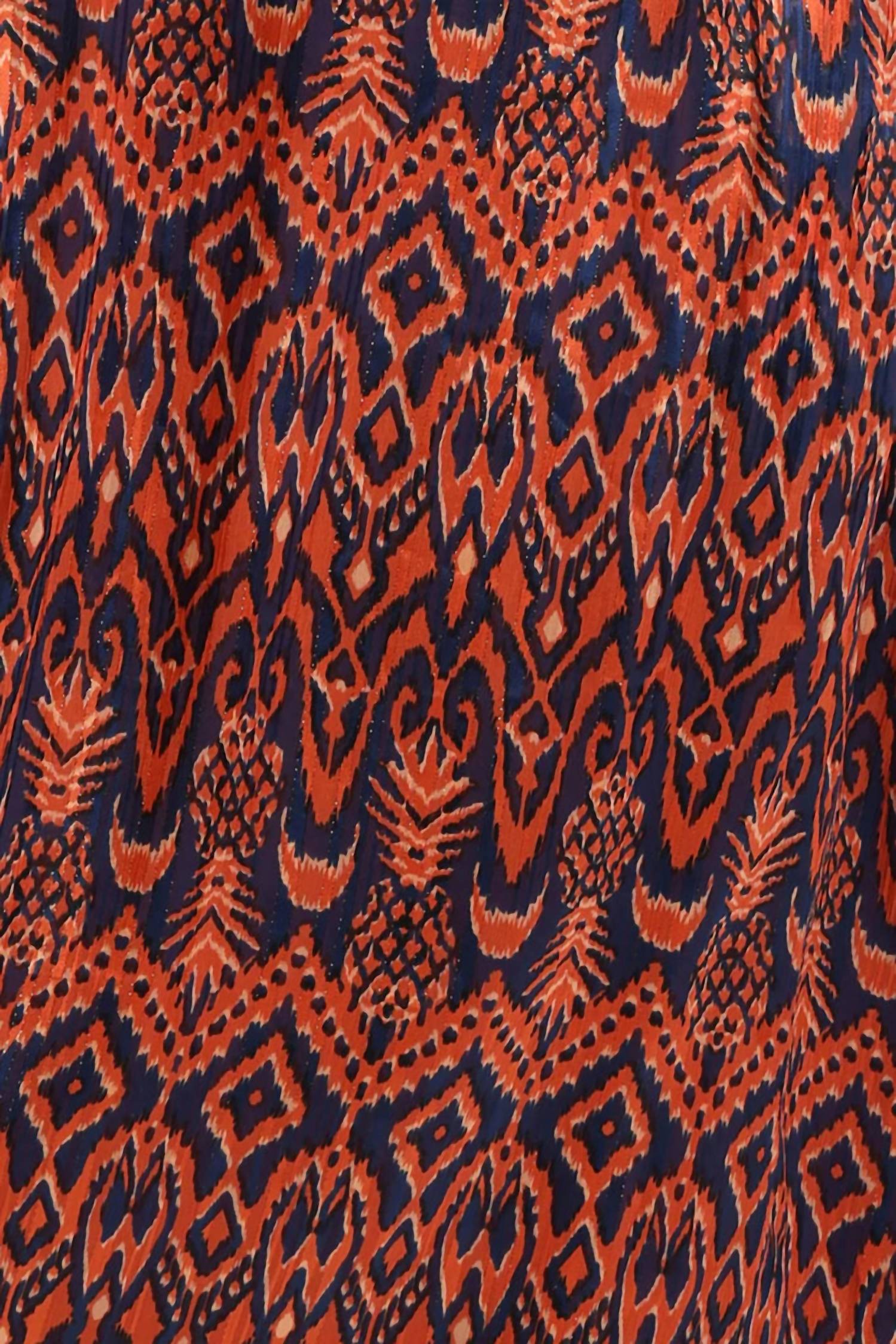 Style this maxi with your favorite statement necklace and sandals for the perfect look. Embrace a bohemian spirit with the Millie Maxi Dress by Traffic People, a stunning piece in a bold rust and blue print. This dress flaunts long trumpet sleeves, a crewneck, and an elasticated back waistband for a flattering silhouette. Made from 100% polyester with a 100% cotton lining, it features a pull-on style complemented by a back button peephole fastening. Care for this exquisite piece with a machine wash at 30°C and line dry it for the perfect summer evening look.