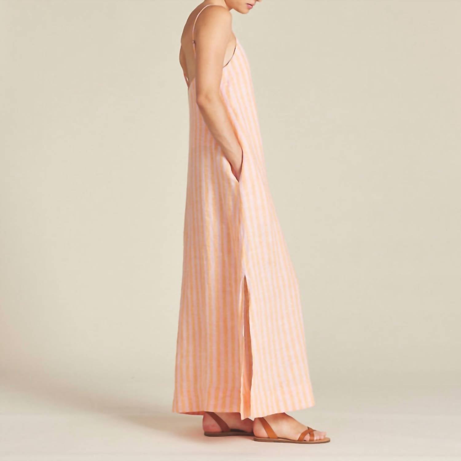 A maxi dress that is just as cute as it is comfortable. Introducing the Reva Maxi Dress by TROVATA, a perfect blend of style and functionality for the modern woman. This kaftan silhouette dress, in a captivating Creamsicle Stripe pattern, features adjustable spaghetti straps with vintage metal rings and a charming sweetheart neckline. Crafted from 100% Linen, it boasts a full-length design with hidden side seam pockets and a convenient pull-on closure. Care instructions: Machine wash and tumble dry.