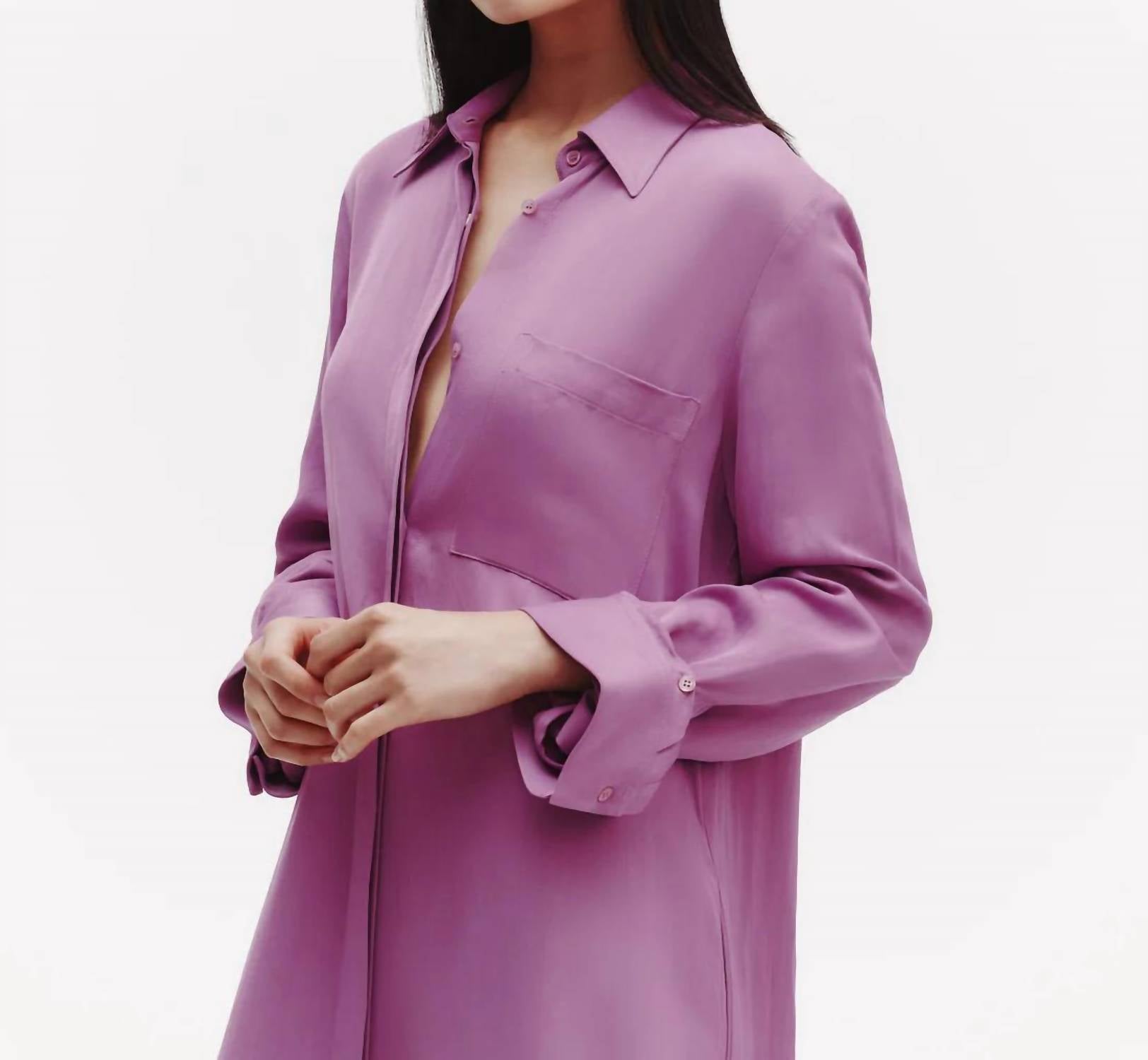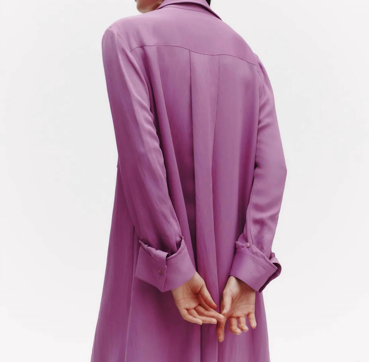 A maxi dress that is just as cute as it is comfortable. Presenting the Jenny's Gown by TWP, a stunning oversized maxi shirt dress in a lilac hue perfect for spring occasions. This piece boasts long sleeves, crafted from a luxurious 76% viscose and 24% linen blend, providing a satiny sheen with the natural weight of linen. The design includes a spread collar, chest patch pocket, signature single roll button cuffs, and a button closure. Whether dressing up or down, this relaxed silhouette effortlessly combines elegance and comfort.