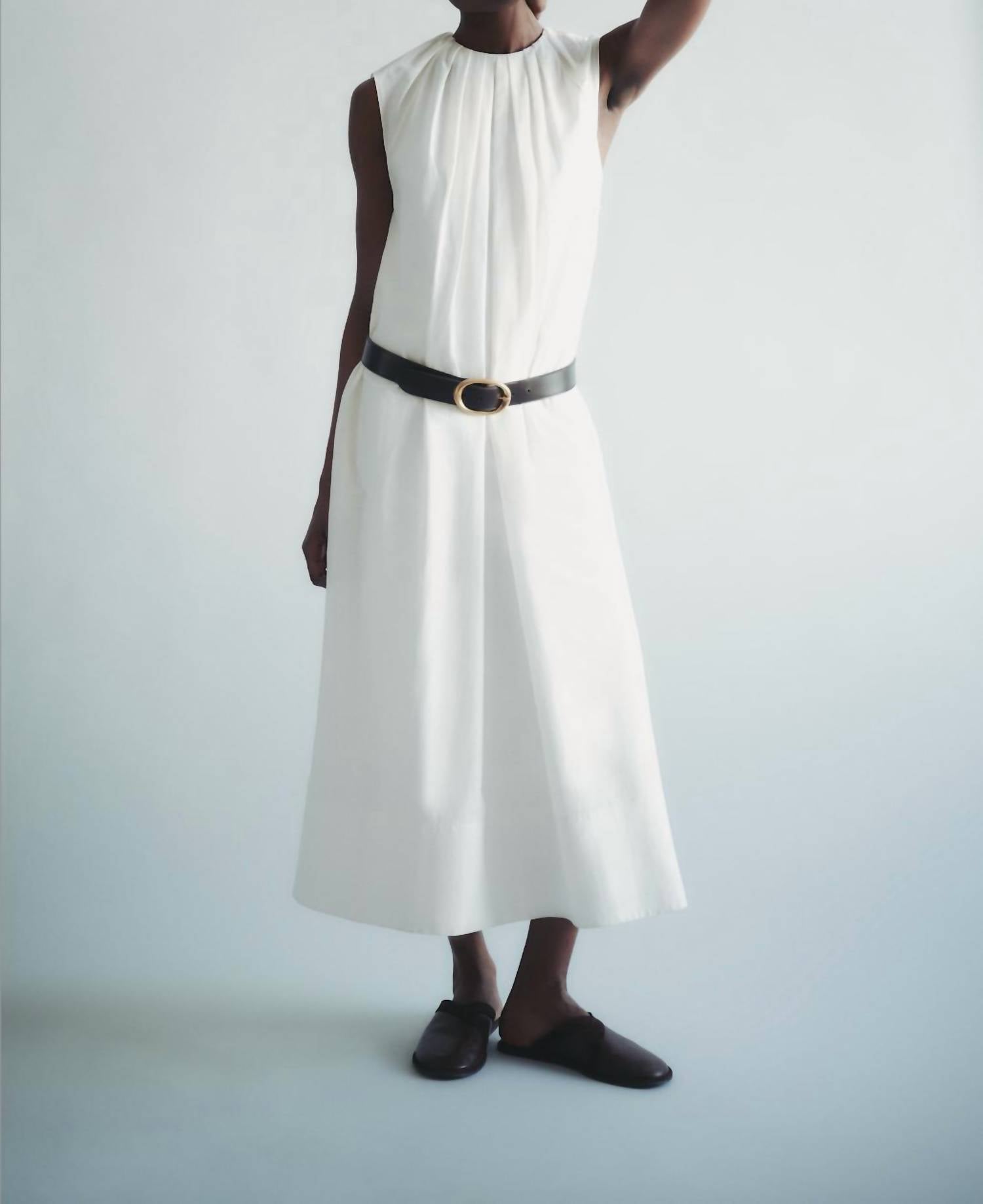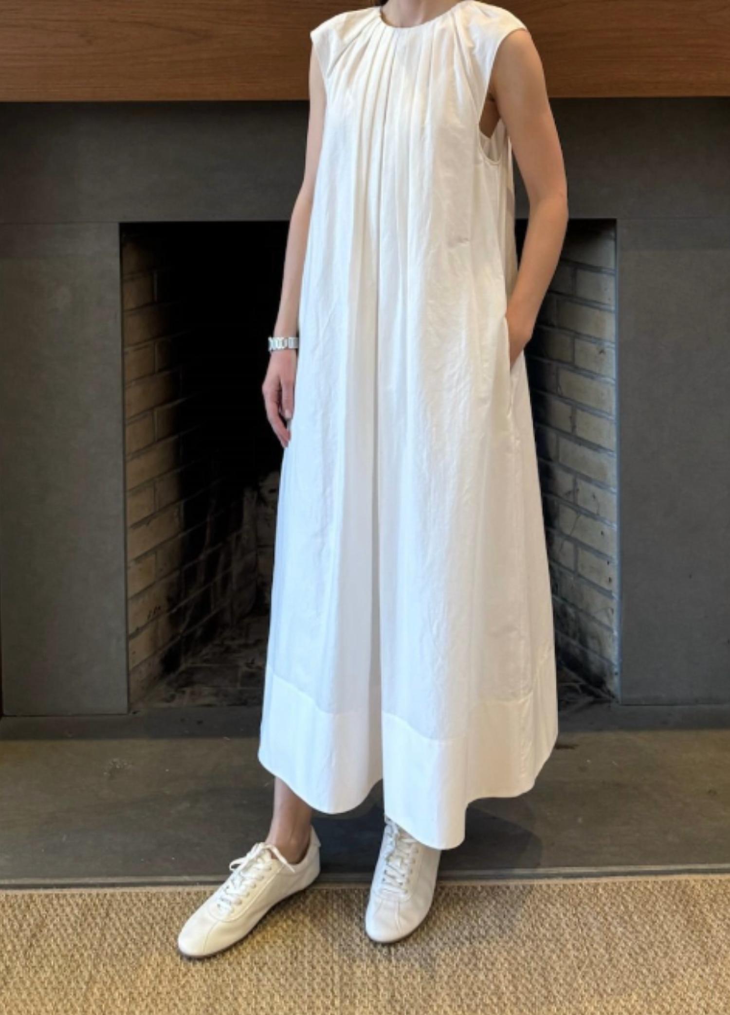 A maxi dress that is just as cute as it is comfortable. Meet the TWP Summer Maxi Dress, a wardrobe must-have offering a perfect balance of comfort and elegance. This sleeveless ivory gown, crafted from 50% Cotton, 50% Silk, exudes timeless charm with its A-line silhouette and minimalist appeal. It is an ideal choice for vacations or any occasion where sophistication is key. Care instructions: Machine wash. Featuring a crewneck and practical pockets, this solid-patterned dress ensures you remain effortlessly chic all summer long.
