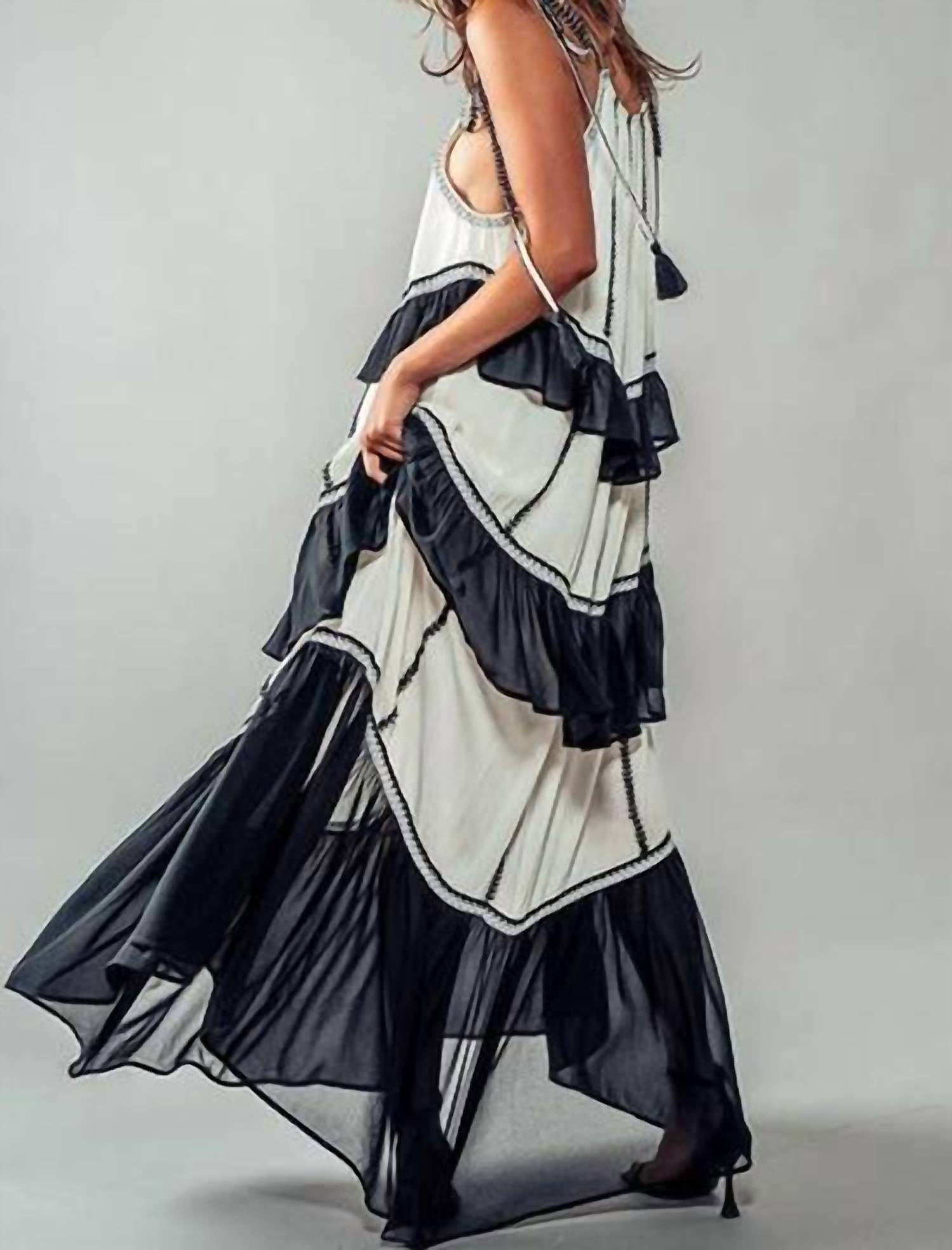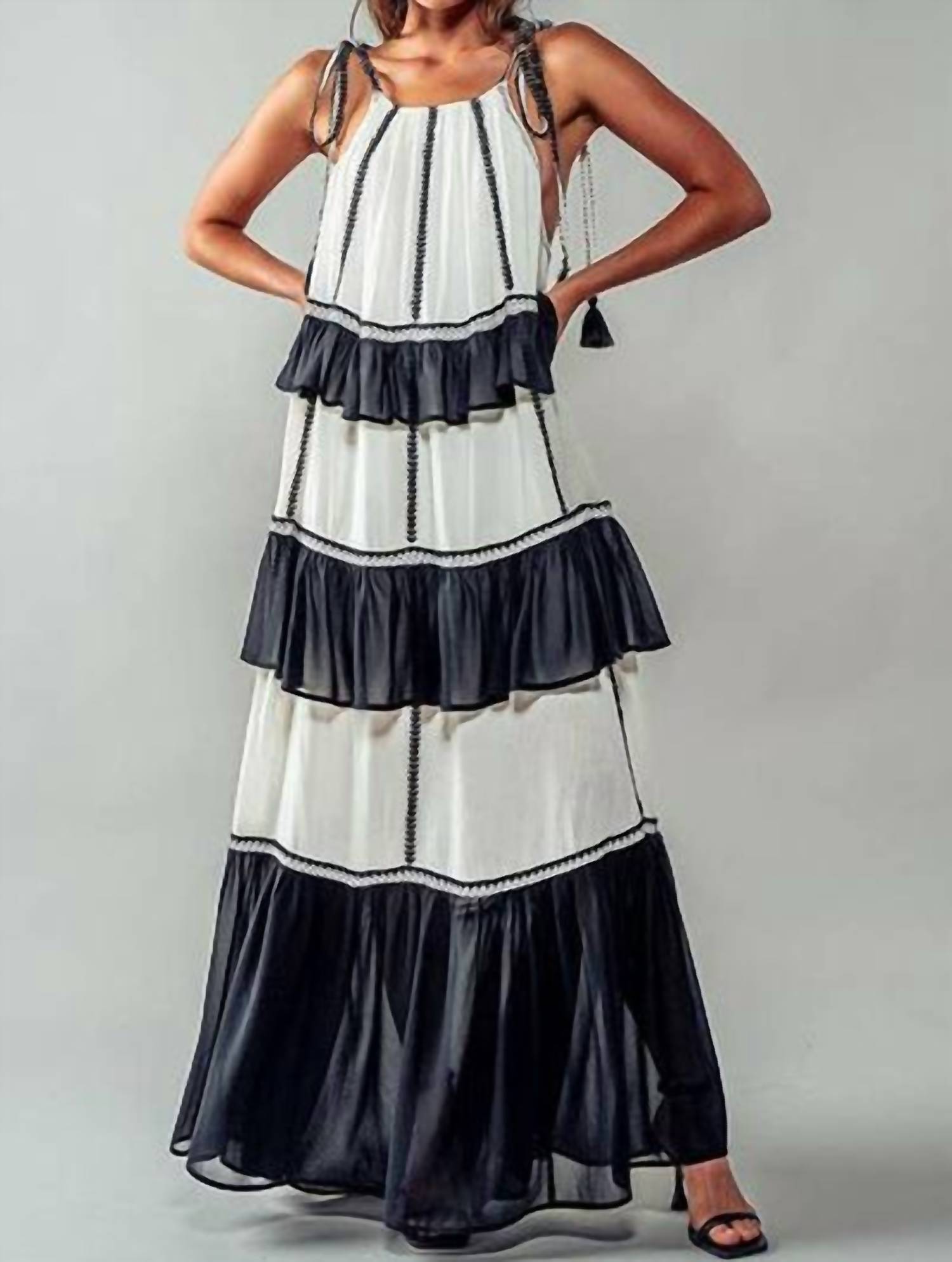 Style this maxi with your favorite statement necklace and sandals for the perfect look. Discover the Embroidered Tiered Silk Chiffon Maxi Dress by Urban Daizy, perfect for a boho chic summer vacation. Featuring delicate spaghetti straps, this dress is made from 100% Rayon and offers a flowy shift silhouette that exudes effortless elegance. Originating from China, it comes in a sophisticated black and ivory solid pattern with a scoop neck and a convenient tie closure. This maxi dress is designed for women who adore a carefree yet stylish look.