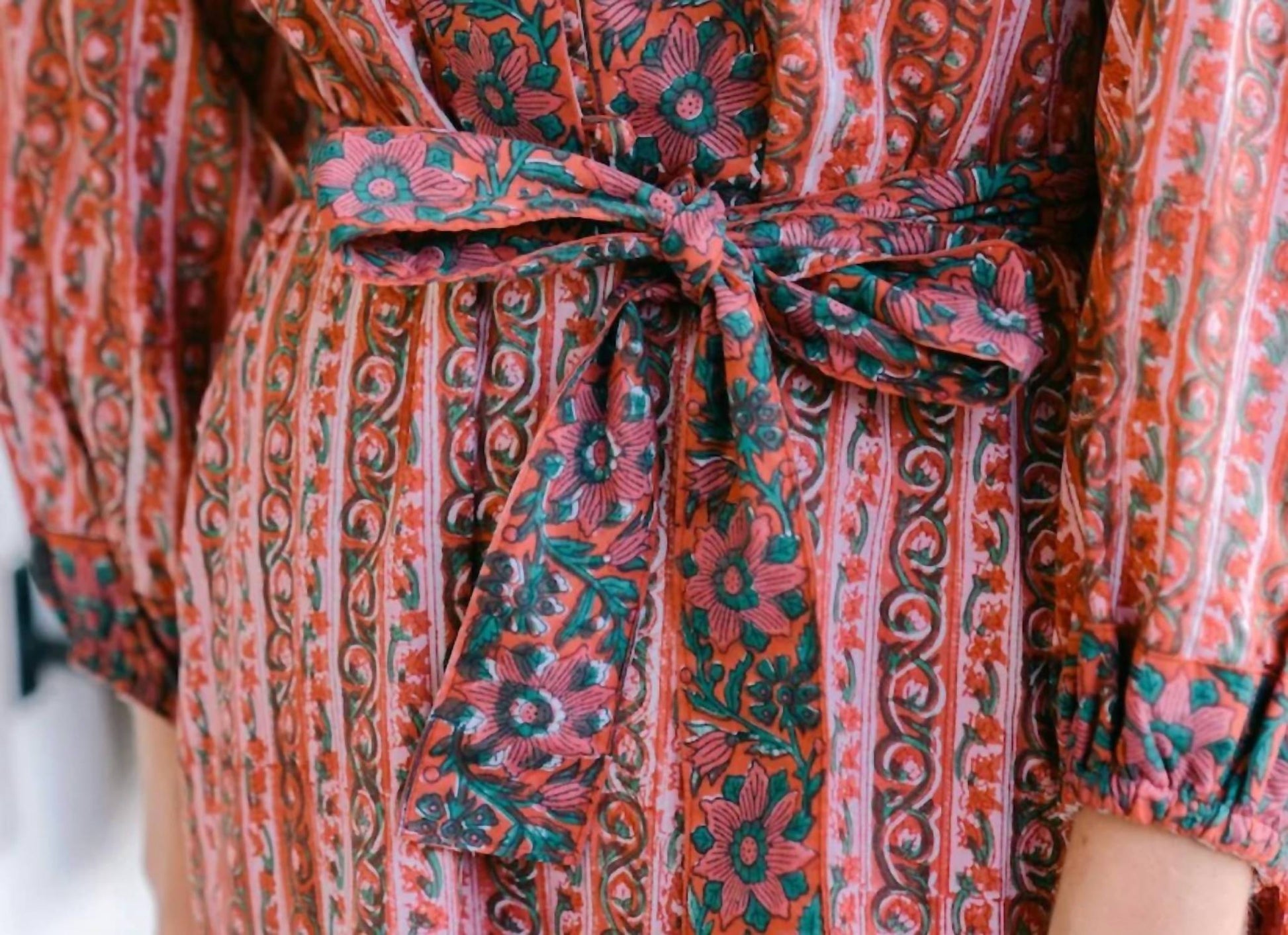 A maxi dress that is just as cute as it is comfortable. Presenting the Folly Maxi Long Sleeve Dress by VICTORIA DUNN, a stunning piece in vibrant cranberry designed for a chic holiday party look. Crafted from 100% cotton, this maxi-length dress features intricate contrasting prints and a relaxed silhouette with a self-tie belt for a flattering fit. Hand-crafted by artisans in Jaipur, India, it offers convenient button closure and practical pockets. Care instructions advise hand wash only to maintain its exquisite detail.