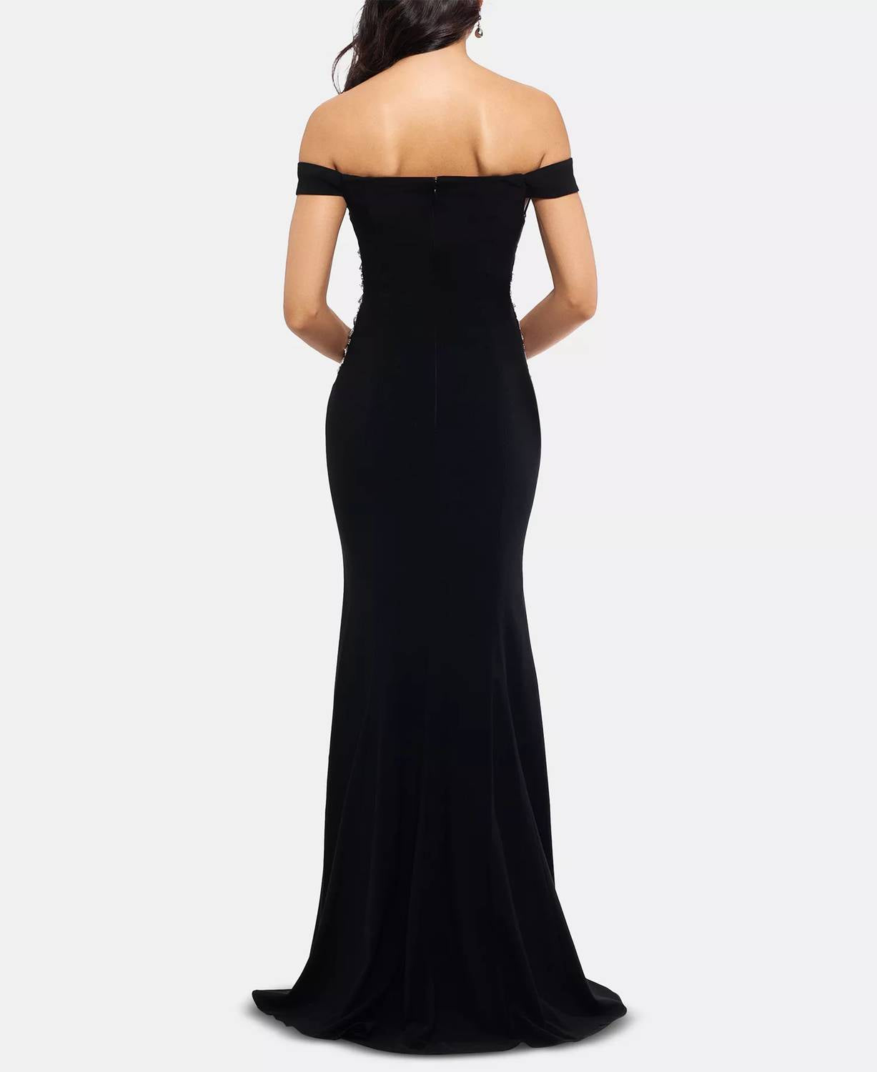 Style this maxi with your favorite statement necklace and sandals for the perfect look. The Xscape Off-the-shoulder Gown is the perfect choice for a sophisticated holiday party look. This A-line maxi dress in a solid black hue is crafted from polyester, featuring a chic off-the-shoulder neckline and short sleeves. Suitable for a range of occasions, this dress merges elegance with comfort. Care instructions are simple: machine wash and lay flat to dry.