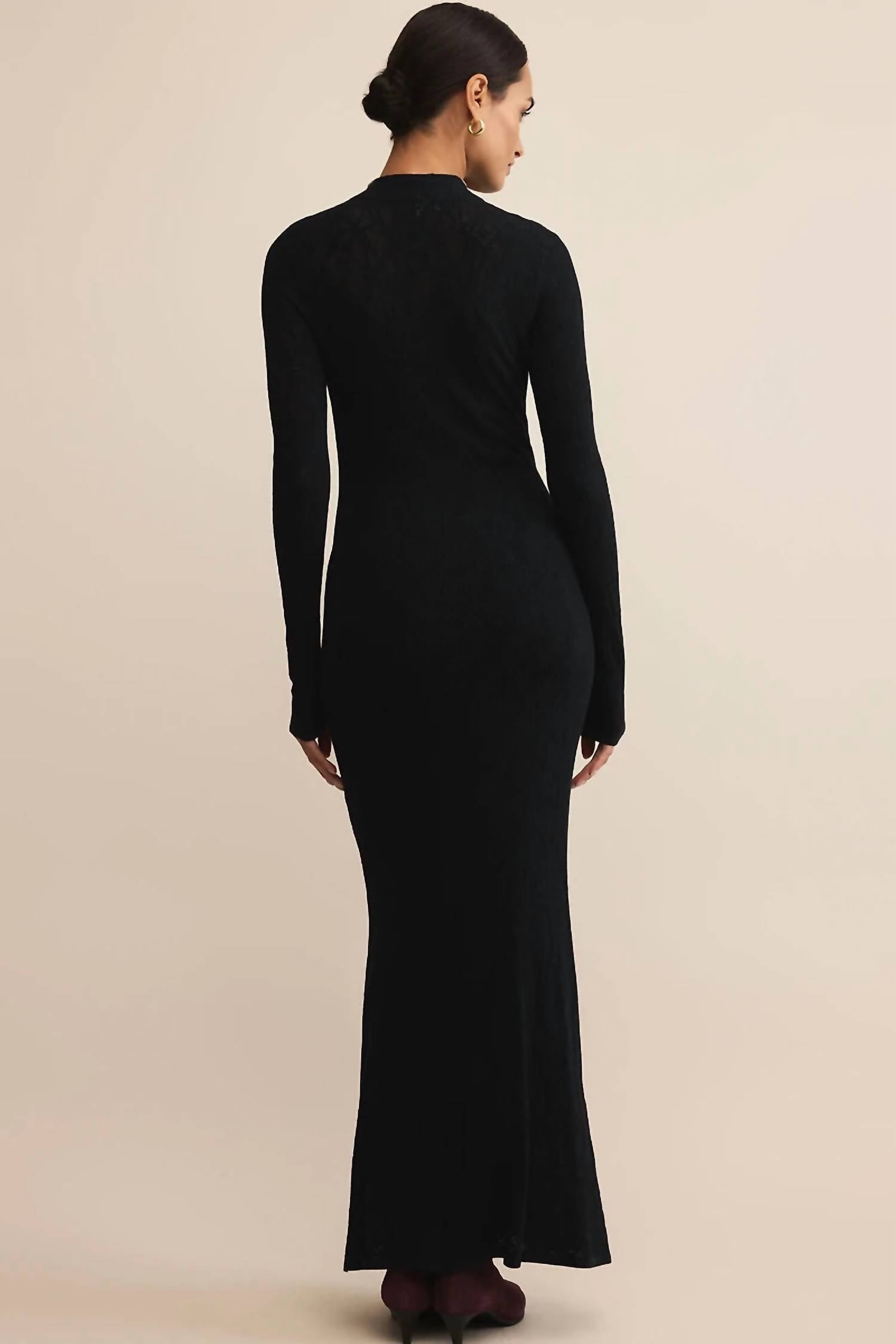 A maxi dress that is just as cute as it is comfortable. The Aden Mesh Sweater Dress by Z Supply in black offers a maximalist touch with its playful mock neck and long sleeves. Crafted from a viscose blend containing 74% viscose and 26% nylon, this mermaid silhouette maxi dress provides a fitted, breathable design. Its pull-on closure and elegant 50 3/4" shoulder-to-hem length ensure sophisticated style for a holiday party or a day-to-night transition. Care instructions include hand washing and line drying for longevity.