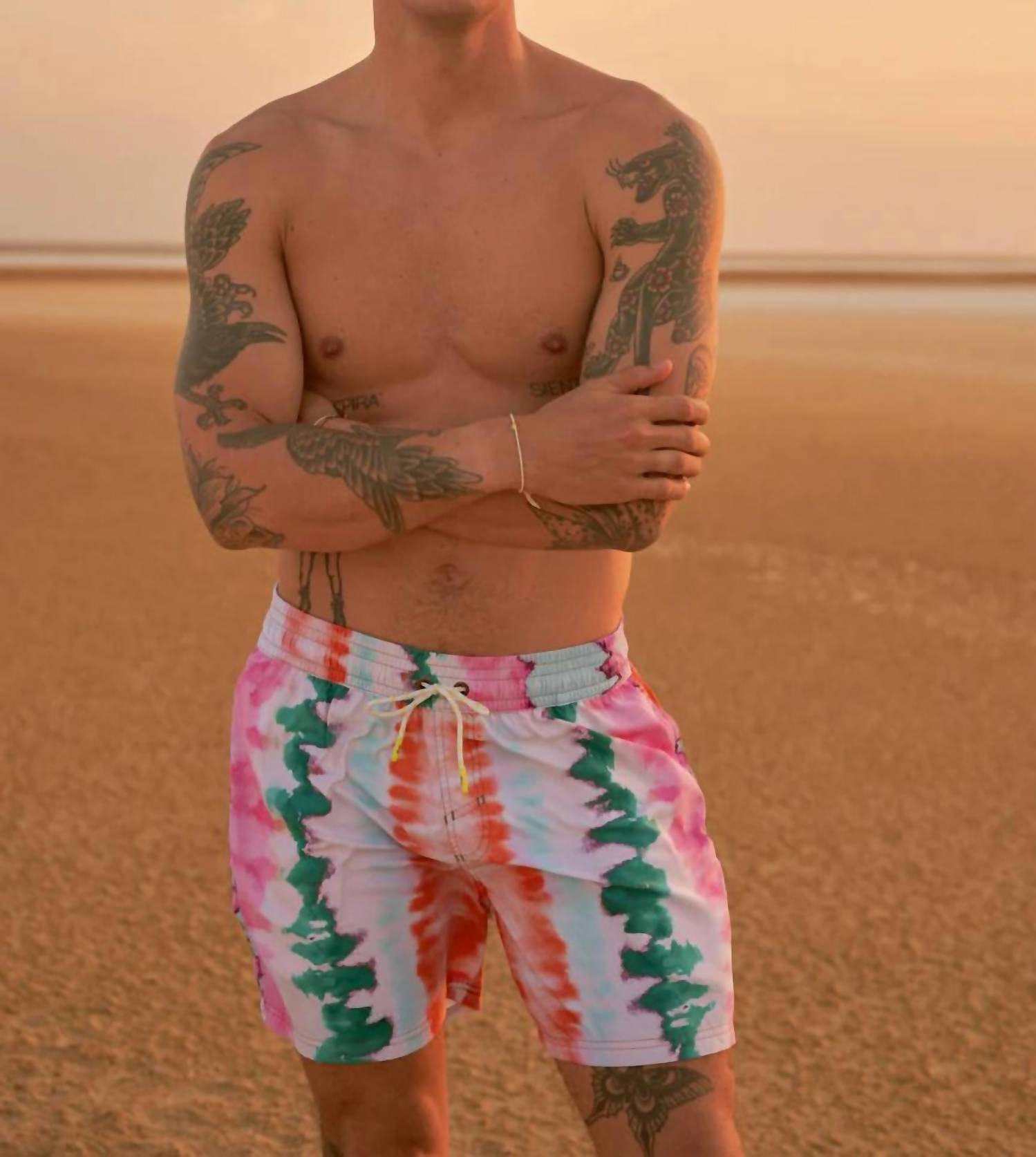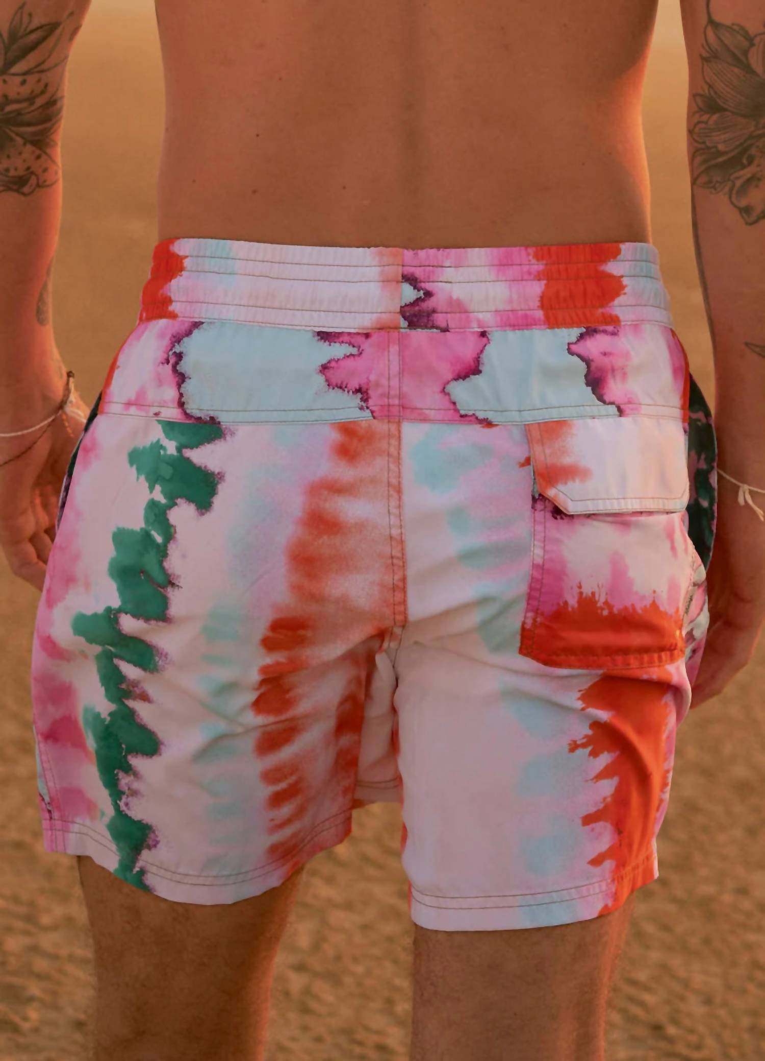 Perfect for beach days. Mid-rise board shorts feature an elastic waist with an adjustable drawstring, side and back pockets, and an interior mesh brief for added comfort. Made in Colombia. Crafted from 100% Polyester Woven premium microfiber, ensuring a soft touch and quick-dry technology to keep you comfortable in warm weather. Care for these stylish pink tie-dye shorts by hand washing, making them a go-to choice for summer adventures. Model is wearing size medium.