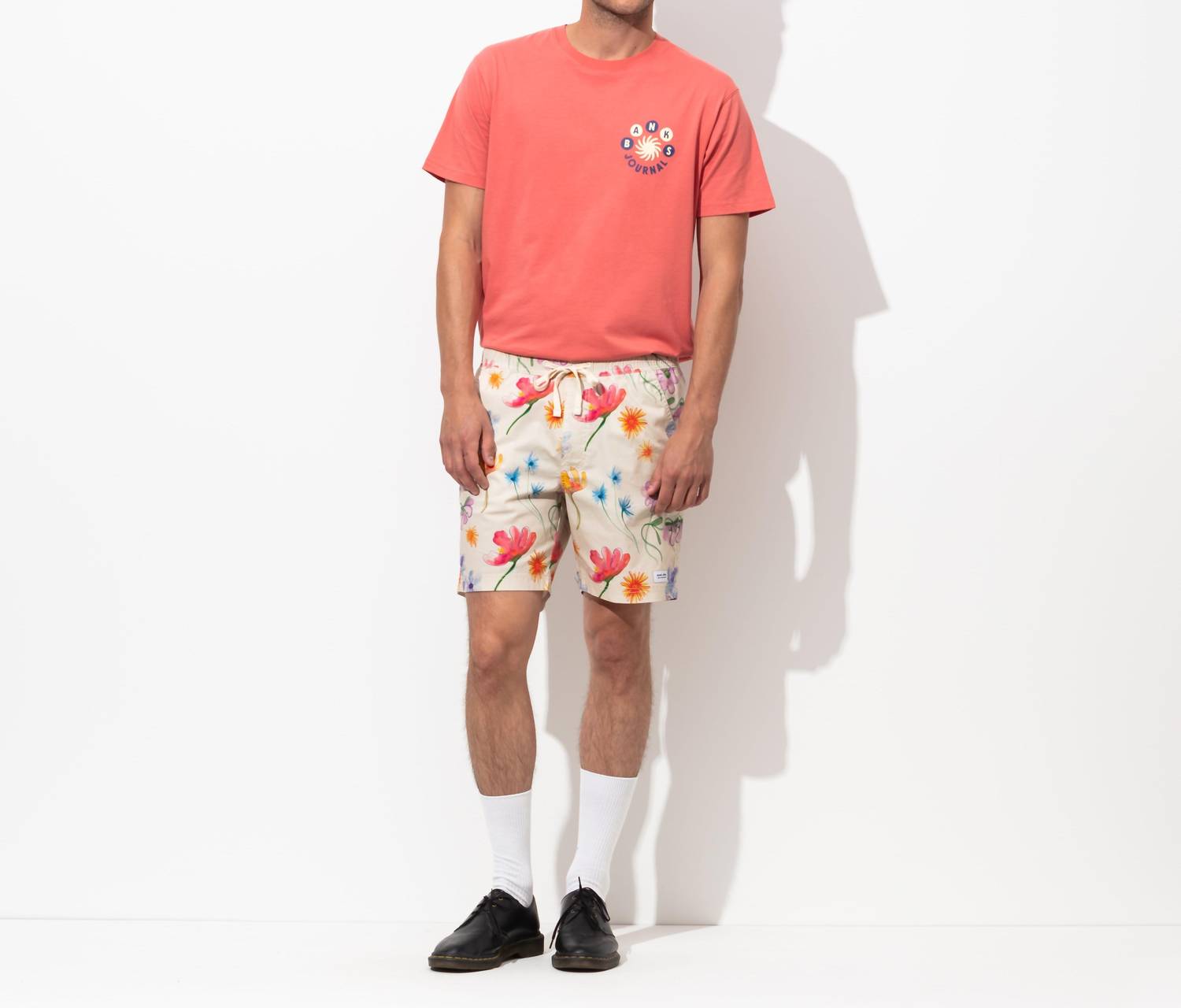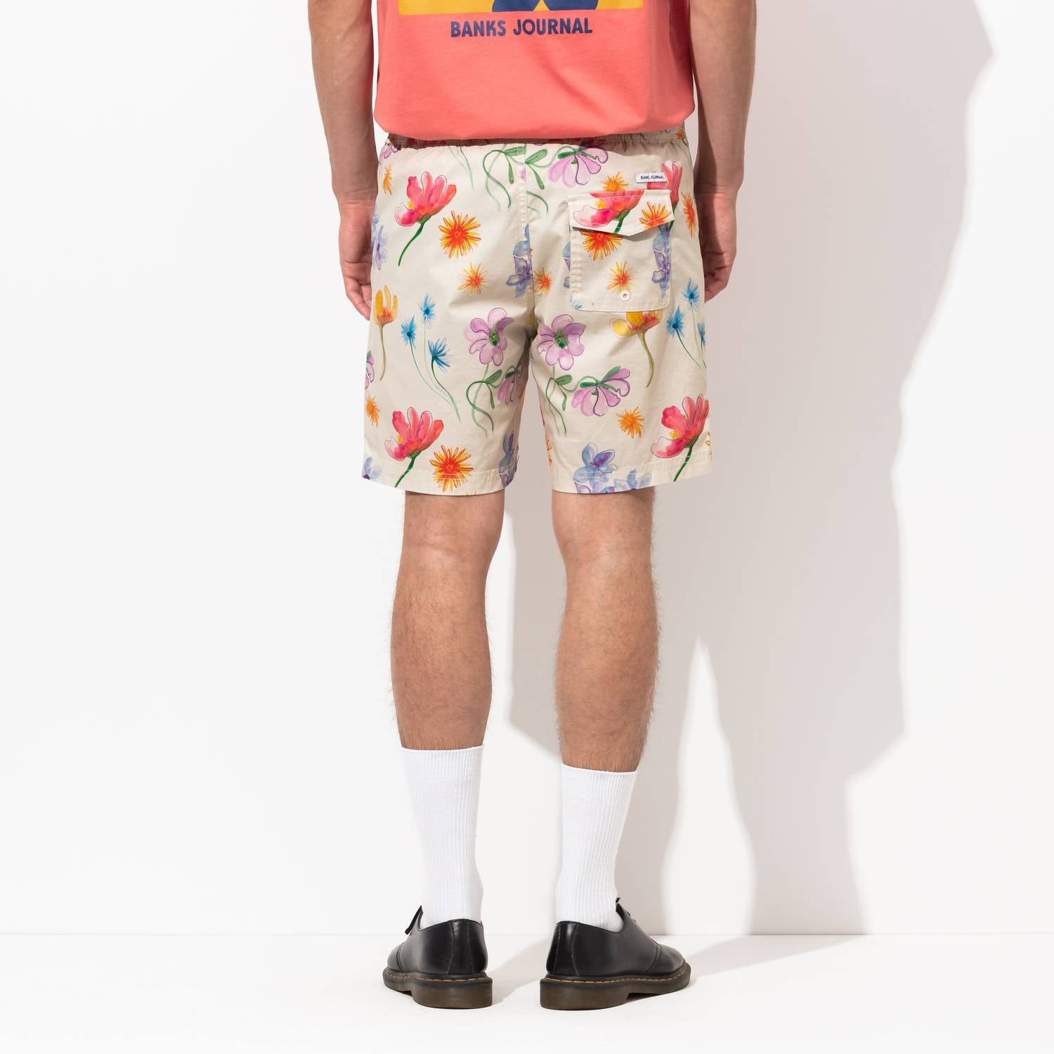 Dive into summer style with the Banks Journal Fluer Elastic Boardshort, crafted in a bone color and showcasing a vibrant floral pattern. These board shorts feature a convenient 17-inch outseam, combining comfort with a trendy maximalist design. The elastic waistband is complemented by a cotton drawcord, while practical mesh and back patch pockets provide ample storage. Made from a cotton blend and finished with recycled polyester woven labels, these shorts are ideal for beach days. Care: Hand wash.