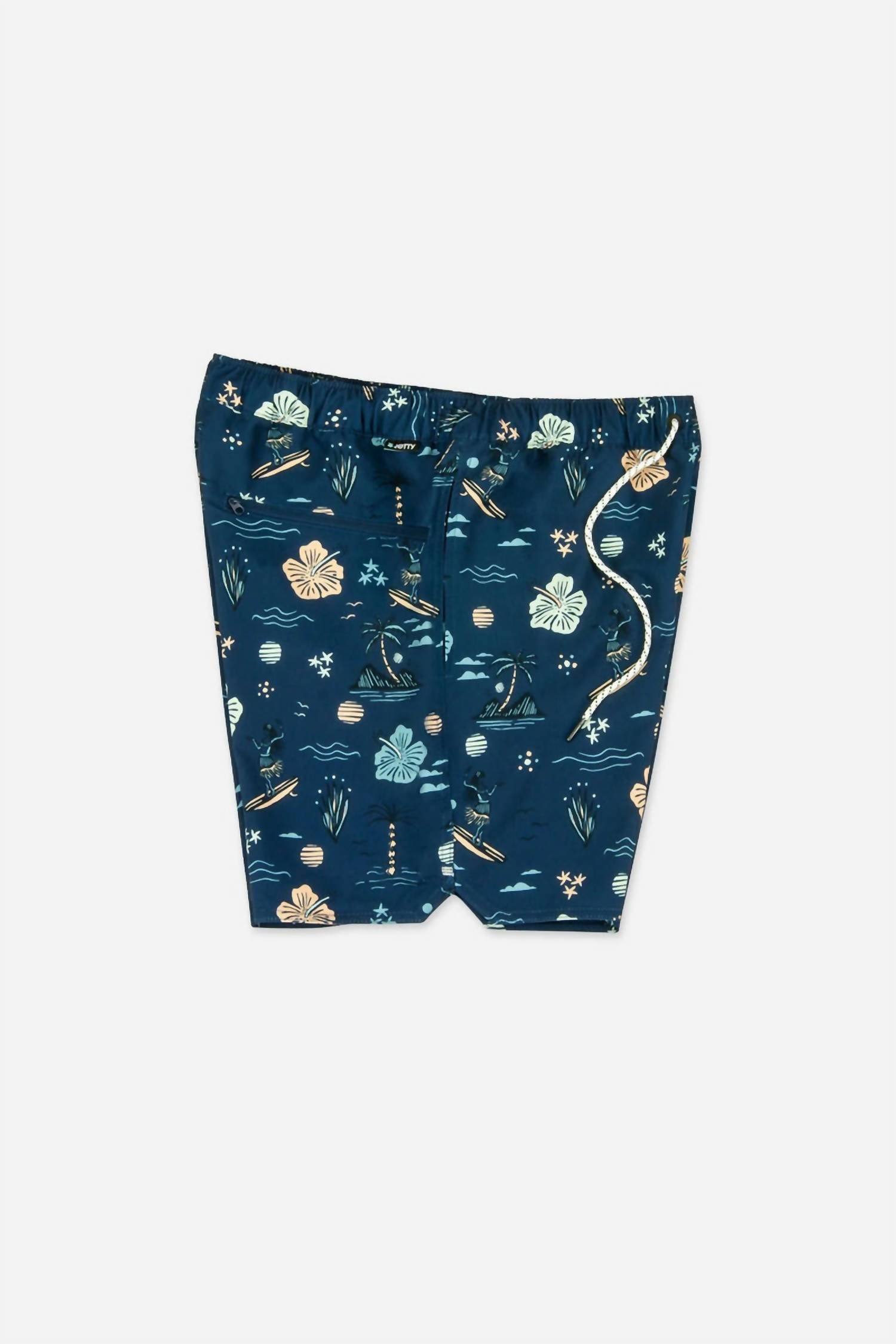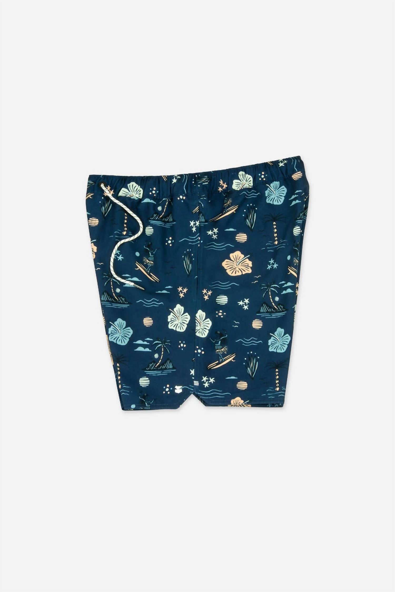 Introducing the Men's Bayside Poolshort by Jetty, a stylish nod to the classic 70's baggies with a modern twist. These Navy swim trunks feature an elastic waist with a drawcord for a comfortable fit and a 6" inseam for optimal coverage. Crafted from 90% recycled polyester and 10% spandex, they offer exceptional 360° stretch for all-day comfort by the poolside. Perfect for a summer beach day, these full coverage swim trunks combine athleisure trends with practicality.