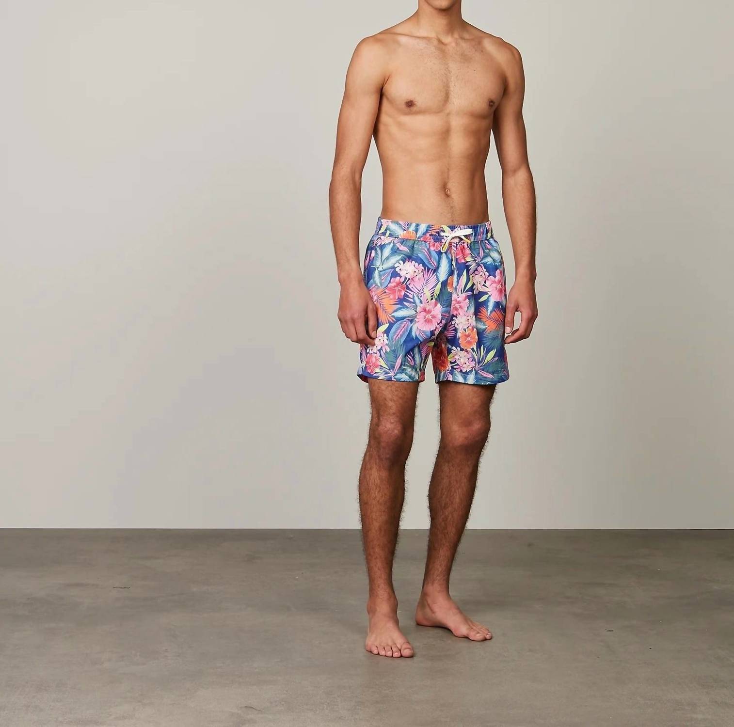 Meet the Hibiscus Print Swim Shorts by Hartford, a summer staple in rich royal blue. Designed for a comfortable fit, these men's board shorts feature an elastic waistband with drawstrings, and include both side and back pockets. Made from 100% nylon, they are printed with a vibrant floral pattern that is perfect for sunny beach days. Care for these timeless swim bottoms with a simple hand wash.