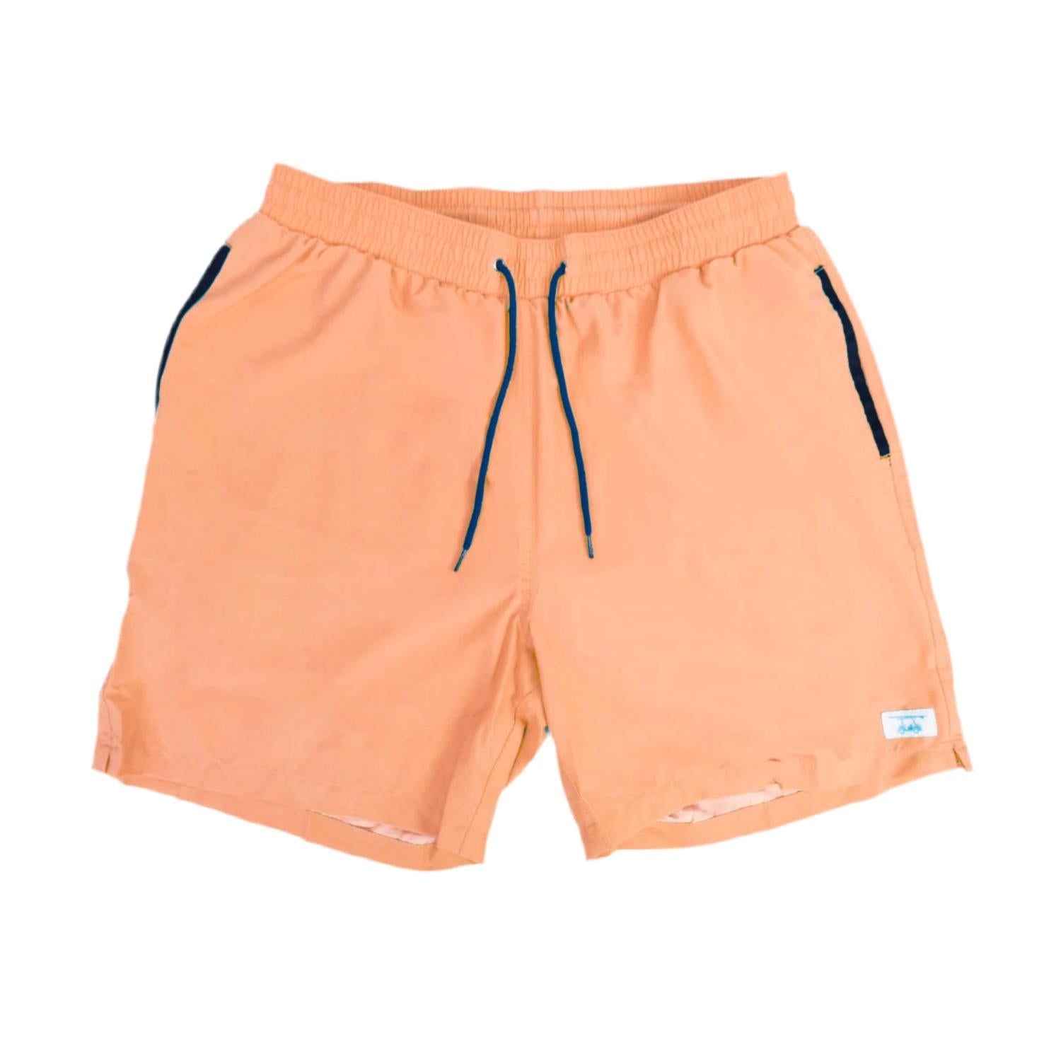 Introducing the Bald Head Blues Men's Swim Shorts Trunks in a refreshing peach hue, tailored for style and performance. These patterned board shorts are made from a durable polyester spandex blend, featuring a quick-dry material with a performance biker short underneath for added comfort. With a practical 6.5-inch inseam, a drawstring closure for a personalized fit, and a zippered back pocket for secure storage, they are perfect for any water adventure. Care instructions include line drying for best results.