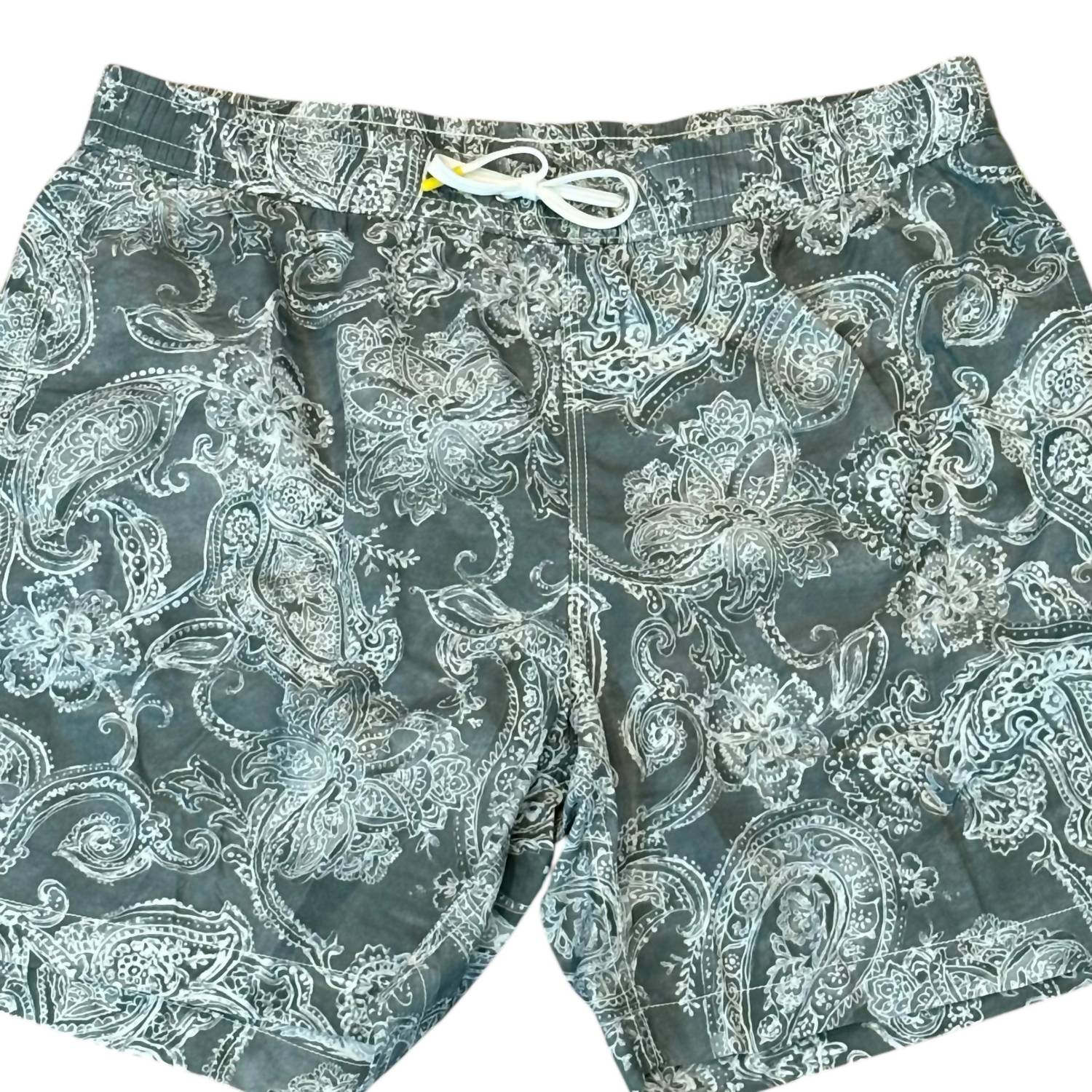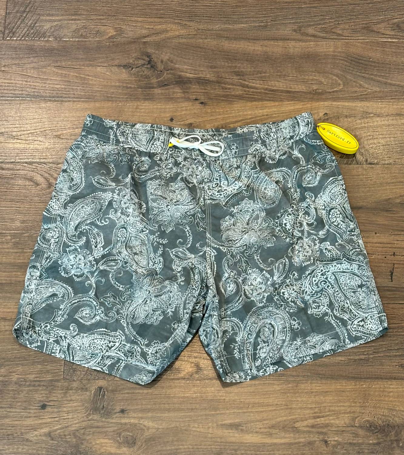 Introducing the Men's Army Swim Short by Hartford, perfect for a beach day with its boho chic paisley pattern and functional design. These mid-length swim trunks are crafted from 100% nylon, a lightweight 'parachute' style recycled fabric known for its quick-drying properties. Made in Morocco, they feature an adjustable elastic waistband with a drawstring, side pockets, and a back pocket for convenience. Care instructions include hand washing, line drying, and ironing with a cold iron, while avoiding bleaching, tumble drying, and professional dry cleaning.