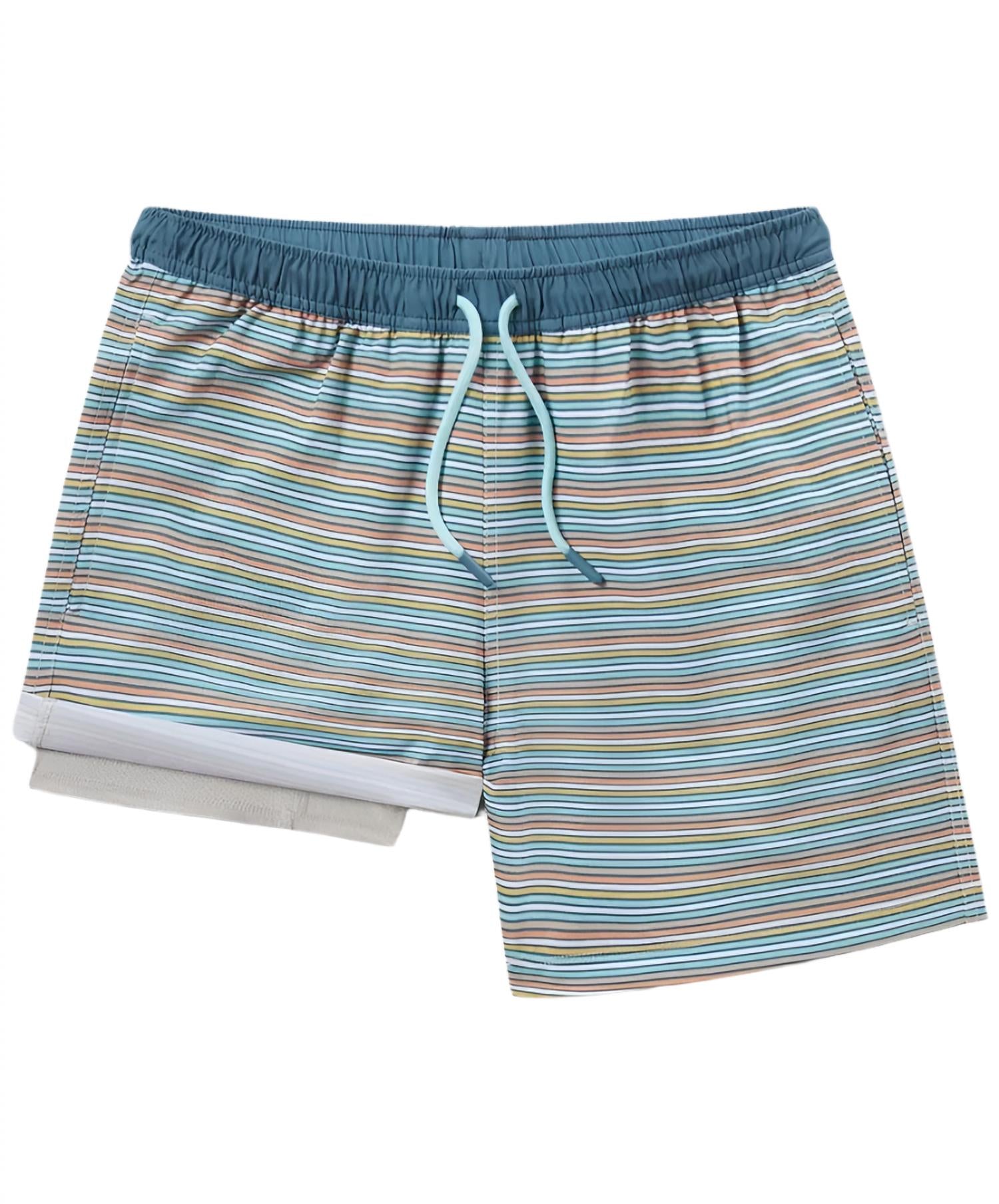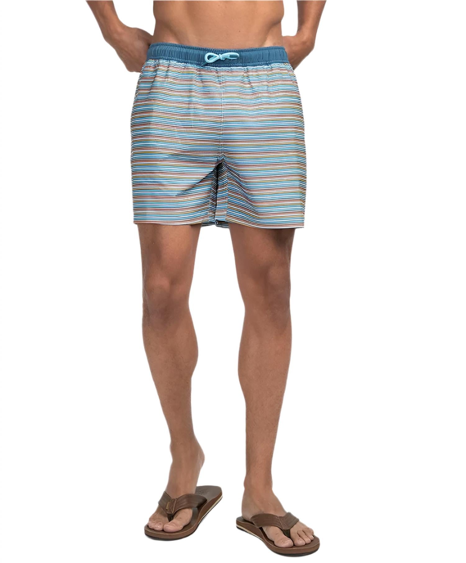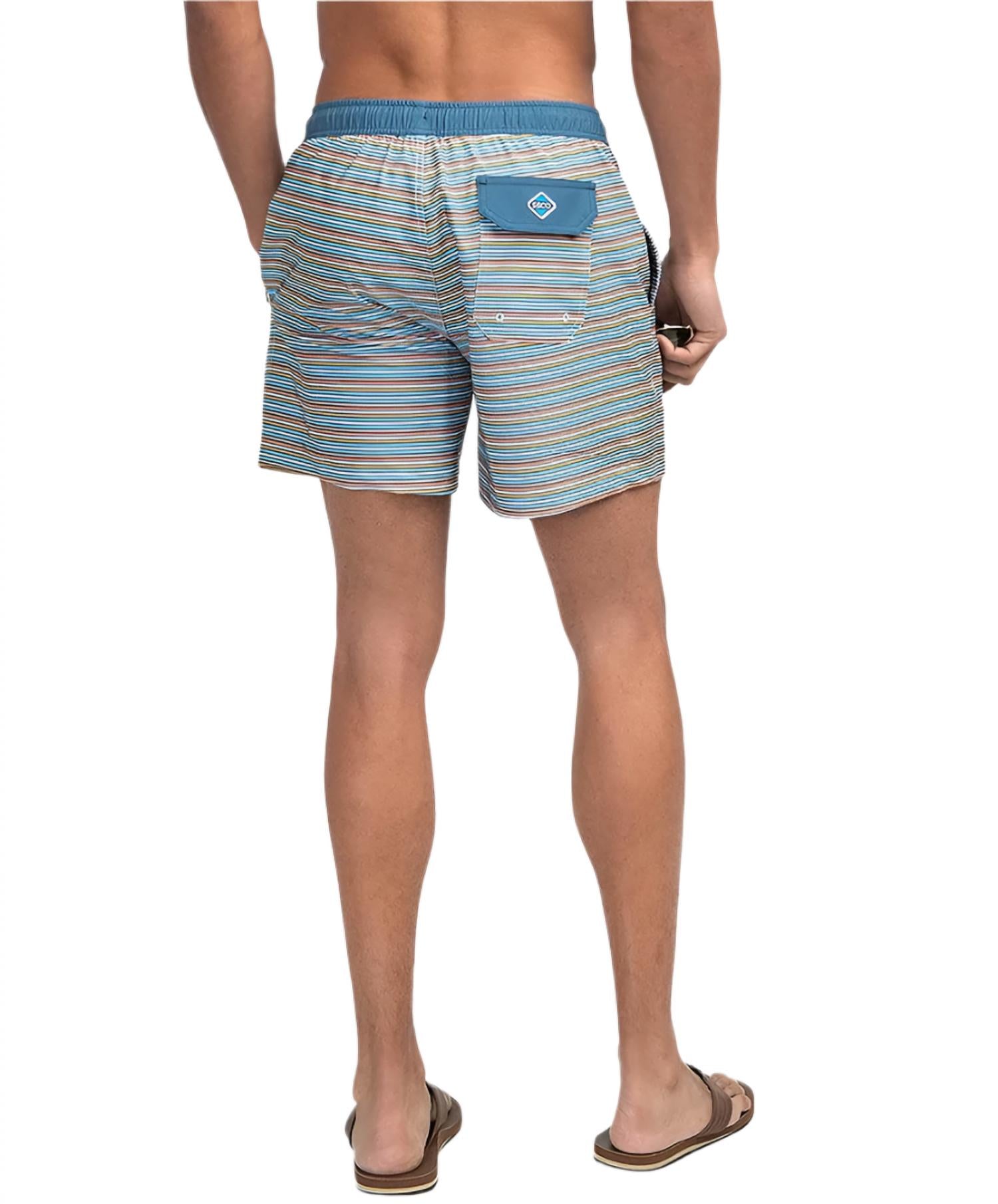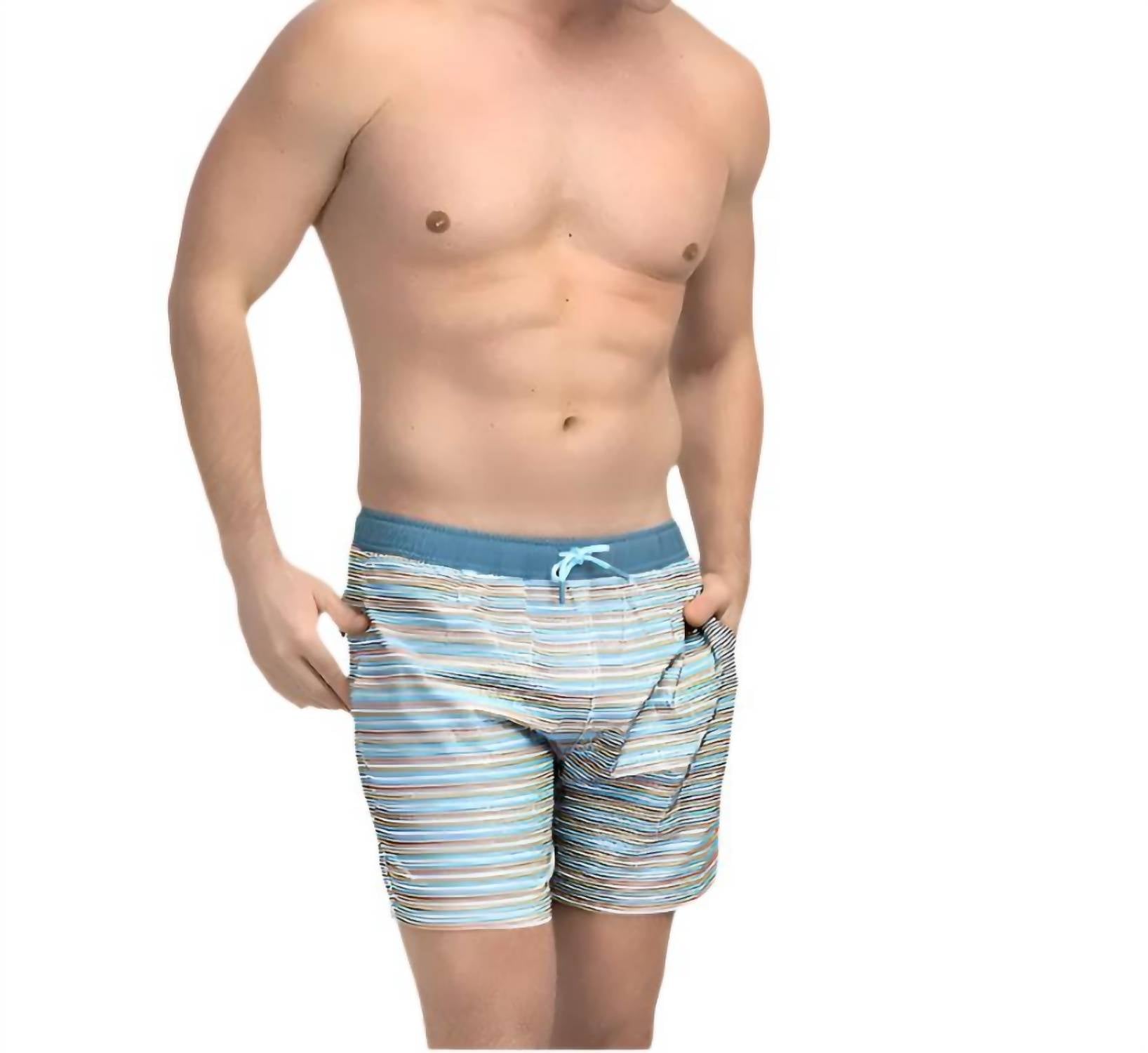 Stay stylish and comfortable at the beach with the Southern Shirt Company Pull On Swim Shorts in Sandbar Stripe. These men's swim trunks are made with 91% Polyester and 9% Spandex, offering a 4-way stretch for optimal movement. They feature an elastic waistband with a drawstring, on-seam side pockets, a back right pocket, and a side hidden zipper pocket for practicality. The inner compression short liner and 5.5-inch inseam ensure full coverage and comfort.