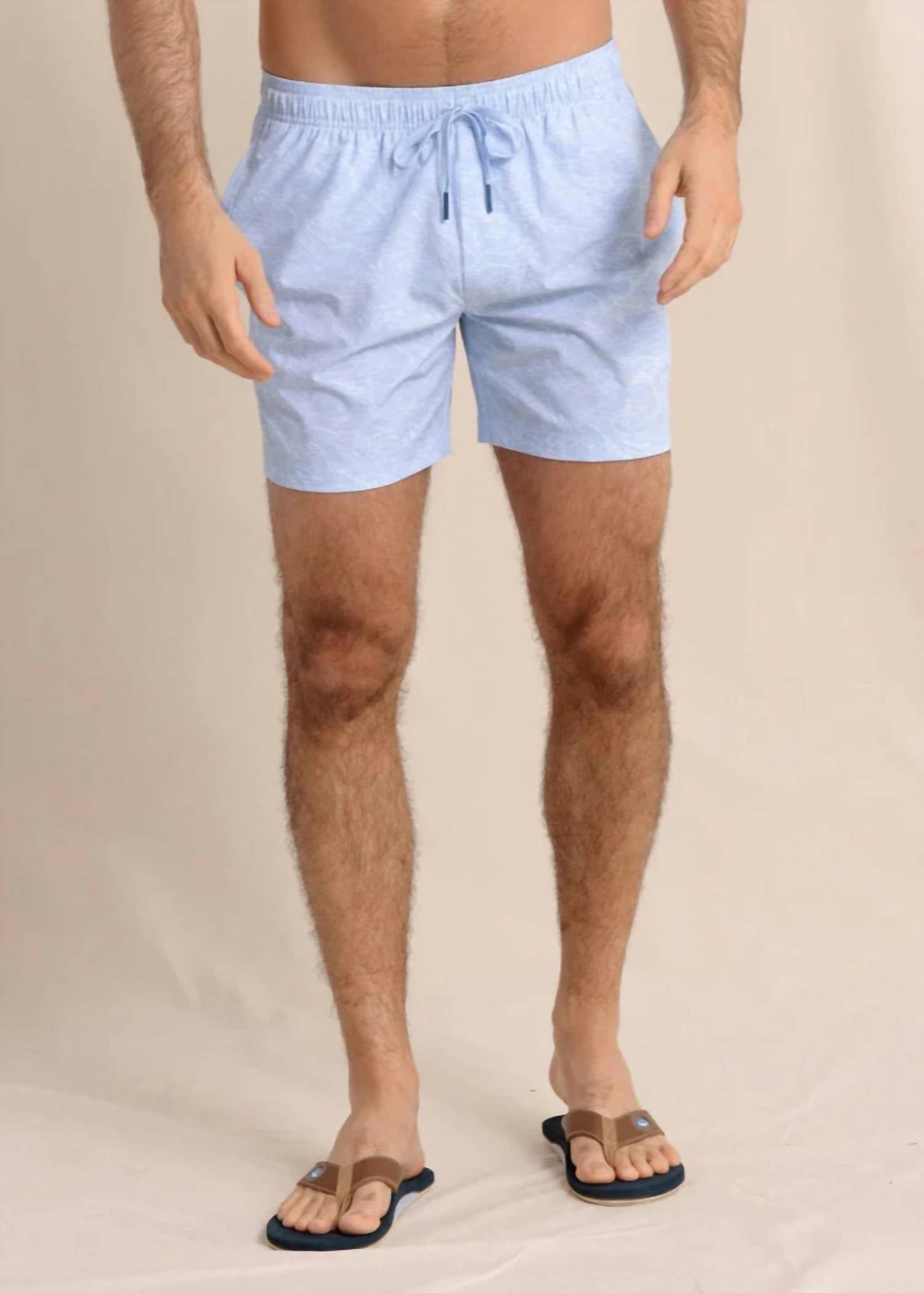 Dive into summer with the Men's Shark Bait Swim Trunk by Southern Tide, the perfect addition to your warm-weather wardrobe. These cerulean blue trunks, featuring a 6" inseam, offer stylish comfort with a fully elasticated waistband and a micro-mesh brief liner for ease of movement. Crafted from a blend of 52% Polyester, 38% Recycled Polyester, and 10% Spandex, these board shorts deliver 4-way stretch, UV protection, and water repellency. They include practical details like front on-seam pockets, a secure back zipper pocket, and a flat drawcord with a rubber aglet. Care: Machine wash, tumble dry.